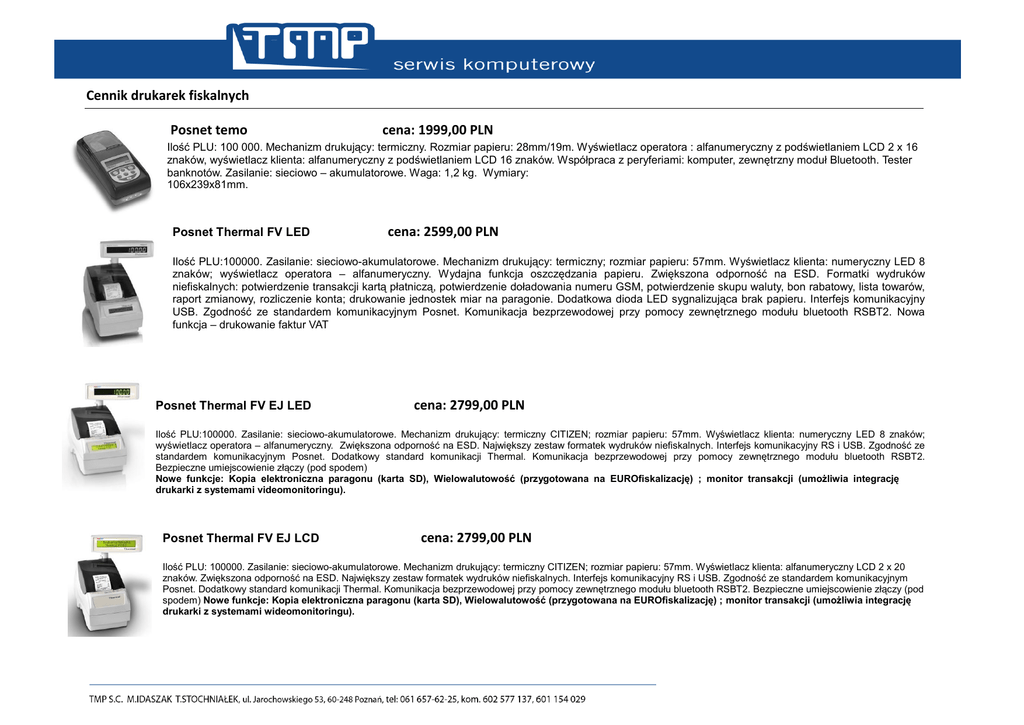 Cennik drukarek fiskalnych Posnet temo cena: 1999,00 PLN cena