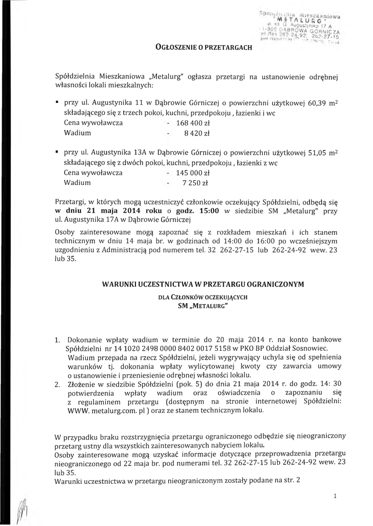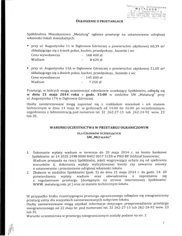 O g ł o s z e n ie o przetarg ach Spółdzielnia Mieszkaniowa „Metalurg" ogłasza przetargi na ustanowienie odrębnej własności lokali mieszkalnych: ■ przy ul. Augustynika 11 w Dąbrowie Górniczej o powierzchni użytkowej 6 0 ,3 9 m2 składającego się z trzech pokoi, kuchni, przedpokoju , łazienki i wc Cena wywoławcza 1 6 8 4 0 0 zł Wadium 8 4 2 0 zł ■ przy ul. Augustynika 13A w Dąbrowie Górniczej o powierzchni użytkowej 5 1 ,0 5 m2 składającego się z dwóch pokoi, kuchni, p rzedpo koju , łazienki z wc Cena wywoławcza 1 45 0 0 0 zł Wadium 7 2 5 0 zł Przetargi, w których mogą uczestniczyć członkowie oczekujący Spółdzielni, odbędą się w dniu 2 1 m aja 2 0 1 4 rok u o godz. 1 5 :0 0 w siedzibie SM „Metalurg” przy ul. Augustynika 17A w Dąbrowie Górniczej Osoby zainteresow ane mogą zapoznać się z rozkładem mieszkań i ich stanem technicznym w dniu 14 maja br. w godzinach od 1 4 :0 0 do 1 6 :0 0 po wcześniejszym uzgodnieniu z Administracją pod num erem tel. 32 2 6 2 - 2 7 - 1 5 lub 2 6 2 - 2 4 - 9 2 we w. 23 lub 35. WARUNKI UCZESTNICTWA W PRZETARGU OGRANICZONYM d la Czło n k ó w o c z e k u ją c y c h SM „ M e t a l u r g " 1. 2. Dokonanie wpłaty wadium w term inie do 20 maja 2 0 1 4 r. na konto bankowe Spółdzielni nr 14 1 0 2 0 2 4 9 8 0 0 0 0 8 4 0 2 0 0 1 7 5 1 5 8 w PKO BP Oddział Sosnowiec. Wadium przepada na rzecz Spółdzielni, jeżeli wygrywający uchyla się od spełnienia warunków tj. dokonania wpłaty wylicytowanej kwoty czy zawarcia umowy o ustanowienie i przeniesienie odrębnej własności lokalu. Złożenie w siedzibie Spółdzielni (pok. 5) do dnia 21 maja 2 0 1 4 r. do godz. 14: 30 potwierdzenia wpłaty wadium oraz oświadczenia o zapoznaniu się z regulaminem przetargu (dostępnym na stronie internetow ej Spółdzielni: W W W .metalurg.com. p l ) oraz ze stanem technicznym lokalu. W przypadku braku rozstrzygnięcia przetargu ograniczonego odbędzie się nieograniczony przetarg ustny dla wszystkich zainteresowanych nabyciem lokalu. Osoby zainteresow ane mogą uzyskać informacje dotyczące przeprowadzenia przetargu nieograniczonego od 22 maja br. pod numerami tel. 32 2 6 2 - 2 7 - 1 5 lub 2 6 2 - 2 4 - 9 2 wew. 23 lub 35. Warunki uczestnictwa w przetargu nieograniczonym zostały podane na str. 2 i WARUNKI UCZESTNICTWA W PRZETARGU NIEOGRANICZONYM DLA WSZYSTKICH ZAINTERESOWANYCH W przypadku braku rozstrzygnięcia przetargu ograniczonego w dniu 2 7 m aja br. o godz. 1 4 : 0 0 odbędzie się w siedzibie SM „Metalurg" przy ul. Augustynika 17A w Dąbrowie Górniczej Warunki finansowe dotyczące ceny wywołania oraz wysokości wadium podane w przetargu ograniczonym (str. 1) będą obowiązujące dla przystępujących do przetargu nieograniczonego. W aru n k i p rz y stą p ie n ia do p rz e ta rg u n ieo g ran iczo n eg o : 1. Dokonanie w płaty wadium w term inie do 26 maja 2 0 1 4 r. na konto bankowe Spółdzielni nr 14 1 0 2 0 2 4 9 8 0 0 0 0 8 4 0 2 0 0 1 7 5 1 5 8 w PKO BP Oddział Sosnowiec. Wadium przepada na rzecz Spółdzielni, jeżeli wygrywający uchyla się od spełnienia warunków tj. dokonania wpłaty wylicytowanej kwoty czy zawarcia umowy o ustanowienie i przeniesienie odrębnej własności lokalu. 2. Złożenia w siedzibie Spółdzielni (pok. 5) do dnia 27 maja 2 0 1 4 roku r. do godz,13:00 potwierdzenia wpłaty wadium oraz oświadczenia o zapoznaniu się z regulaminem przetargu (dostępnym na stronie internetow ej Spółdzielni: WWW.metalurg.com.pl) oraz ze stanem technicznym lokalu. S p ółd zieln ia z a s trz e g a sob ie p ra w o zam k n ięcia p rz e ta rg u bez d o k o n an ia w yboru. 2