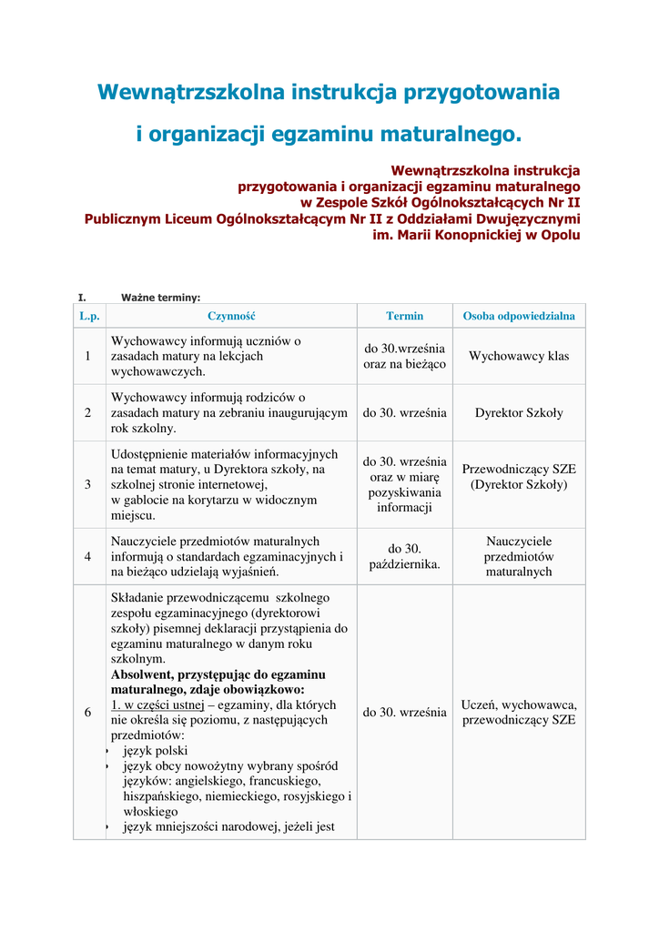 Wewnątrzszkolna instrukcja przygotowania i organizacji egzaminu maturalnego. Wewnątrzszkolna instrukcja przygotowania i organizacji egzaminu maturalnego w Zespole Szkół Ogólnokształcących Nr II Publicznym Liceum Ogólnokształcącym Nr II z Oddziałami Dwujęzycznymi im. Marii Konopnickiej w Opolu I. L.p. Ważne terminy: Czynność Termin Osoba odpowiedzialna 1 Wychowawcy informują uczniów o zasadach matury na lekcjach wychowawczych. do 30.września oraz na bieżąco Wychowawcy klas 2 Wychowawcy informują rodziców o zasadach matury na zebraniu inaugurującym rok szkolny. do 30. września Dyrektor Szkoły 3 Udostępnienie materiałów informacyjnych na temat matury, u Dyrektora szkoły, na szkolnej stronie internetowej, w gablocie na korytarzu w widocznym miejscu. do 30. września oraz w miarę pozyskiwania informacji 4 Nauczyciele przedmiotów maturalnych informują o standardach egzaminacyjnych i na bieżąco udzielają wyjaśnień. do 30. października. Składanie przewodniczącemu szkolnego zespołu egzaminacyjnego (dyrektorowi szkoły) pisemnej deklaracji przystąpienia do egzaminu maturalnego w danym roku szkolnym. Absolwent, przystępując do egzaminu maturalnego, zdaje obowiązkowo: 1. w części ustnej – egzaminy, dla których 6 do 30. września nie określa się poziomu, z następujących przedmiotów: • język polski • język obcy nowożytny wybrany spośród języków: angielskiego, francuskiego, hiszpańskiego, niemieckiego, rosyjskiego i włoskiego • język mniejszości narodowej, jeżeli jest Przewodniczący SZE (Dyrektor Szkoły) Nauczyciele przedmiotów maturalnych Uczeń, wychowawca, przewodniczący SZE uczniem szkoły lub oddziału z językiem nauczania mniejszości narodowej; uczeń szkoły lub oddziału z nauczaniem języka danej mniejszości narodowej nie może wybrać języka danej mniejszości narodowej na egzaminie maturalnym z języka obcego nowożytnego jako przedmiotu obowiązkowego 2. w części pisemnej – egzaminy na poziomie podstawowym z następujących przedmiotów: język polski matematyka język obcy nowożytny (ten sam, który zdaje w części ustnej) język mniejszości narodowej, jeżeli jest uczniem szkoły lub oddziału z językiem nauczania mniejszości narodowej; uczeń szkoły lub oddziału z nauczaniem języka danej mniejszości narodowej nie może wybrać języka danej mniejszości narodowej na egzaminie maturalnym z języka obcego nowożytnego jako przedmiotu obowiązkowego 3. w części pisemnej – jeden egzamin z przedmiotu dodatkowego na poziomie rozszerzonym lub – w przypadku języka obcego nowożytnego – na poziomie rozszerzonym albo dwujęzycznym. Wyboru dokonuje spośród następujących przedmiotów: biologia chemia filozofia fizyka geografia historia historia muzyki historia sztuki informatyka 10. język łaciński i kultura antyczna 11. język mniejszości etnicznej (język łemkowski) 12. język mniejszości narodowej (wybór spośród następujących języków: białoruski, litewski, niemiecki, ukraiński) 13. język obcy nowożytny (wybór spośród następujących języków: angielski, francuski, hiszpański, niemiecki, rosyjski, włoski) 14. język polski 15. język regionalny (język kaszubski) 16. matematyka 17. wiedza o społeczeństwie Uczeń może ponadto przystąpić w danym roku do egzaminu maturalnego z nie więcej niż pięciu kolejnych przedmiotów dodatkowych wybranych spośród pozostałych przedmiotów dodatkowych wymienionych powyżej. 7 Zdający, który ubiega się o prawo przystąpienia do egzaminu maturalnego w warunkach i formie dostosowanych do indywidualnych potrzeb psychofizycznych i edukacyjnych, składa dyrektorowi szkoły wniosek o dostosowanie egzaminu wraz z kserokopią opinii wydanej przez poradnię psychologiczno – pedagogiczną, zaświadczeniem lekarskim lub orzeczeniem o potrzebie indywidualnego nauczania. do 15. października uczeń 8 Ogłoszenie harmonogramu części pisemnej egzaminu, ogłoszonego przez dyrektora. w I semestrze Przewodniczący SZE (Dyrektor Szkoły) 9 Złożenie ostatecznych deklaracji maturalnych. do 5. lutego Przewodniczący SZE (Dyrektor Szkoły) 10 Przekazanie do OKE deklaracji wyboru przez uczniów przedmiotów do 15. lutego Przewodniczący SZE (Dyrektor Szkoły) 11 Powołanie przedmiotowych zespołów egzaminacyjnych . do 4. marca Przewodniczący SZE (Dyrektor Szkoły) 12 Powołanie zastępcy PSZE i pozostałych członków SZE . do 4. marca Przewodniczący SZE (Dyrektor Szkoły) 13 Przekazanie uczniom treści komunikatu dyrektora CKE dotyczącego pomocy, z jakich mogą korzystać zdający w części pisemnej egzaminu z poszczególnych przedmiotów oraz ustaleń o zasadach korzystania z tych pomocy. do 4. marca Przewodniczący SZE (Dyrektor Szkoły) 14 Ogłoszenie harmonogramu części ustnej egzaminu i przesłanie go niezwłocznie dyrektorowi OKE. do 4. marca Przewodniczący SZE (Dyrektor Szkoły) 15 Powołanie zespołów nadzorujących przebieg egzaminu pisemnego. do 4. marca Przewodniczący SZE (Dyrektor Szkoły) 16 Dyrektor szkoły szkoli radę pedagogiczną zakresie procedury egzaminu maturalnego oraz stosowania wewnątrzszkolnej instrukcja przygotowania i organizacji egzaminu maturalnego w sesji wiosennej danego roku szkolnego. przełom marca i kwietnia Przewodniczący SZE (Dyrektor Szkoły) 17 Laureaci i finaliści olimpiad przedmiotowych, którzy ubiegają się o zwolnienie z egzaminu z danego przedmiotu, przedstawiają przewodniczącemu szkolnego zespołu egzaminacyjnego (dyrektorowi szkoły) zaświadczenie o uzyskaniu tytułu laureata lub finalisty olimpiady, na podstawie, którego przewodniczący SZE stwierdza uprawnienie do zwolnienia z egzaminu. nie później niż dzień przed terminem egzaminu z danego przedmiotu uczeń 18 Zakończenie roku szkolnego w klasach maturalnych 29.04.2016 r. Przewodniczący SZE (Dyrektor Szkoły) 19 Rozpoczęcie egzaminów maturalnych 04.05.2016 r. Przewodniczący SZE (Dyrektor Szkoły) 20 Zakończenie egz