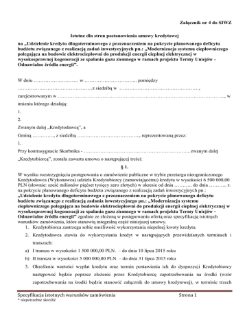 Załącznik nr 4 do SIWZ Istotne dla stron postanowienia umowy kredytowej na „Udzielenie kredytu długoterminowego z przeznaczeniem na pokrycie planowanego deficytu budżetu związanego z realizacją zadań inwestycyjnych pn.: „Modernizacja systemu ciepłowniczego polegająca na budowie elektrociepłowni do produkcji energii cieplnej elektrycznej w wysokosprawnej kogeneracji ze spalania gazu ziemnego w ramach projektu Termy Uniejów Odnawialne źródła energii”. W dniu ……………………… w ………………………….. pomiędzy ………………………………………z siedzibą w …………………………………………, zarejestrowanym w ……………………………………………………………………………………….., w imieniu którego działają: 1. 2. Zwanym dalej „Kredytodawcą”, a Gminą …………., z siedzibą ……………………………….., reprezentowaną przez: 1. Przy kontrasygnacie Skarbnika - ………………………………………………………, zwanym dalej „Kredytobiorcą”, została zawarta umowa o następującej treści: § 1. W wyniku rozstrzygnięcia postępowania o zamówienie publiczne w trybie przetargu nieograniczonego Kredytodawca (Wykonawca) udziela Kredytobiorcy (zamawiającemu) kredytu w wysokości 6 500 000,00 PLN (słownie: sześć milionów pięćset tysięcy zero złotych) w okresie od dnia ……….. do dnia ……….. r. na pokrycie planowanego deficytu budżetu związanego z realizacją zadań inwestycyjnych pn.: „Udzielenie kredytu długoterminowego z przeznaczeniem na pokrycie planowanego deficytu budżetu związanego z realizacją zadania inwestycyjnego pn.: „Modernizacja systemu ciepłowniczego polegająca na budowie elektrociepłowni do produkcji energii cieplnej elektrycznej w wysokosprawnej kogeneracji ze spalania gazu ziemnego w ramach projektu Termy Uniejów Odnawialne źródła energii” zgodnie ze złożoną w postępowaniu ofertą oraz specyfikacją istotnych warunków zamówienia, które stanowią integralną część niniejszej umowy. 1. Kredytobiorca zastrzega sobie możliwość wykorzystania niepełnej kwoty kredytu. 2. Kredytodawca stawia do wykorzystania kredyt w następujących przewidzianych terminach i transzach: a) I transza w wysokości 1 500 000,00 PLN. – do dnia 10 lipca 2015 roku b) II transza w wysokości 5 000 000,00 PLN. – do dnia 31 lipca 2015 roku 3. Określenie wartości wypłat kredytu oraz termin postawienia ich do dyspozycji Kredytobiorcy następować będzie poprzez złożenie przez Kredytobiorcę zapotrzebowania na środki (wzór zapotrzebowania na środki będzie stanowić załącznik do umowy kredytowej), w terminie trzech Specyfikacja istotnych warunków zamówienia * niepotrzebne skreślić Strona 1 dni od dnia złożenia zapotrzebowania. Kredytobiorca zastrzega sobie możliwość wypłaty pierwszej transzy kredytu w terminie dwóch dni od dnia podpisania umowy kredytu 4. Kwota nie wykorzystana w okresie postawienia do dyspozycji danej transzy może być wykorzystana przez Kredytobiorcę w okresie postawienia do dyspozycji następnej transzy. 5. Za niewykorzystanie kredytu w pełnej wysokości oraz możliwość wcześniejszej spłaty całości lub części kredytu Kredytobiorca nie będzie ponosił żadnych kosztów a odsetki od kredytu naliczone będą wyłącznie od faktycznie wykorzystanej kwoty kredytu. § 2. Kredytodawca zobowiązuje się przekazać - po uzyskaniu zabezpieczenia kredytowego określonego w § 6 ust. 1 niniejszej umowy, - na rachunek Kredytobiorcy w Banku ………………………….. nr ……………………………………… kwotę kredytu w wysokości i na warunkach określonych w § 1. § 3. 1. Kredyt oprocentowany jest według zmiennej stopy procentowej ustalanej w oparciu o stawkę WIBOR dla 1 miesięcznych złotowych depozytów międzybankowych wyliczonej jako średnia z ostatniego miesiąca poprzedzającego miesiąc za który naliczane jest oprocentowanie, powiększonej o ewentualną stałą marżę banku w wysokości …………% w stosunku rocznym. W dniu zawarcia niniejszej umowy ustala się oprocentowanie w wysokości ……………….% w stosunku rocznym. 2. Odsetki naliczane są od aktualnego zadłużenia za faktyczny okres jego występowania, tj. od dnia zarejestrowania a następnie do dnia kolejnych zmian salda do dnia poprzedzającego dzień każdorazowej spłaty. 3. Strony ustalają, że wszystkie elementy cenotwórcze poza bazą oprocentowania określoną w punkcie III podpunkt 3 litera i, SIWZ tj. stawka WIBOR 1M będą wielkościami stałymi na czas obowiązywania umowy i nie będą mogły podlegać negocjacji. 4. O zmianie oraz wysokości oprocentowania w każdym kolejnym okresie odsetkowym Kredytodawca będzie informował Kredytobiorcę na piśmie. § 4. 1. Kredytobiorca zobowiązuje się spłacać raty kapitałowe po okresie karencji w ratach miesięcznych od dnia 31.01.2016 roku do dnia 31.12.2020 roku. Raty odsetkowe Kredytobiorca zobowiązuje się spłacać w okresach miesięcznych od dnia 31 sierpnia 2015 roku. Kredytobiorca dokonuje spłaty kredytu na rachunek bankowy ……………………………………………………………………. . 2. Kredytobiorca jest zobowiązany spłacić kredyt w 60 miesięcznych ratach, płatnych w terminie do ostatniego dnia każdego miesiąca, przy czym raty kształtują się następująco: rok 2016 – pierwsza rata 112 000,00 zł, następne 11 rat każda po 108 000,00 zł; rok 2017 – 12 rat każda po 62 500,00 zł; Specyfikacja istotnych warunków zamówienia * niepotrzebne skreślić Strona 2 rok 2018 – pierwsza rata 130 000,00 zł, następne 11 rat każda po 120 000,00 zł; rok 2019 – pierwsza rata 131 000,00 zł, następne 11 rat każda po 129 000,00 zł; rok 2020 – pierwsza rata 130 000,00 zł, następne 11 rat każda po 120 000,00 zł. 3. Terminy i kwoty określa harmonogram spłat, który stanowi integra