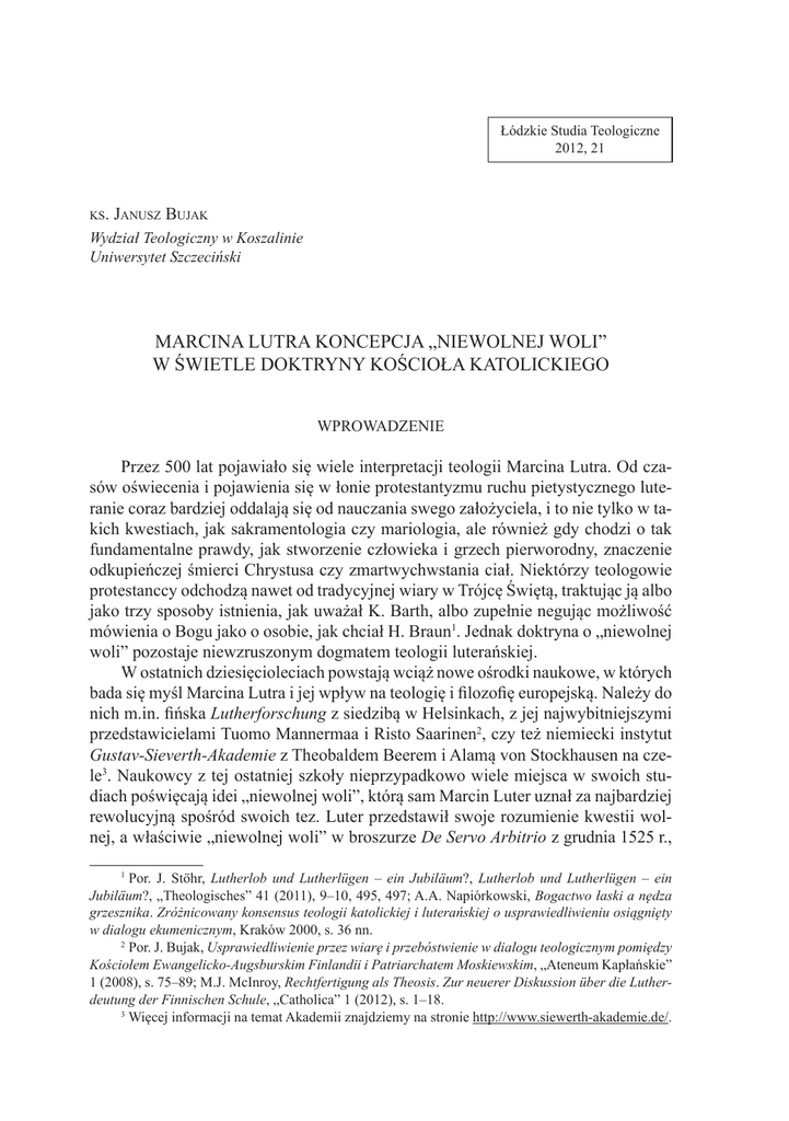 Łódzkie Studia Teologiczne 2012, 21 ks. Janusz Bujak Wydział Teologiczny w Koszalinie Uniwersytet Szczeciński Marcina Lutra koncepcja „niewolnej woli” w świetle doktryny Kościoła katolickiego Wprowadzenie Przez 500 lat pojawiało się wiele interpretacji teologii Marcina Lutra. Od czasów oświecenia i pojawienia się w łonie protestantyzmu ruchu pietystycznego luteranie coraz bardziej oddalają się od nauczania swego założyciela, i to nie tylko w takich kwestiach, jak sakramentologia czy mariologia, ale również gdy chodzi o tak fundamentalne prawdy, jak stworzenie człowieka i grzech pierworodny, znaczenie odkupieńczej śmierci Chrystusa czy zmartwychwstania ciał. Niektórzy teologowie protestanccy odchodzą nawet od tradycyjnej wiary w Trójcę Świętą, traktując ją albo jako trzy sposoby istnienia, jak uważał K. Barth, albo zupełnie negując możliwość mówienia o Bogu jako o osobie, jak chciał H. Braun1. Jednak doktryna o „niewolnej woli” pozostaje niewzruszonym dogmatem teologii luterańskiej. W ostatnich dziesięcioleciach powstają wciąż nowe ośrodki naukowe, w których bada się myśl Marcina Lutra i jej wpływ na teologię i filozofię europejską. Należy do nich m.in. fińska Lutherforschung z siedzibą w Helsinkach, z jej najwybitniejszymi przedstawicielami Tuomo Mannermaa i Risto Saarinen2, czy też niemiecki instytut Gustav-Sieverth-Akademie z Theobaldem Beerem i Alamą von Stockhausen na czele3. Naukowcy z tej ostatniej szkoły nieprzypadkowo wiele miejsca w swoich studiach poświęcają idei „niewolnej woli”, którą sam Marcin Luter uznał za najbardziej rewolucyjną spośród swoich tez. Luter przedstawił swoje rozumienie kwestii wolnej, a właściwie „niewolnej woli” w broszurze De Servo Arbitrio z grudnia 1525 r., Por. J. Stöhr, Lutherlob und Lutherlügen – ein Jubiläum?, Lutherlob und Lutherlügen – ein Jubiläum?, „Theologisches” 41 (2011), 9–10, 495, 497; A.A. Napiórkowski, Bogactwo łaski a nędza grzesznika. Zróżnicowany konsensus teologii katolickiej i luterańskiej o usprawiedliwieniu osiągnięty w dialogu ekumenicznym, Kraków 2000, s. 36 nn. 2 Por. J. Bujak, Usprawiedliwienie przez wiarę i przebóstwienie w dialogu teologicznym pomiędzy Kościołem Ewangelicko-Augsburskim Finlandii i Patriarchatem Moskiewskim, „Ateneum Kapłańskie” 1 (2008), s. 75–89; M.J. McInroy, Rechtfertigung als Theosis. Zur neuerer Diskussion über die Lutherdeutung der Finnischen Schule, „Catholica” 1 (2012), s. 1–18. 3 Więcej informacji na temat Akademii znajdziemy na stronie http://www.siewerth-akademie.de/. 1 40 Janusz Bujak która była odpowiedzią na dzieło De Libero Arbitrio Erazma z Rotterdamu z 1524 r., w której niderlandzki humanista bronił tezy o wolności woli człowieka4. Teza o braku wolnej woli jest fundamentem nowej teologii Lutra, z niej bowiem wynika doktryna usprawiedliwienia jedynie przez wiarę, od której, według Lutra, zależy trwałość lub upadek Kościoła, jak również nauczanie o osobie i dziele Chrystusa5. Marcin Luter o niewolnej woli człowieka Theobald Beer podkreśla, że teologię można określić jak rodzaj jego autobiografii, wypływa ona bowiem z jego osobistych doświadczeń, wewnętrznego rozdarcia i przeciwieństwa, które w sobie nosił6. Dotyczy to również, a nawet przede wszystkim nauczania o niewolnej woli człowieka. Jak zauważa Alma von Stockhausen, Luter był wdzięczny Erazmowi z Rotterdamu, że ten jako jeden z nielicznych, jeśli nie jedyny, zrozumiał, że istotę jego nauczania nie stanowi ani prymat papieża, ani ogień czyśćcowy czy odpusty, ale pragnienie wykazania, że nauka o wolnej woli jest kłamstwem7. Luter twierdził, że wolność woli przynależy jedynie do Boga, nie do człowieka. Aby dwie wole – boska i ludzka – mogły istnieć obok siebie bez konfliktu, trzeba by uznać, że Bóg jest Miłością, która w uniżeniu siebie samego umożliwia drugiemu stanowienie o sobie samym. Jeśli jednak Bóg jest „zimną wszechmocą” (kalte Allwille), jak twierdził Luter, wolność woli jest niemożliwa. Bóg, twierdził niemiecki reformator, działa, kiedy chce i jak chce, bez przyczyny ani powodu, ponieważ do Jego natury przynależy wszechmoc. Taki Bóg w swojej wolności narzuca człowiekowi konieczność8. Bóg, aby był Bogiem, a nie bożkiem, musi swoją wolą przewidywać i spełniać to, co postanowił, a w ten sposób podporządkowuje On sobie wolną Por. M. Luter, O niewolnej woli, http://www.luter.pl/files/pdf/ONiewolnejWoli.pdf. Por. J. Stöhr, Lutherlob und Lutherlügen, art.cyt., s. 497. 6 Por. Th. Beer, Luthers Theologie – eine Autobiographie, Weilheim–Bierbronnen 1995, 5.9–10; współcześni historycy, również protestanccy, stwierdzają, że wokół osoby Marcina Lutra narosło wiele legend. Na przykład istnieją mocne dowody na to, że niemiecki reformator wstąpił do zakonu augustianów nie z powodu mistycznego przeżycia podczas burzy w Stotternheim, ale szukając azylu po zabójstwie kolegi ze studiów dokonanym w pojedynku. Również sławne wydarzenie przybicia 95 tez do drzwi katedry w Wittenberdze 31 października 1517 r. większość historyków uznaje dziś za legendę wymyśloną przez Melanchtona już po śmierci Lutra, por. J. Stöhr, Lutherlob und Lutherlügen, art.cyt., s. 496; D. Emme, Marcina Lutra droga do klasztoru, Wydawnictwo Antyk, s. 78–79; krytyczne stanowisko wobec badań Th. Beera znajdziemy w pracy habilitacyjnej ewangelickiego teologa Uwe Rieske-Brauna, Duellum mirabile. Studien zum Kampfmotiv in Martin Luthers Theologie, Göttingen 1999, s. 63–64. 7 Por. M. Luter, O niewolnej woli, dz.cyt., nr 786: „Następnie tak i to u Ciebie bardzo pochwalam i oświadczam, że jedynie ty poza wszystkimi innymi uchwyciłeś rzecz samą, to jest istotę sprawy, a nie nużysz mnie tymi obcymi mi tematami: o papiestwie, o czyśćcu, o odpustach, i innymi podobnymi bredniami [...]. Ty jeden i je