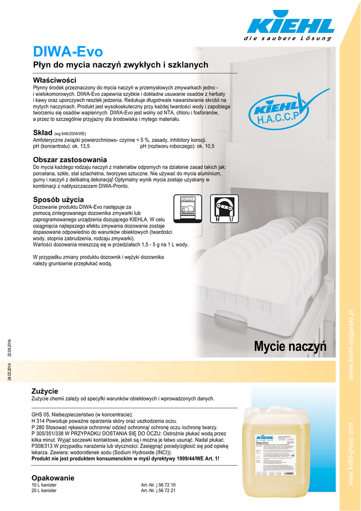 DIWA-Evo Płyn do mycia naczyń zwykłych i szklanych Właściwości Płynny środek przeznaczony do mycia naczyń w przemysłowych zmywarkach jedno i wielokomorowych. DIWA-Evo zapewnia szybkie i dokładne usuwanie osadów z herbaty i kawy oraz uporczywch resztek jedzenia. Redukuje długotrwale nawarstwianie skrobii na mytych naczyniach. Produkt jest wysokoskuteczny przy każdej twardości wody i zapobiega tworzeniu się osadów wapiennych. DIWA-Evo jest wolny od NTA, chloru i fosforanów, a przez to szczególnie przyjazny dla środowiska i mytego materiału. Skład (wg 648/2004/WE) Amfoteryczne związki powierzchniowo- czynne < 5 %, zasady, inhibitory korozji. pH (koncentratu): ok. 13,5 pH (roztworu roboczego): ok. 10,5 Obszar zastosowania Do mycia każdego rodzaju naczyń z materiałów odpornych na działanie zasad takich jak: porcelana, szkło, stal szlachetna, tworzywo sztuczne. Nie używać do mycia aluminium, gumy i naczyń z delikatną dekoracją! Optymalny wynik mycia zostaje uzyskany w kombinacji z nabłyszczaczem DIWA-Pronto. Sposób użycia Dozowanie produktu DIWA-Evo następuje za pomocą zintegrowanego dozownika zmywarki lub zaprogramowanego urządzenia dozującego KIEHLA. W celu osiągnięcia najlepszego efektu zmywania dozowanie zostaje dopasowane odpowiednio do warunków obiektowych (twardości wody, stopnia zabrudzenia, rodzaju zmywarki). Wartości dozowania mieszczą się w przedziałach 1,5 - 5 g na 1 L wody. 24.03.2014 22.04.2014 Mycie naczyń www.kiehl-zegarski.pl W przypadku zmiany produktu dozownik i wężyki dozownika należy gruntownie przepłukać wodą. Zużycie GHS 05, Niebezpieczeństwo (w koncentracie); H 314 Powoduje poważne oparzenia skóry oraz uszkodzenia oczu. P 280 Stosować rękawice ochronne/ odzież ochronną/ ochronę oczu /ochronę twarzy. P 305/351/338 W PRZYPADKU DOSTANIA SIĘ DO OCZU: Ostrożnie płukać wodą przez kilka minut. Wyjąć soczewki kontaktowe, jeżeli są i można je łatwo usunąć. Nadal płukać. P308/313 W przypadku narażenia lub styczności: Zasięgnąć porady/zgłosić się pod opiekę lekarza. Zawiera: wodorotlenek sodu (Sodium Hydroxide (INCI)). Produkt nie jest produktem konsumenckim w myśl dyrektywy 1999/44/WE Art. 1! Opakowanie 10 L kanister 20 L kanister Art.-Nr. j 56 72 10 Art.-Nr. j 56 72 21 www.kiehl-group.com Zużycie chemii zależy od specyfki warunków obiektowych i wprowadzonych danych.