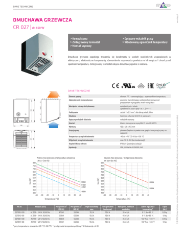 25 OGRZEWANIE www.stego.pl KATALOG PRODUKTÓW STEGO DANE TECHNICZNE DMUCHAWA GRZEWCZA CR 027 | do 650 W >>Kompaktowa >>Zintegrowany termostat >>Montaż szynowy >>Optyczny wskaźnik pracy >>Wbudowany ogranicznik temperatury Dmuchawa grzewcza zapobiega tworzeniu się kondensatu w szafach rozdzielczych wyposażonych w elektryczne / elektroniczne komponenty, równomiernie rozprowadza powietrze w ich wnętrzu i chroni przed spadkiem temperatury. Zintegrowany termostat załącza dmuchawę zgodnie z nastawą. Element grzejny element PTC – samoregulujący z ogranicznikiem temperatury Zabezpieczenie temperaturowe powrotny styk odcinający zasilanie dla ochrony przed przegrzaniem w przypadku awarii wentylatora Wentylator osiowy ułożyskowany wydajność patrz tabela żywotność 50.000 h przy +25 °C (+77 °F) Podłączenie zaciski 2 x 2,5 mm², siła dokręcania 0,8 Nm Obudowa tworzywo sztuczne UL94 V-0, jasnoszare Optyczny wskaźnik działania wskaźnik neonowy Montaż klamra mocująca na szynę DIN 35 mm, EN 60715 Wymiary 100 x 128 x 165 mm Pozycja pracy pionowa (wydmuch powietrza w górę) – inna pozycja pracy na zapytanie Temperatura pracy i składowania -45 do +70 °C (-49 do +158 °F) Wilgotność pracy i składowania max. 90 % RH (bez kondensacji) Stopień i klasa ochrony IP20 / II (podwójna izolacja) Aprobacje VDE, UL File No. E204590, EAC Moc (W) Wykres moc grzewcza / temperatura otoczenia CR 027 (60 Hz) Moc (W) Wykres moc grzewcza / temperatura otoczenia CR 027 (50 Hz) Temperatura (°C) Temperatura (°C) Nr art. Napięcie pracy Moc grzewcza¹ (50 Hz) 02700.0-00 AC 220 – 240 V, 50/60 Hz 475 W 02701.0-00 AC 220 – 240 V, 50/60 Hz 550 W 02700.9-00 AC 110 – 120 V, 50/60 Hz 400 W 02701.9-00 AC 110 – 120 V, 50/60 Hz 510 W Moc grzewcza¹ (60 Hz) Prąd rozruchowy max. Zabezpieczenie (zwłoczne) Wydajność, nadmuch swobodny Zakres regulatora temperatury² Ciężar (ok.) 550 W 11,0 A 650 W 13,0 A 10,0 A 35 m³/h 0 °C do +60 °C 0,9 kg 10,0 A 45 m³/h 0 °C do +60 °C 550 W 1,1 kg 14,0 A 10,0 A 35 m³/h +32 °F do +140 °F 0,9 kg 650 W 15,0 A 10,0 A 45 m³/h +32 °F do +140 °F 1,1 kg ¹ przy temperaturze otoczenia +20 °C (+68 °F); ² przełączanie temperatury różnicy 7 K (tolerancja ±4 K) 11.08.2016 | Zmiany techniczne zastrzeżone. Wszystkie parametry mogą podlegać zmianie. Poniższe informacje nie zwalniają nabywcy od samodzielnej kontroli instalacji. DANE TECHNICZNE