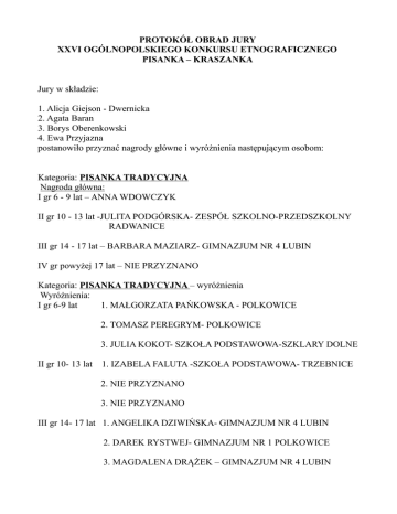 PROTOKÓŁ OBRAD JURY XXVI OGÓLNOPOLSKIEGO KONKURSU ETNOGRAFICZNEGO PISANKA – KRASZANKA Jury w składzie: 1. Alicja Giejson - Dwernicka 2. Agata Baran 3. Borys Oberenkowski 4. Ewa Przyjazna postanowiło przyznać nagrody główne i wyróżnienia następującym osobom: Kategoria: PISANKA TRADYCYJNA Nagroda główna: I gr 6 - 9 lat – ANNA WDOWCZYK II gr 10 - 13 lat -JULITA PODGÓRSKA- ZESPÓŁ SZKOLNO-PRZEDSZKOLNY RADWANICE III gr 14 - 17 lat – BARBARA MAZIARZ- GIMNAZJUM NR 4 LUBIN IV gr powyżej 17 lat – NIE PRZYZNANO Kategoria: PISANKA TRADYCYJNA – wyróżnienia Wyróżnienia: I gr 6-9 lat 1. MAŁGORZATA PAŃKOWSKA - POLKOWICE 2. TOMASZ PEREGRYM- POLKOWICE 3. JULIA KOKOT- SZKOŁA PODSTAWOWA-SZKLARY DOLNE II gr 10- 13 lat 1. IZABELA FALUTA -SZKOŁA PODSTAWOWA- TRZEBNICE 2. NIE PRZYZNANO 3. NIE PRZYZNANO III gr 14- 17 lat 1. ANGELIKA DZIWIŃSKA- GIMNAZJUM NR 4 LUBIN 2. DAREK RYSTWEJ- GIMNAZJUM NR 1 POLKOWICE 3. MAGDALENA DRĄŻEK – GIMNAZJUM NR 4 LUBIN IV gr powyżej 17 1. DOROTA SZALWA- STRASZĘCIN 2. NIE PRZYZNANO 3. NIE PRZYZNANO Kategoria: PISANKA AWANGARDOWA Nagroda główna: I gr 6- 9 lat MATEUSZ PAKUŁA II gr 10 – 13 lat NATALIA WAWRYN III gr 14 – 17 lat NATALIA LECH- GIMNAZJUM NR 4- LUBIN IV gr powyżej 17 lat IRENA BURZYŃSKA- LEGNICA Kategoria: PISANKA AWANGARDOWA - wyróżnienia Wyróżnienia: I gr 6-9 lat 1. NICOL JAROSZ- PRZEDSZKOLE MIEJSKIE NR 2POLKOWICE 2. ALICJA BEŁKOWSKA- ŚWIETLICA ŚRODOWISKOWA OPSPOLKOWICE 3.MAGDALENA LITWIN- PRZEDSZKOLE MIEJSKIE NR 3 POLKOWICE 4. MAKSYM AMBROZIAK- PRZEDSZKOLE MIEJSKIE NR 5 POLKOWICE 5. WIKTORIA AMBROZIAK II gr 10- 13 lat 1. JAKUB LEWANDOWSKI SP SZKLARY DOLNE 2. ANNA MUSIAŁ- GIMNAZJUM NR 1 POLKOWICE 3. MARTA SUSZCZ- BIAŁYSTOK 4. WERONIKA STĘPIŃSKA- SZKOŁA PODSTAWOWA NR 2 POLKOWICE 5. NORBERT MALIK- ŚWIETLICA ŚRODOWISKOWA OPS POLKOWICE III gr 14- 17 lat 1. WOJCIECH CZĄSTKIEWICZ-GIMNAZJUM NR 2 POLKOWICE 2. JULITA KLIM- II LICEUM OGÓLNOKSZTAŁCĄCE- LUBIN 3. ALEKSANDRA MICHALSKA- I LICEUM OGÓLNOKSZTAŁCĄCE- LUBIN 4. MARTYNA GRYGIEL IV gr powyżej 17 1. SYLWIA GÓRAK 2. DARIA SAWCZUK- POLKOWICE 3. JOANNA PĘDLOWSKA- POLKOWICE 4. SYLWIA MROWIEC- WARSZTAT TERAPII ZAJĘCIOWEJ POLKOWICE