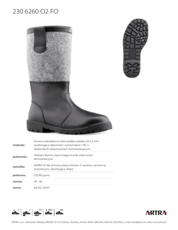 230 6260 O2 FO cholewka licowa wodoodporna skóra bydlęca gładka 2,0-2,2 mm zwiększająca odporność i wytrzymałość / filc o doskonałych właściwościach termoizolacyjnych podszewka nietkana tkanina zapewniająca trwałe właściwości termoizolacyjne wyściólka WARM UP dla ochrony przed zimnem, 4 warstwy, wymienna, anatomiczna, absorbująca wilgoć podeszwa CEZAR guma rozmiar 38 - 48 norma EN ISO 20347 ARTRA, s.r.o., Námestie Slobody 846/69, 972 47 Oslany, Slovakia, tel/fax: 00421/46/549 2248-50, 549 2062, e-mail: [email protected], web: www.artra.sk