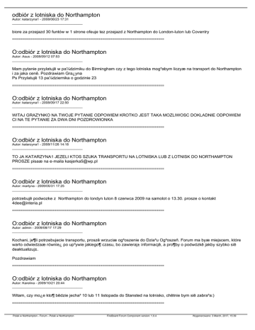 odbiór z lotniska do Northampton Autor: katarzyna1 - 2008/08/23 17:31 _____________________________________ biore za przejazd 30 funtów w 1 strone ofeuje tez przejazd z Northampton do London-luton lub Coventry ============================================================================ O:odbiór z lotniska do Northampton Autor: Asus - 2008/09/12 07:53 _____________________________________ Mam pytanie przylatujê w pa¼dzirniku do Birmingham czy z tego lotniska mog³abym liczyæ na transport do Northampton i za jaka cenê. Pozdrawiam Gra¿yna Ps Przylatujê 13 pa¼dziernika o godzinie 23 ============================================================================ O:odbiór z lotniska do Northampton Autor: katarzyna1 - 2008/09/17 22:50 _____________________________________ WITAJ GRAZYNKO NA TWOJE PYTANIE ODPOWIEM KROTKO JEST TAKA MOZLIWOSC DOKLADNIE ODPOWIEM CI NA TE PYTANIE ZA DWA DNI POZDROWIONKA ============================================================================ O:odbiór z lotniska do Northampton Autor: katarzyna1 - 2008/11/26 14:18 _____________________________________ TO JA KATARZYNA1 JEZELI KTOS SZUKA TRANSPORTU NA LOTNISKA LUB Z LOTNISK DO NORTHAMPTON PROSZE pisaæ na e-maila [email protected] ============================================================================ O:odbiór z lotniska do Northampton Autor: martyna - 2009/05/31 17:25 _____________________________________ potrzebujê podwozke z Northampton do londyn luton 8 czerwca 2009 na samolot o 13.30. prosze o kontakt [email protected] ============================================================================ O:odbiór z lotniska do Northampton Autor: admin - 2009/08/17 17:29 _____________________________________ Kochani, je¶li potrzebujecie transportu, proszê wrzuciæ og³oszenie do Dzia³u Og³oszeñ. Forum ma byæ miejscem, które warto odwiedzaæ równie¿ po up³ywie jakiego¶ czasu, bo zawieraj± informacjê, a pro¶by o podwózkê jakby szybko siê deaktualizuj±. Pozdrawiam ============================================================================ O:odbiór z lotniska do Northampton Autor: Karolina - 2009/10/21 20:44 _____________________________________ Witam, czy mo¿e kto¶ bêdzie jecha³ 10 lub 11 listopada do Stansted na lotnisko, chêtnie bym siê zabra³a:) ============================================================================ Polak w Northampton - Forum - Polak w Northampton FireBoard Forum Component version: 1.0.4 Wygenerowano: 3 March, 2017, 15:39 O:odbiór z lotniska do Northampton Autor: anieliczka - 2009/10/23 02:33 _____________________________________ ca³kowicie popieram Admina! ============================================================================ Polak w Northampton - Forum - Polak w Northampton FireBoard Forum Component version: 1.0.4 Wygenerowano: 3 March, 2017, 15:39