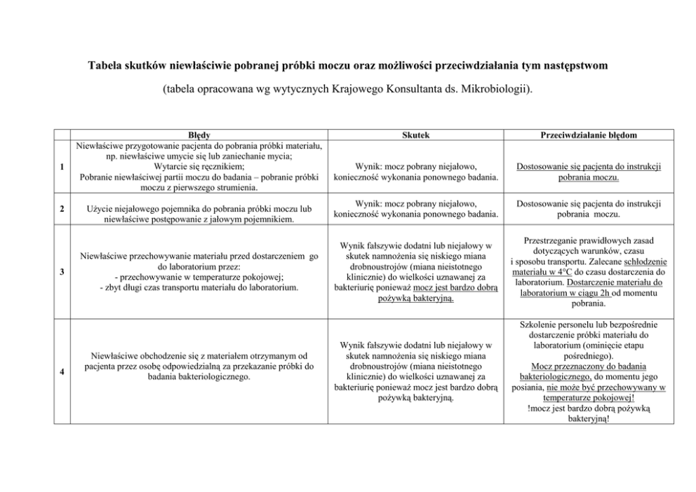 Tabela skutków niewłaściwie pobranej próbki moczu oraz