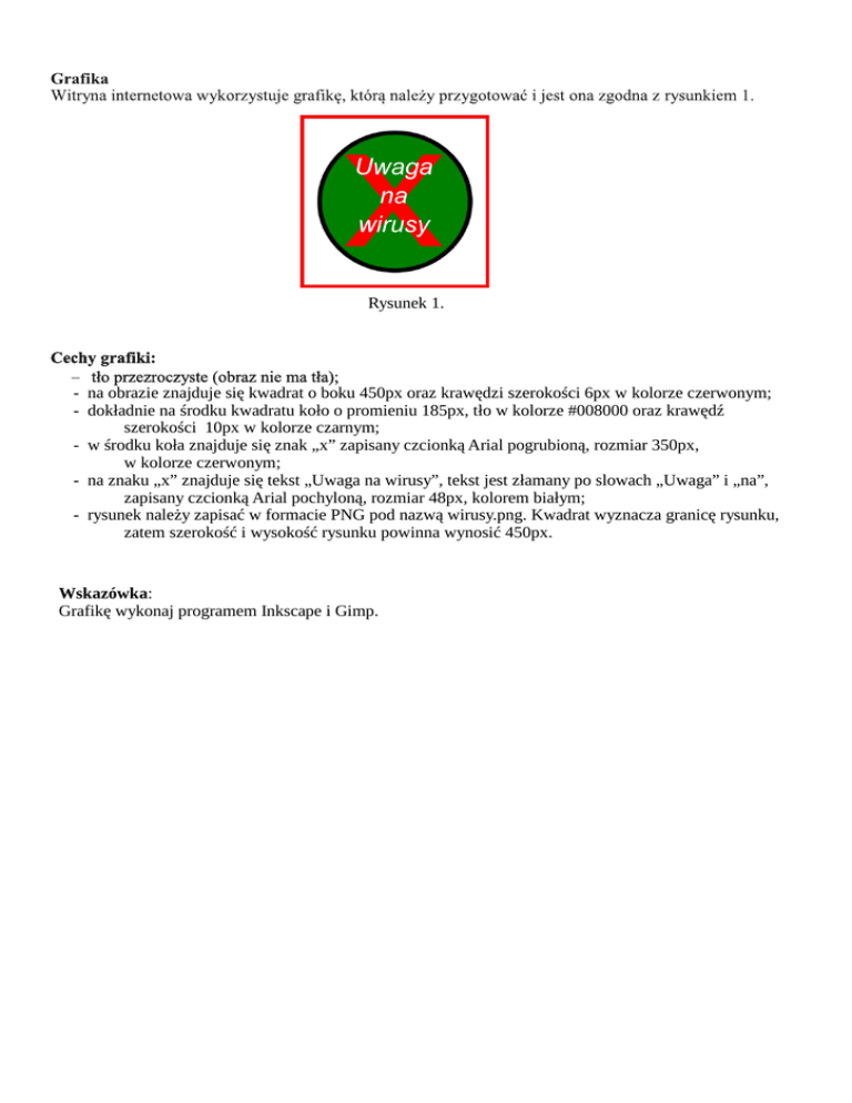 Rysunek 1. - na obrazie znajduje się kwadrat o boku 450px oraz krawędzi szerokości 6px w kolorze czerwonym; - dokładnie na środku kwadratu koło o promieniu 185px, tło w kolorze #008000 oraz krawędź szerokości 10px w kolorze czarnym; - w środku koła znajduje się znak „x” zapisany czcionką Arial pogrubioną, rozmiar 350px, w kolorze czerwonym; - na znaku „x” znajduje się tekst „Uwaga na wirusy”, tekst jest złamany po slowach „Uwaga” i „na”, zapisany czcionką Arial pochyloną, rozmiar 48px, kolorem białym; - rysunek należy zapisać w formacie PNG pod nazwą wirusy.png. Kwadrat wyznacza granicę rysunku, zatem szerokość i wysokość rysunku powinna wynosić 450px. Wskazówka: Grafikę wykonaj programem Inkscape i Gimp.