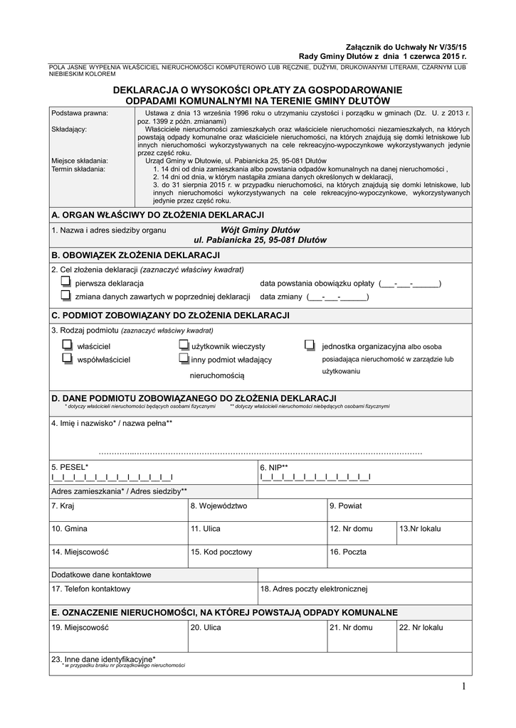 Załącznik do Uchwały Nr V/35/15 Rady Gminy Dłutów z dnia 1 czerwca 2015 r. POLA JASNE WYPEŁNIA WŁAŚCICIEL NIERUCHOMOŚCI KOMPUTEROWO LUB RĘCZNIE, DUŻYMI, DRUKOWANYMI LITERAMI, CZARNYM LUB NIEBIESKIM KOLOREM DEKLARACJA O WYSOKOŚCI OPŁATY ZA GOSPODAROWANIE ODPADAMI KOMUNALNYMI NA TERENIE GMINY DŁUTÓW Podstawa prawna: Składający: Miejsce składania: Termin składania: Ustawa z dnia 13 września 1996 roku o utrzymaniu czystości i porządku w gminach (Dz. U. z 2013 r. poz. 1399 z późn. zmianami) Właściciele nieruchomości zamieszkałych oraz właściciele nieruchomości niezamieszkałych, na których powstają odpady komunalne oraz właściciele nieruchomości, na których znajdują się domki letniskowe lub innych nieruchomości wykorzystywanych na cele rekreacyjno-wypoczynkowe wykorzystywanych jedynie przez część roku. Urząd Gminy w Dłutowie, ul. Pabianicka 25, 95-081 Dłutów 1. 14 dni od dnia zamieszkania albo powstania odpadów komunalnych na danej nieruchomości , 2. 14 dni od dnia, w którym nastąpiła zmiana danych określonych w deklaracji, 3. do 31 sierpnia 2015 r. w przypadku nieruchomości, na których znajdują się domki letniskowe, lub innych nieruchomości wykorzystywanych na cele rekreacyjno-wypoczynkowe, wykorzystywanych jedynie przez część roku. A. ORGAN WŁAŚCIWY DO ZŁOŻENIA DEKLARACJI 1. Nazwa i adres siedziby organu Wójt Gminy Dłutów ul. Pabianicka 25, 95-081 Dłutów B. OBOWIĄZEK ZŁOŻENIA DEKLARACJI 2. Cel złożenia deklaracji (zaznaczyć właściwy kwadrat) pierwsza deklaracja data powstania obowiązku opłaty (___-___-______) zmiana danych zawartych w poprzedniej deklaracji data zmiany (___-___-______) C. PODMIOT ZOBOWIĄZANY DO ZŁOŻENIA DEKLARACJI 3. Rodzaj podmiotu (zaznaczyć właściwy kwadrat) właściciel użytkownik wieczysty jednostka organizacyjna albo osoba współwłaściciel inny podmiot władający posiadająca nieruchomość w zarządzie lub nieruchomością użytkowaniu D. DANE PODMIOTU ZOBOWIĄZANEGO DO ZŁOŻENIA DEKLARACJI * dotyczy właścicieli nieruchomości będących osobami fizycznymi ** dotyczy właścicieli nieruchomości niebędących osobami fizycznymi 4. Imię i nazwisko* / nazwa pełna** …………..………………………………………………………………………………………………… 5. PESEL* I__I__I__I__I__I__I__I__I__I__I__I 6. NIP** I__I__I__I__I__I__I__I__I__I__I Adres zamieszkania* / Adres siedziby** 7. Kraj 8. Województwo 9. Powiat 10. Gmina 11. Ulica 12. Nr domu 14. Miejscowość 15. Kod pocztowy 16. Poczta 13.Nr lokalu Dodatkowe dane kontaktowe 17. Telefon kontaktowy 18. Adres poczty elektronicznej E. OZNACZENIE NIERUCHOMOŚCI, NA KTÓREJ POWSTAJĄ ODPADY KOMUNALNE 19. Miejscowość 20. Ulica 21. Nr domu 22. Nr lokalu 23. Inne dane identyfikacyjne* * w przypadku braku nr porządkowego nieruchomości 1 24. Rodzaj nieruchomości, na której powstają odpady komunalne (zaznaczyć właściwy kwadrat) zamieszkała (należy wypełnić część F ) niezamieszkała (należy wypełnić część G) mieszana - w części zamieszkała i w części niezamieszkała (należy wypełnić część F, G i H) letniskowa lub na cele rekreacyjnowypoczynkowe (należy wypełnić część I) OBLICZENIE WYSOKOŚCI OPŁATY ZA GOSPODAROWANIE ODPADAMI KOMUNALNYMI F. DOTYCZY NIERUCHOMOŚCI ZAMIESZKAŁYCH Oświadczam, że na terenie nieruchomości wskazanej w części E 25. niniejszej deklaracji, odpady będą zbierane w sposób Stawka opłaty 27. Liczba osób zamieszkujących nieruchomość 29. Wysokość miesięcznej opłaty 30. 26. nieselektywny selektywny 7,00 zł/osobę 28. 12,00 zł/osobę …..……… (iloczyn liczby osób z poz. 29 oraz stawki opłaty z poz. 27 lub 28) Wysokość opłaty kwartalnej (trzykrotność opłaty miesięcznej z poz. 30) 31. …..……… G. DOTYCZY NIERUCHOMOŚCI NIEZAMIESZKAŁYCH, NA KTÓRYCH POWSTAJĄ ODPADY KOMUNALNE Oświadczam, że na terenie nieruchomości wskazanej w części E niniejszej deklaracji odpady komunalne zbierane są w pojemnikach: selektywna zbiórka Wielkość pojemników na odpady komunalne A Deklarowana ilość pojemników na odpady zmieszane zapełnianych w ciągu miesiąca nieselektywna zbiórka B C Stawka za pojemnik (zł) D Wysokość Deklarowana opłaty – iloczyn ilość pojemników ilości na odpady pojemników z zmieszane kol. A oraz zapełnianych w stawki z kol. B ciągu miesiąca (zł) E F Stawka za pojemnik (zł) Wysokość opłaty - iloczyn ilości pojemników z kol. D oraz stawki z kol. E (zł) 0,12 m 3 32. 20,00 40,00 0,24 m 3 33. 36,00 72,00 1,1 m 3 34. 90,00 180,00 7,0 m 3 35. 450,00 900,00 Miesięczna opłata za odpady zbierane w sposób selektywny (suma opłat z kol. C) 36. Kwartalna opłata za odpady zbierane w sposób selektywny (trzykrotność opłaty miesięcznej z poz. 36) 38. ……… ……… Miesięczna opłata za odpady zbieranie w sposób nieselekt. (suma opłat z kol. F) 37. ……… Kwartalna opłata za odpady 39. zbierane w sposób nieselekt. (trzykrotność opłaty miesięcznej z ……… poz. 37) H. OBLICZENIE MIESIĘCZNEJ ORAZ KWARTALNEJ OPŁATY ZA GOSPODAROWANIE ODPADAMI KOMUNALNYMI NA NIERUCHOMOŚCIACH W CZĘŚCI ZAMIESZKAŁYCH I W CZĘŚCI NIEZAMIESZKAŁYCH 40. Wysokość miesięcznej opłaty wynosi: (suma opłat z poz. 30 i 36 lub 37): ............................................. złotych 41. Wysokość kwartalnej opłaty wynosi: (suma opłat z poz. 31 i 38 lub 39): ............................................. złotych 2 I. DOTYCZY NIERUCHOMOŚCI, NA KTÓRYCH ZNAJDUJĄ SIĘ DOMKI LETNISKOWE, LUB INNYCH NIERUCHOMOŚCI WYKORZYSTYWANYCH NA CELE REKREACYJNO-WYPOCZYNKOWE, WYKORZYSTYWANYCH JEDYNIE PRZEZ CZĘŚĆ ROKU WYSOKOŚĆ ROCZNEJ RYCZAŁTOWEJ OPŁATY ZA KOMUNALNYMI NA NIERUCHOMOŚCI WSKAZANEJ W CZ. I Ilość domków 42. letniskowych lub innych nieruchomości wykorzystywanych ……… na cele rekreacyjno ….. - wypoczynkowe Stawka ryczałtowej opłaty za selektywne zbieranie odpadów St