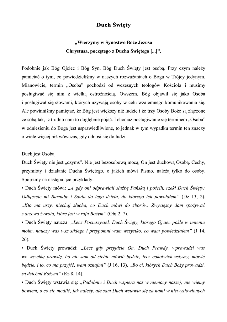 Duch Święty „Wierzymy w Synostwo Boże Jezusa Chrystusa, poczętego z Ducha Świętego [...]”. Podobnie jak Bóg Ojciec i Bóg Syn, Bóg Duch Święty jest osobą. Przy czym należy pamiętać o tym, co powiedzieliśmy w naszych rozważaniach o Bogu w Trójcy jedynym. Mianowicie, termin „Osoba” pochodzi od wczesnych teologów Kościoła i musimy posługiwać się nim z wielką ostrożnością. Owszem, Bóg objawił się jako Osoba i posługiwał się słowami, których używają osoby w celu wzajemnego komunikowania się. Ale powinniśmy pamiętać, że Bóg jest większy niż ludzie i że trzy Osoby Boże są złączone ze sobą tak, iż trudno nam to dogłębnie pojąć. I chociaż posługiwanie się terminem „Osoba” w odniesieniu do Boga jest usprawiedliwione, to jednak w tym wypadku termin ten znaczy o wiele więcej niż wówczas, gdy odnosi się do ludzi. Duch jest Osobą Duch Święty nie jest „czymś”. Nie jest bezosobową mocą. On jest duchową Osobą. Cechy, przymioty i działanie Ducha Świętego, o jakich mówi Pismo, należą tylko do osoby. Spójrzmy na następujące przykłady: • Duch Święty mówi: „A gdy oni odprawiali służbę Pańską i pościli, rzekł Duch Święty: Odłączcie mi Barnabę i Saula do tego dzieła, do którego ich powołałem” (Dz 13, 2). „Kto ma uszy, niechaj słucha, co Duch mówi do zborów. Zwycięzcy dam spożywać z drzewa żywota, które jest w raju Bożym” (Obj 2, 7). • Duch Święty naucza: „Lecz Pocieszyciel, Duch Święty, którego Ojciec pośle w imieniu moim, nauczy was wszystkiego i przypomni wam wszystko, co wam powiedziałem” (J 14, 26). • Duch Święty prowadzi: „Lecz gdy przyjdzie On, Duch Prawdy, wprowadzi was we wszelką prawdę, bo nie sam od siebie mówić będzie, lecz cokolwiek usłyszy, mówić będzie, i to, co ma przyjść, wam oznajmi” (J 16, 13). „Bo ci, których Duch Boży prowadzi, są dziećmi Bożymi” (Rz 8, 14). • Duch Święty wstawia się: „Podobnie i Duch wspiera nas w niemocy naszej; nie wiemy bowiem, o co się modlić, jak należy, ale sam Duch wstawia się za nami w niewysłowionych westchnieniach” (Rz 8, 26). • Duch Święty świadczy: „Gdy przyjdzie Pocieszyciel, którego Ja wam poślę od Ojca, Duch Prawdy, który od Ojca wychodzi, złoży świadectwo o mnie” (J 15, 26). Następnie, Duch Święty może być traktowany przez innych jako osoba. Można mu skłamać: „I rzekł Piotr: Ananiaszu, czym to omotał szatan serce twoje, że okłamałeś Ducha Świętego” (Dz 5, 3). Może być kuszony: „A Piotr do niej: Dlaczego zmówiliście się, by kusić Ducha Pańskiego?” (Dz 5, 9). Możemy popełnić wobec Ducha Świętego grzech bluźnierstwa: „Dlatego powiadam wam: Każdy grzech i bluźnierstwo będzie ludziom odpuszczone, ale bluźnierstwo przeciw Duchowi nie będzie odpuszczone” (Mt 12, 31). Można mu się sprzeciwić: „wy zawsze sprzeciwiacie się Duchowi Świętemu” (Dz 7, 51). Może być zasmucony: „A nie zasmucajcie Bożego Ducha Świętego, którym jesteście zapieczętowani na dzień odkupienia” (Ef 4, 30). W końcu, Duch Święty może być znieważony: „O ileż sroższej kary, sądzicie, godzien jest ten, kto Syna Bożego podeptał i zbezcześcił krew Przymierza, przez którą został uświęcony, i znieważył Ducha łaski!” (Hbr 10, 29). Duch Święty ma umysł, wolę i uczucia. Ma wszystkie cechy, które określają osobę. Nie jest więc bezosobową siłą, lecz duchową Osobą. Bóg Duch Święty Duch Święty jest Osobą Boską. Jest trzecią Osobą Boga w Trójcy jedynego. Posiada przymioty, które są przymiotami Boga. Wymieńmy niektóre z nich, uzasadniając je Słowem Pisma. • Duch Święty jest wieczny: „O ileż bardziej krew Chrystusa, który przez Ducha wiecznego ofiarował samego siebie bez skazy Bogu, oczyści sumienie nasze od martwych uczynków, abyśmy mogli służyć Bogu żywemu” (Ebr 9, 14). Znaczy to, że nie było czasu, kiedy On, Duch Święty, nie istniał. • Duch Święty jest wszechmocny: „I odpowiadając anioł, rzekł jej: Duch Święty zstąpi na ciebie i moc Najwyższego zacieni cię. Dlatego też to, co się narodzi, będzie święte i będzie nazwane Synem Bożym” (Łk 1, 35). • Duch Święty jest wszechobecny: „Dokąd ujdę przed Duchem twoim? I dokąd przed obliczem twoim ucieknę?” (Ps 139, 7). • Duch Święty jest wszechwiedzący: „Albowiem nam objawił to Bóg przez Ducha; gdyż Duch bada wszystko, nawet głębokości Boże. Bo któż z ludzi wie, kim jest człowiek, prócz ducha ludzkiego, który w nim jest? Tak samo kim jest Bóg, nikt nie poznał, tylko Duch Boży” (1 Kor 2, 10-11). • Duch Święty nazwany jest Bogiem: „I rzekł Piotr: Ananiaszu, czym to omotał szatan serce twoje, że okłamałeś Ducha Świętego i zachowałeś dla siebie część pieniędzy za rolę? Czyż póki ją miałeś, nie była twoją, a gdy została sprzedana, czy nie mogłeś rozporządzać pieniędzmi do woli? Cóż cię skłoniło do tego, żeś tę rzecz dopuścił do serca swego? Nie ludziom skłamałeś, lecz Bogu” (Dz 5, 3-4). • Duch Święty występuje obok Ojca i Syna, pierwszej i drugiej Osoby Boga w Trójcy jedynego, na przykład w Wielkim Nakazie Misyjnym oraz w apostolskim błogosławieństwie: „Idźcie tedy i czyńcie uczniami wszystkie narody, chrzcząc je w imię Ojca i Syna, i Ducha Świętego, ucząc je przestrzegać wszystkiego, co wam przykazałem” (Mt 28, 19-20); „Łaska Pana naszego, Jezusa Chrystusa i miłość Boga Ojca, i społeczność Ducha Świętego niech będzie z wami wszystkimi” (2 Kor 13, 13). Duch Święty i Jezus Pismo mówi, że Jezus został poczęty z Ducha Świętego. U Mateusza czytamy: „A z narodzeniem Jezusa Chrystusa było tak: Gdy matka jego, Maria, została poślubiona Józefowi, okazało się, że zanim się zeszli, była brzemienna z Ducha Świętego” (Mt 1, 18). Rozmyślającemu nad tą sprawą Józefowi, zaręc