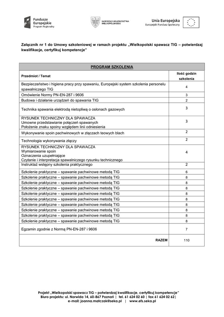 Załącznik nr 1 do Umowy szkoleniowej w ramach projektu „Wielkopolski spawacz TIG – potwierdzaj kwalifikacje, certyfikuj kompetencje” PROGRAM SZKOLENIA Ilość godzin Przedmiot / Temat szkolenia Bezpieczeństwo i higiena pracy przy spawaniu, Europejski system szkolenia personelu spawalniczego TIG Omówienie Normy PN-EN-287 i 9606 Budowa i działanie urządzeń do spawania TIG 4 3 2 Technika spawania elektrodą nietopliwą o osłonach gazowych 3 RYSUNEK TECHNICZNY DLA SPAWACZA Umowne przedstawianie połączeń spawanych Położenie znaku spoiny względem linii odniesienia 3 Wykonywanie spoin pachwinowych w złączach teowych blach 2 Technologia wykonywania złączy 2 RYSUNEK TECHNICZNY DLA SPAWACZA Wymiarowanie spoin Oznaczenia uzupełniające Czytanie i interpretacja spawalniczego rysunku technicznego Instruktaż wstępny szkolenia praktycznego 4 2 Szkolenie praktyczne – spawanie pachwinowe metodą TIG Szkolenie praktyczne – spawanie pachwinowe metodą TIG Szkolenie praktyczne – spawanie pachwinowe metodą TIG Szkolenie praktyczne – spawanie pachwinowe metodą TIG Szkolenie praktyczne – spawanie pachwinowe metodą TIG Szkolenie praktyczne – spawanie pachwinowe metodą TIG Szkolenie praktyczne – spawanie pachwinowe metodą TIG Szkolenie praktyczne – spawanie pachwinowe metodą TIG Szkolenie praktyczne – spawanie pachwinowe metodą TIG Szkolenie praktyczne – spawanie pachwinowe metodą TIG 6 Egzamin zgodnie z Normą PN-EN-287 i 9606 7 8 8 8 8 8 8 8 8 8 RAZEM Projekt „Wielkopolski spawacz TIG – potwierdzaj kwalifikacje, certyfikuj kompetencje” Biuro projektu: ul. Norwida 14, 60-867 Poznań | tel. 61 624 02 60 | fax 61 624 02 62| e-mail: [email protected] | www.efs.seka.pl 110