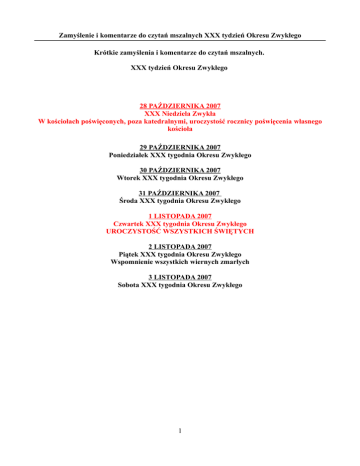 Zamyślenie i komentarze do czytań mszalnych XXX tydzień Okresu Zwykłego Krótkie zamyślenia i komentarze do czytań mszalnych. XXX tydzień Okresu Zwykłego 28 PAŹDZIERNIKA 2007 XXX Niedziela Zwykła W kościołach poświęconych, poza katedralnymi, uroczystość rocznicy poświęcenia własnego kościoła 29 PAŹDZIERNIKA 2007 Poniedziałek XXX tygodnia Okresu Zwykłego 30 PAŹDZIERNIKA 2007 Wtorek XXX tygodnia Okresu Zwykłego 31 PAŹDZIERNIKA 2007 Środa XXX tygodnia Okresu Zwykłego 1 LISTOPADA 2007 Czwartek XXX tygodnia Okresu Zwykłego UROCZYSTOŚĆ WSZYSTKICH ŚWIĘTYCH 2 LISTOPADA 2007 Piątek XXX tygodnia Okresu Zwykłego Wspomnienie wszystkich wiernych zmarłych 3 LISTOPADA 2007 Sobota XXX tygodnia Okresu Zwykłego 1 Zamyślenie i komentarze do czytań mszalnych XXX tydzień Okresu Zwykłego 28 PAŹDZIERNIKA 2007 XXX Niedziela Zwykła W kościołach poświęconych, poza katedralnymi, uroczystość rocznicy poświęcenia własnego kościoła (Syr 35,12-14.16-18) Pan jest Sędzią, który nie ma względu na osoby. Nie będzie miał On względu na osobę przeciw biednemu, owszem, wysłucha prośby pokrzywdzonego. Nie lekceważy błagania sieroty i wdowy, kiedy się skarży. Kto służy Bogu, z upodobaniem będzie przyjęty, a błaganie jego dosięgnie obłoków. Modlitwa biednego przeniknie obłoki i nie ustanie, aż dojdzie do celu. Nie odstąpi ona, aż wejrzy Najwyższy i ujmie się za sprawiedliwymi, i wyda słuszny wyrok. (Ps 34,2-3.17-19.23) REFREN: Biedak zawołał i Pan go wysłuchał. Będę błogosławił Pana po wieczne czasy, Jego chwała będzie zawsze na moich ustach. Dusza moja chlubi się Panem, niech słyszą to pokorni i niech się weselą. Pan zwraca swe oblicze przeciw zło czyniącym, by pamięć o nich wymazać z ziemi. Pan słyszy wołających o pomoc i ratuje ich od wszelkiej udręki. Pan jest blisko ludzi skruszonych w sercu, ocala upadłych na duchu. Pan odkupi dusze sług swoich, nie zazna kary, kto się doń ucieka. (2 Tm 4,6-9.16-18) Krew moja już ma być wylana na ofiarę, a chwila mojej rozłąki nadeszła. W dobrych zawodach wystąpiłem, bieg ukończyłem, wiarę ustrzegłem. Na ostatek odłożono dla mnie wieniec sprawiedliwości, który mi w owym dniu odda Pan, sprawiedliwy Sędzia, a nie tylko mnie, ale i wszystkich, którzy umiłowali pojawienie się Jego. Pośpiesz się, by przybyć do mnie szybko. W pierwszej mojej obronie nikt przy mnie nie stanął, ale mię wszyscy opuścili: niech im to nie będzie policzone! Natomiast Pan stanął przy mnie i wzmocnił mię, żeby się przeze mnie dopełniło głoszenie Ewangelii i żeby wszystkie narody je posłyszały; wyrwany też zostałem z paszczy lwa. Wyrwie mię Pan od wszelkiego złego czynu i wybawi mię, przyjmując do swego królestwa niebieskiego; Jemu chwała na wieki wieków! Amen. (2 Kor 5,19) W Chrystusie Bóg pojednał świat ze sobą, nam zaś przekazał słowo jednania. 2 Zamyślenie i komentarze do czytań mszalnych XXX tydzień Okresu Zwykłego (Łk 18,9-14) Jezus powiedział do niektórych, co ufali sobie, że są sprawiedliwi, a innymi gardzili, tę przypowieść: Dwóch ludzi przyszło do świątyni, żeby się modlić, jeden faryzeusz a drugi celnik. Faryzeusz stanął i tak w duszy się modlił: Boże, dziękuję Ci, że nie jestem jak inni ludzie, zdziercy, oszuści, cudzołożnicy, albo jak i ten celnik. Zachowuję post dwa razy w tygodniu, daję dziesięcinę ze wszystkiego, co nabywam. Natomiast celnik stał z daleka i nie śmiał nawet oczu wznieść ku niebu, lecz bił się w piersi i mówił: Boże, miej litość dla mnie, grzesznika. Powiadam wam: Ten odszedł do domu usprawiedliwiony, nie tamten. Każdy bowiem, kto się wywyższa, będzie poniżony, a kto się uniża, będzie wywyższony. Kilka słów do Listu do Tymoteusza. Perykopa z Drugiego Listu do Tymoteusza, którą słyszymy dzisiaj w drugim czytaniu jest jednym z moich ulubionych cytatów biblijnych. Cały ten list, jest bardzo osobistym pismem skierowanym do umiłowanego ucznia Apostoła młodego biskupa Tymoteusza. Ta jednak perykopa jest szczególnie osobista. Św. Paweł wyznaje w niej szczególne głęboką ufność w Bożą dobroć, która wynagrodzi mu trudy jego życia. W pierwszej części perykopy występują dwa obrazy, które mają ukazać misterium jego śmierci. Pierwszy obraz zaczerpnięty jest z uczty ofiarnej, którą św. Paweł opisuje już w Liście do Filipian „A jeśli nawet krew moja ma być wylana przy ofiarniczej posłudze około waszej wiary, cieszę się i dzielę radość z wami wszystkimi:” (por. Flp 2,17). Obraz ten zaczerpnięty jest z ksiąg Starego Testamentu w którym dokładnie opisano w jaki sposób i co należy przeznaczać na tego rodzaju ofiary i kiedy należy je składać. Podczas takich uczt ofiarnych wylewano na ofiarę wodę, wino lub oliwę. Szczegóły oraz nakaz składania tych ofiar znajdujemy w Księdze Wyjścia „Do pierwszego baranka dodasz dziesiątą część efy najczystszej mąki, zaprawionej czwartą częścią hinu wyciśniętej oliwy, a jako ofiarę płynną złożysz wino w ilości czwartej części hinu.” (por. Wj 29,40) oraz w Księdze Liczb „Do tego jako ofiara z płynów , w ilości jednej czwartej hinu na każde jagnię. Sycera ma być wylana dla Pana w obrębie świątyni” (por. Lb 28,7). W taki sam sposób Św. Paweł będzie przelewał swoją krew jako ofiarę złożoną podczas męczeństwa. W kolejnych wersach Apostoł dokonuje podsumowania swojego życia, ograniczając sie jedynie do okresu apostolskiego czyli tego, który był najważniejszy w jego życiu bo w całości poświęcony Jezusowi Chrystusowi i głoszeniu Ewangelii. Porównuje ten okres zawodów, boju który stoczył i który wskazuje na bogate i trudne życie św. Pawła które w szczegółach opisał w Drugim Liście do Koryntian (por. 2 Kor 11,23-33), oraz biegu który ukończył. Jako dobry zawodnik Apostoł doszedł do kresu swojej działalności głoszenia 
