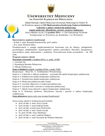 Zakład Onkologii i Opieki Paliatywnej Uniwersytetu Medycznego im. Piastów Śl. we Wrocławiu zaprasza na XII Międzynarodową Konferencję Naukowo-Szkoleniową Człowiek w opiece i medycynie paliatywnej. Aspekt medyczny, filozoficzny, etyczny, prawny i kulturowy, która odbędzie się dn. 1-3 grudnia 2016 r. w Auli Papieskiego Wydziału Teologicznego we Wrocławiu, pl. Katedralny 1 we Wrocławiu. Kierownictwo naukowe konferencji: - dr hab. n. med. Bernarda Kazanowska, prof. nadzw. - dr n. med. Eleonora Mess Przedsięwzięcie o zasięgu międzynarodowym kierowane jest do lekarzy, pielęgniarek, psychologów, rehabilitantów, fizjoterapeutów, etyków, prawników, filozofów, duszpasterzy, pracowników nauki, doktorantów i studentów. Przewidywana liczba uczestników – ok. 300 osób. Program ramowy obrad: Warsztaty (czwartek 1 grudnia 2016 r. o godz. 16:00) 1. Leczenie ran. 2. Stymulacja Bazalna Paliatywna. 3. Obrzęk limfatyczny. Sesje wykładowe (piątek 2 grudnia 2016r. o godz. 9:00) Rozpoczęcie – Msza Św. w Archikatedrze Wrocławskiej. Sesja nr 1: Człowiek w obliczu cierpienia – wyzwania dla opieki hospicyjnej i paliatywnej. Sesja nr 2: Pediatryczna opieka hospicyjna i paliatywna. Sesja nr 3: Geriatryczna opieka hospicyjna i paliatywna. Sesja nr 4: Medycyna paliatywna jako sztuka. Sesja nr 5: Leczenie objawowe w medycynie paliatywnej. Sesja nr 6: Leczenie bólu i nowości w medycynie paliatywnej. Sesja nr 7: Jakość życia chorych w opiece hospicyjnej i paliatywnej. Sesja nr 8: Dylematy duchowe, filozoficzne, etyczne i prawne w opiece hospicyjnej i paliatywnej. Sesja plakatowa (przez cały czas trwania Konferencji) Swój czynny udział w konferencji potwierdzili: prof. dr hab. n. med. Jerzy Leszek prof. dr hab. n. med.Andrzej Szuba prof. dr hab. n.med Laura Wołowicka prof. dr hab. n. med. Jacek Łuczak ks. prof. dr hab. Jerzy Machnacz prof. dr hab. n. med. Andrzej Gładysz prof. dr hab. n. med. Krystyna de Walden-Gałuszko Korespondencja: Uniwersytet Medyczny im. Piastów Śląskich we Wrocławiu Zakład Onkologii i Opieki Paliatywnej 51-618 Wrocław ul. Bartla 5 Obsługa sekretariatu konferencji: Pamela Mess, tel.:502 341 293 e-mail:[email protected] prof. dr hab. n. med. Mikołaj Majkowicz prof. dr hab. Aleksander Woźny prof. dr hab. Dariusz Patrzałek prof. dr hab. Jarosław Barański prof. Krzysztof Zanussi dr hab. n med. Wojciech Leppert dr n. med. Anna Sawińska dr Helena Kisvetrová dr n. med. Anna Orońska dr n. med. Marcin Świerad dr n. med. Krzysztof Szmyd dr Lenka Machálková mgr Zdena Mikšová Konferencja międzynarodowa jest organizowana cyklicznie od 2005 roku w celach wymiany doświadczeń naukowych i szkoleniowych w odniesieniu do poprawy jakości życia chorych dzieci i dorosłych objętych w Polsce opieką hospicyjno-paliatywną. Konferencja ta skupia co roku wielu wybitnych specjalistów medycyny, którzy mogą w ten sposób podzielić się swoimi doświadczeniami. Korespondencja: Uniwersytet Medyczny im. Piastów Śląskich we Wrocławiu Zakład Onkologii i Opieki Paliatywnej 51-618 Wrocław ul. Bartla 5 Obsługa sekretariatu konferencji: Pamela Mess, tel.:502 341 293 e-mail:[email protected]