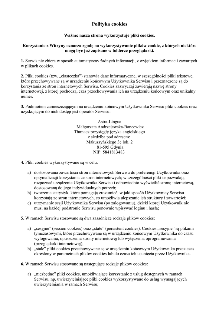 Polityka cookies Ważne: nasza strona wykorzystuje pliki cookies. Korzystanie z Witryny oznacza zgodę na wykorzystywanie plików cookie, z których niektóre mogą być już zapisane w folderze przeglądarki. 1. Serwis nie zbiera w sposób automatyczny żadnych informacji, z wyjątkiem informacji zawartych w plikach cookies. 2. Pliki cookies (tzw. „ciasteczka”) stanowią dane informatyczne, w szczególności pliki tekstowe, które przechowywane są w urządzeniu końcowym Użytkownika Serwisu i przeznaczone są do korzystania ze stron internetowych Serwisu. Cookies zazwyczaj zawierają nazwę strony internetowej, z której pochodzą, czas przechowywania ich na urządzeniu końcowym oraz unikalny numer. 3. Podmiotem zamieszczającym na urządzeniu końcowym Użytkownika Serwisu pliki cookies oraz uzyskującym do nich dostęp jest operator Serwisu: Astra-Lingua Małgorzata Andrzejewska-Bancewicz Tłumacz przysięgły języka angielskiego z siedzibą pod adresem: Makuszyńskiego 3c lok. 2 81-595 Gdynia NIP: 5841813483 4. Pliki cookies wykorzystywane są w celu: a) dostosowania zawartości stron internetowych Serwisu do preferencji Użytkownika oraz optymalizacji korzystania ze stron internetowych; w szczególności pliki te pozwalają rozpoznać urządzenie Użytkownika Serwisu i odpowiednio wyświetlić stronę internetową, dostosowaną do jego indywidualnych potrzeb; b) tworzenia statystyk, które pomagają zrozumieć, w jaki sposób Użytkownicy Serwisu korzystają ze stron internetowych, co umożliwia ulepszanie ich struktury i zawartości; c) utrzymanie sesji Użytkownika Serwisu (po zalogowaniu), dzięki której Użytkownik nie musi na każdej podstronie Serwisu ponownie wpisywać loginu i hasła; 5. W ramach Serwisu stosowane są dwa zasadnicze rodzaje plików cookies: a) „sesyjne” (session cookies) oraz „stałe” (persistent cookies). Cookies „sesyjne” są plikami tymczasowymi, które przechowywane są w urządzeniu końcowym Użytkownika do czasu wylogowania, opuszczenia strony internetowej lub wyłączenia oprogramowania (przeglądarki internetowej); b) „stałe” pliki cookies przechowywane są w urządzeniu końcowym Użytkownika przez czas określony w parametrach plików cookies lub do czasu ich usunięcia przez Użytkownika. 6. W ramach Serwisu stosowane są następujące rodzaje plików cookies: a) „niezbędne” pliki cookies, umożliwiające korzystanie z usług dostępnych w ramach Serwisu, np. uwierzytelniające pliki cookies wykorzystywane do usług wymagających uwierzytelniania w ramach Serwisu; b) pliki cookies służące do zapewnienia bezpieczeństwa, np. wykorzystywane do wykrywania nadużyć w zakresie uwierzytelniania w ramach Serwisu; c) „wydajnościowe” pliki cookies, umożliwiające zbieranie informacji o sposobie korzystania ze stron internetowych Serwisu; d) „funkcjonalne” pliki cookies, umożliwiające „zapamiętanie” wybranych przez Użytkownika ustawień i personalizację interfejsu Użytkownika, np. w zakresie wybranego języka lub regionu, z którego pochodzi Użytkownik, rozmiaru czcionki, wyglądu strony internetowej itp.; e) „reklamowe” pliki cookies, umożliwiające dostarczanie Użytkownikom treści reklamowych bardziej dostosowanych do ich zainteresowań. 7. W wielu przypadkach oprogramowanie służące do przeglądania stron internetowych (przeglądarka internetowa) domyślnie dopuszcza przechowywanie plików cookies w urządzeniu końcowym Użytkownika. Użytkownicy Serwisu mogą dokonać w każdym czasie zmiany ustawień dotyczących plików cookies. Ustawienia te mogą zostać zmienione w szczególności w taki sposób, aby blokować automatyczną obsługę plików cookies w ustawieniach przeglądarki internetowej bądź informować o ich każdorazowym zamieszczeniu w urządzeniu Użytkownika Serwisu. Szczegółowe informacje o możliwości i sposobach obsługi plików cookies dostępne są w ustawieniach oprogramowania (przeglądarki internetowej). 8. Operator Serwisu informuje, że ograniczenia stosowania plików cookies mogą wpłynąć na niektóre funkcjonalności dostępne na stronach internetowych Serwisu. 9. Pliki cookies zamieszczane w urządzeniu końcowym Użytkownika Serwisu i wykorzystywane mogą być również przez współpracujących z operatorem Serwisu reklamodawców oraz partnerów. 10. Więcej informacji na temat plików cookies dostępnych jest pod adresem http://www.wszystkoociasteczkach.pl lub w sekcji „Pomoc” w menu przeglądarki internetowej.