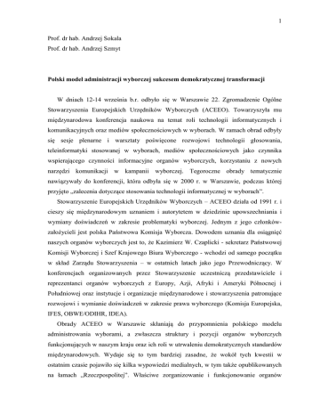 1 Prof. dr hab. Andrzej Sokala Prof. dr hab. Andrzej Szmyt Polski model administracji wyborczej sukcesem demokratycznej transformacji W dniach 12-14 września b.r. odbyło się w Warszawie 22. Zgromadzenie Ogólne Stowarzyszenia Europejskich Urzędników Wyborczych (ACEEO). Towarzyszyła mu międzynarodowa konferencja naukowa na temat roli technologii informatycznych i komunikacyjnych oraz mediów społecznościowych w wyborach. W ramach obrad odbyły się sesje plenarne i warsztaty poświęcone rozwojowi technologii głosowania, teleinformatyki stosowanej w wyborach, mediów społecznościowych jako czynnika wspierającego czynności informacyjne organów wyborczych, korzystaniu z nowych narzędzi komunikacji w kampanii wyborczej. Tegoroczne obrady tematycznie nawiązywały do konferencji, która odbyła się w 2000 r. w Warszawie, podczas której przyjęto „zalecenia dotyczące stosowania technologii informatycznej w wyborach”. Stowarzyszenie Europejskich Urzędników Wyborczych – ACEEO działa od 1991 r. i cieszy się międzynarodowym uznaniem i autorytetem w dziedzinie upowszechniania i wymiany doświadczeń w zakresie problematyki wyborczej. Jednym z jego członkówzałożycieli jest polska Państwowa Komisja Wyborcza. Dowodem uznania dla osiągnięć naszych organów wyborczych jest to, że Kazimierz W. Czaplicki - sekretarz Państwowej Komisji Wyborczej i Szef Krajowego Biura Wyborczego - wchodzi od samego początku w skład Zarządu Stowarzyszenia – w ostatnich latach jako jego Przewodniczący. W konferencjach organizowanych przez Stowarzyszenie uczestniczą przedstawiciele i reprezentanci organów wyborczych z Europy, Azji, Afryki i Ameryki Północnej i Południowej oraz instytucje i organizacje międzynarodowe i stowarzyszenia patronujące rozwojowi i wymianie doświadczeń w zakresie prawa wyborczego (Komisja Europejska, IFES, OBWE/ODIHR, IDEA). Obrady ACEEO w Warszawie skłaniają do przypomnienia polskiego modelu administrowania wyborami, a zwłaszcza struktury i pozycji organów wyborczych funkcjonujących w naszym kraju oraz ich roli w utrwaleniu demokratycznych standardów międzynarodowych. Wydaje się to tym bardziej zasadne, że wokół tych kwestii w ostatnim czasie pojawiło się kilka wypowiedzi medialnych, w tym także opublikowanych na łamach „Rzeczpospolitej”. Właściwe zorganizowanie i funkcjonowanie organów 2 wyborczych jest bowiem istotnym elementem demokratycznego państwa prawnego, stanowiąc ważną gwarancję zgodności przeprowadzenia wyborów z obowiązującym prawem oraz wolą wyborców. Sprzyja to niewątpliwie wzrostowi zaufania obywateli do państwa i kształtowania się społeczeństwa obywatelskiego. Zacznijmy od kilku pytań: kto w Polsce przygotowuje i przeprowadza wybory? Kto liczy głosy i ustala wyniki głosowania i wyborów? Czy proces wyborczy, a zwłaszcza działania organów wyborczych, podlegają jakiejś kontroli? Czy prawna pozycja tych organów pozwala im wykonywać zadania wyborcze bez ingerencji i nacisków politycznych, czy też tego rodzaju niezależności prawo im nie zapewnia? Odpowiedzi na te właśnie pytania – bez wątpienia kluczowe dla oceny polskiego systemu wyborczego i praktyki wyborczej – spróbujemy udzielić w niniejszym tekście. Pozwolą one także na ocenę, czy polski model administrowania wyborami spełnia niezbędne wymogi wynikające z uznanych standardów międzynarodowych w sprawach wyborczych, co jest podstawowym warunkiem uznania wyborów przeprowadzanych w naszym kraju za demokratyczne. Obecnie funkcjonująca – budowana konsekwentnie od ponad 20 lat – polska administracja wyborcza (rozumiana jako zespół organów wyborczych, a więc organów odpowiedzialnych za przygotowanie, organizację i przeprowadzanie wyborów) tworzy hierarchicznie zbudowaną, kilkupoziomową i mocno rozgałęzioną strukturę. Składają się nań organy o bardzo różnym charakterze: kolegialne i jednoosobowe, zawodowe i społeczne, stałe i powoływane tylko na potrzeby konkretnych, zarządzonych już wyborów. Konkretny kształt i liczebność administracji wyborczej zależy od rodzaju wyborów. Dla przykładu wybory na urząd Prezydenta RP w 2010 r. przygotowały i przeprowadziły: Państwowa Komisja Wyborcza, 49 rejonowych komisji wyborczych oraz ponad 25.000 obwodowych komisji wyborczych. W sumie w skład wszystkich tych organów wchodzi w charakterze członków – z czego mało kto na ogół zdaje sobie sprawę – sporo ponad 200.000 osób, przy czym zawodowy aparat wyborczy, którego rola jest bez wątpienia kluczowa, jest stosunkowo nieliczny (liczy on kilkaset osób), co w nieznacznym stopniu obciąża budżet państwa. Najwyższym organem wyborczym w odniesieniu do wszystkich przeprowadzanych w naszym kraju wyborów jest Państwowa Komisja Wyborcza (dalej PKW). Jest to organ o charakterze stałym, a więc działający w permanencji. W jego skład wchodzi 9 sędziów: 3 sędziów Trybunału Konstytucyjnego wskazanych przez Prezesa tegoż Trybunału, 3 3 sędziów Sądu Najwyższego wskazanych przez Prezesa tego Sądu oraz 3 sędziów Naczelnego Sądu Administracyjnego wskazanych przez Prezesa NSA. Sędziów tych powołuje w skład PKW Prezydent Rzeczypospolitej w drodze postanowienia. Wygaśnięcie członkostwa w PKW następuje jedynie w przypadkach określonych w ustawie - np wskutek zrzeczenia się członkostwa, podpisania zgody na kandydowanie w wyborach, śmierci członka Komisji i odwołania przez Prezydenta RP na uzasadniony wniosek prezesa, który wskazał sędziego jako członka Komisji. W gruncie rzeczy zatem skład PKW jest stabilny - dający Komisji mocną i niezależną pozycję, choć podkreślić wypada, że podstawy funkcjonowania PKW określa tylko Kodeks wyborczy, a więc ustawa zwykła, którą łatwo zmienić - Państwowa Komisja Wyborcza nie ma bowiem, co należy ocenić krytycznie, umocowania konstytucyjnego, a to w istocie gwarantowałoby jej pełną niezależność. Podkreś