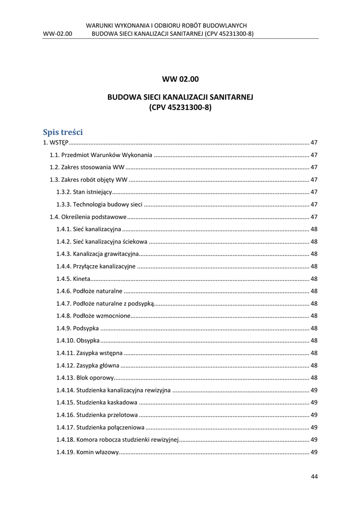 WW-02.00 WARUNKI WYKONANIA I ODBIORU ROBÓT BUDOWLANYCH BUDOWA SIECI KANALIZACJI SANITARNEJ (CPV 45231300-8) WW 02.00 BUDOWA SIECI KANALIZACJI SANITARNEJ (CPV 45231300-8) Spis treści 1. WSTĘP................................................................................................................................................ 47 1.1. Przedmiot Warunków Wykonania ............................................................................................. 47 1.2. Zakres stosowania WW .............................................................................................................. 47 1.3. Zakres robót objęty WW ............................................................................................................ 47 1.3.2. Stan istniejący...................................................................................................................... 47 1.3.3. Technologia budowy sieci ................................................................................................... 47 1.4. Określenia podstawowe ............................................................................................................. 47 1.4.1. Sieć kanalizacyjna ................................................................................................................ 48 1.4.2. Sieć kanalizacyjna ściekowa ................................................................................................ 48 1.4.3. Kanalizacja grawitacyjna...................................................................................................... 48 1.4.4. Przyłącze kanalizacyjne ....................................................................................................... 48 1.4.5. Kineta................................................................................................................................... 48 1.4.6. Podłoże naturalne ............................................................................................................... 48 1.4.7. Podłoże naturalne z podsypką............................................................................................. 48 1.4.8. Podłoże wzmocnione........................................................................................................... 48 1.4.9. Podsypka ............................................................................................................................. 48 1.4.10. Obsypka ............................................................................................................................. 48 1.4.11. Zasypka wstępna ............................................................................................................... 48 1.4.12. Zasypka główna ................................................................................................................. 48 1.4.13. Blok oporowy..................................................................................................................... 48 1.4.14. Studzienka kanalizacyjna rewizyjna .................................................................................. 49 1.4.15. Studzienka kaskadowa ...................................................................................................... 49 1.4.16. Studzienka przelotowa ...................................................................................................... 49 1.4.17. Studzienka połączeniowa .................................................................................................. 49 1.4.18. Komora robocza studzienki rewizyjnej .............................................................................. 49 1.4.19. Komin włazowy.................................................................................................................. 49 44 WW-02.00 WARUNKI WYKONANIA I ODBIORU ROBÓT BUDOWLANYCH BUDOWA SIECI KANALIZACJI SANITARNEJ (CPV 45231300-8) 1.4.20. Płyta przykrycia studzienki lub komory ............................................................................. 49 1.4.21. Spocznik ............................................................................................................................. 49 2. MATERIAŁY. ....................................................................................................................................... 49 2.1. Ogólne wymagania ..................................................................................................................... 49 2.1.1. Sposób montażu .................................................................................................................. 49 2.1.2. Kolizje i skrzyżowania. ......................................................................................................... 50 2.2. Rury i kształtki kanalizacyjne PVC............................................................................................... 50 2.3. Studnie rewizyjne ....................................................................................................................... 50 2.4. Inne materiały ............................................................................................................................ 51 2.5. Składowanie materiałów ............................................................................................................ 51 2.5.1. Rury przewodowe i ochronne ............................................................................................. 51 2.5.2. Kruszywo ............................................................................................................................. 51 2.5.3. Cement ................................................................................................................................ 51 3. SPRZĘT. .............................................................................................................................................. 52 3.1. Ogólne wymagania dotyczące sprzętu ....................