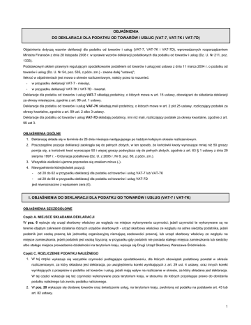 OBJAŚNIENIA DO DEKLARACJI DLA PODATKU OD TOWARÓW I USŁUG (VAT-7, VAT-7K i VAT-7D) Objaśnienia dotyczą wzorów deklaracji dla podatku od towarów i usług (VAT-7, VAT-7K i VAT-7D), wprowadzonych rozporządzeniem Ministra Finansów z dnia 28 listopada 2008 r. w sprawie wzorów deklaracji podatkowych dla podatku od towarów i usług (Dz. U. Nr 211, poz. 1333). Podstawowym aktem prawnym regulującym opodatkowanie podatkiem od towarów i usług jest ustawa z dnia 11 marca 2004 r. o podatku od towarów i usług (Dz. U. Nr 54, poz. 535, z późn. zm.) - zwana dalej "ustawą"; Ilekroć w objaśnieniach jest mowa o okresie rozliczeniowym, należy przez to rozumieć: - w przypadku deklaracji VAT-7 - miesiąc, - w przypadku deklaracji VAT-7K i VAT-7D - kwartał. Deklaracje dla podatku od towarów i usług VAT-7 składają podatnicy, o których mowa w art. 15 ustawy, obowiązani do składania deklaracji za okresy miesięczne, zgodnie z art. 99 ust. 1 ustawy. Deklaracje dla podatku od towarów i usług VAT-7K składają mali podatnicy, o których mowa w art. 2 pkt 25 ustawy, rozliczający podatek za okresy kwartalne, zgodnie z art. 99 ust. 2 albo 3 ustawy. Deklaracje dla podatku od towarów i usług VAT-7D składają podatnicy, inni niż mali, rozliczający podatek za okresy kwartalne, zgodnie z art. 99 ust 3. OBJAŚNIENIA OGÓLNE 1. Deklarację składa się w terminie do 25 dnia miesiąca następującego po każdym kolejnym okresie rozliczeniowym. 2. Poszczególne pozycje deklaracji zaokrągla się do pełnych złotych, w ten sposób, że końcówki kwoty wynoszące mniej niż 50 groszy pomija się, a końcówki kwot wynoszące 50 i więcej groszy podwyższa się do pełnych złotych, zgodnie z art. 63 § 1 ustawy z dnia 29 sierpnia 1997 r. - Ordynacja podatkowa (Dz. U. z 2005 r. Nr 8, poz. 60, z późn. zm.). 3. Wszystkie wielkości ujemne poprzedza się znakiem minus (-). 4. Niewypełnienie którejkolwiek pozycji: - od 20 do 62 w przypadku deklaracji dla podatku od towarów i usług VAT-7 lub VAT-7K - od 20 do 68 w przypadku deklaracji dla podatku od towarów i usług VAT-7D jest równoznaczne z wpisaniem zera (0). I. OBJAŚNIENIA DO DEKLARACJI DLA PODATKU OD TOWARÓW I USŁUG (VAT-7 i VAT-7K) OBJAŚNIENIA SZCZEGÓŁOWE Część A. MIEJSCE SKŁADANIA DEKLARACJI W poz. 6 wpisuje się urząd skarbowy właściwy ze względu na miejsce wykonywania czynności; jeżeli czynności te wykonywane są na terenie objętym zakresem działania różnych urzędów skarbowych - urząd skarbowy właściwy ze względu na adres siedziby podatnika, jeżeli podatnik jest osobą prawną lub jednostką organizacyjną niemającą osobowości prawnej, lub urząd skarbowy właściwy ze względu na miejsce zamieszkania, jeżeli podatnik jest osobą fizyczną; w przypadku gdy podatnik nie posiada stałego miejsca zamieszkania lub siedziby albo stałego miejsca prowadzenia działalności na terytorium kraju, wpisuje się Drugi Urząd Skarbowy Warszawa-Śródmieście. Część C. ROZLICZENIE PODATKU NALEŻNEGO 1. W tej części wykazuje się wszystkie czynności podlegające opodatkowaniu, dla których obowiązek podatkowy powstał w okresie rozliczeniowym, za który składana jest deklaracja, po uwzględnieniu korekt wynikających z art. 29 ust. 4 ustawy, oraz innych korekt wynikających z przepisów o podatku od towarów i usług, jeżeli mają wpływ na rozliczenie w okresie, za który składana jest deklaracja. W tej części wykazuje się też czynności wykonywane poza terytorium kraju, w stosunku do których przysługuje prawo do obniżenia podatku należnego lub zwrotu podatku naliczonego. 2. W poz. 20 wykazuje się dostawę towarów oraz świadczenie usług, na terytorium kraju, zwolnioną od podatku na podstawie art. 43 lub art. 82 ustawy. 1 3. W poz. 21 wykazuje się dostawę towarów oraz świadczenie usług poza terytorium kraju, w stosunku do których przysługuje podatnikowi prawo do obniżenia kwoty podatku należnego, o którym mowa w art. 86 ust. 8 pkt 1 ustawy, lub prawo do zwrotu kwoty podatku naliczonego, o którym mowa w art. 87 ust 5 ustawy. 4. W poz. 30 wykazuje się wewnątrzwspólnotową dostawę towarów, o której mowa w art. 13 ustawy, jeżeli podatnik został zarejestrowany jako podatnik VAT UE zgodnie z art. 97 ustawy. 5. W poz. 32 wykazuje się wartość wewnątrzwspólnotowego nabycia towarów, obliczoną zgodnie z art. 31 ustawy. Suma kwot wykazanych w okresie jednego kwartału będzie porównywana z wartością wewnątrzwspólnotowych nabyć towarów wykazaną w informacji podsumowującej. W pozycji tej należy również wykazać wewnątrzwspólnotowe nabycie towarów, o którym mowa w art. 138 ust. 1 pkt 2 lit. a ustawy (dane te wykazuje ostatni w kolejności podatnik rozliczający się w wewnątrzwspólnotowej transakcji trójstronnej wg procedury uproszczonej). Również w tej pozycji uwzględnia się wewnątrzwspólnotowe nabycie towarów, o którym mowa w art. 136 ustawy (dane dotyczące wawnątrzwspólnotowego nabycia towarów, które zostało uznane za opodatkowane na terytorium kraju na podstawie zastosowania w wewnątrzwspólnotowej transakcji trójstronnej procedury uproszczonej, podaje drugi w kolejności podatnik rozliczający się w tej transakcji wg procedury uproszczonej). 6. W poz. 33 wykazuje się łączną wartość podatku należnego od wewnątrzwspólnotowego nabycia towarów, obliczoną wg obowiązujących stawek, z wyłączeniem transakcji, o których mowa w art. 136 ustawy. 7. W poz. 34 i 35 wykazuje się łączną kwotę podstawy opodatkowania importu towarów i podatku należnego od tego importu, wyłącznie w przypadku wyboru przez podatnika rozliczenia podatku należnego z tytułu importu towarów w deklaracji podatkowej, zgodnie z art. 33a ustawy. 8. Poz. 38 i 39 wypełnia nabywca towarów, jeżeli dokonującym dostawy na terytorium kraju jest podatnik nieposiadający siedziby, stałego miejsca prowadzenia działalności lub stałego miejsca zamieszkania na t