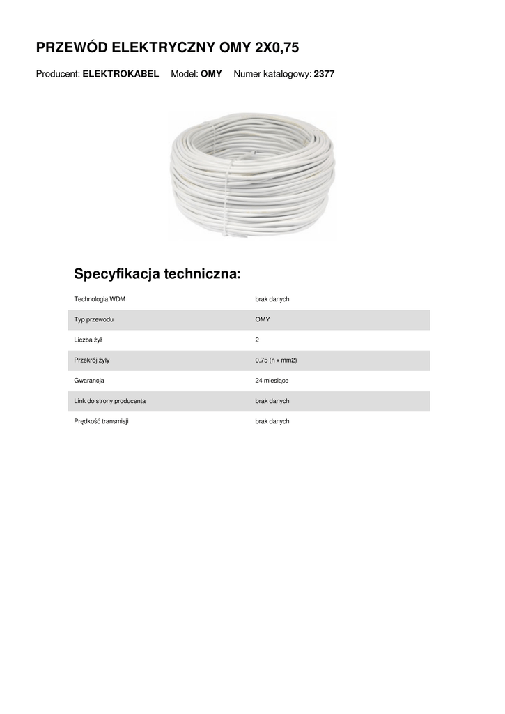 PRZEWÓD ELEKTRYCZNY OMY 2X0,75 Producent: ELEKTROKABEL Model: OMY Numer katalogowy: 2377 Specyfikacja techniczna: Technologia WDM brak danych Typ przewodu OMY Liczba żył 2 Przekrój żyły 0,75 (n x mm2) Gwarancja 24 miesiące Link do strony producenta brak danych Prędkość transmisji brak danych
