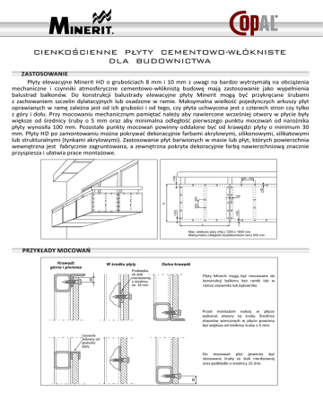 >100 ZASTOSOWANIE Płyty elewacyjne Minerit HD o grubościach 8 mm i 10 mm z uwagi na bardzo wytrzymałą na obciążenia mechaniczne i czynniki atmosferyczne cementowo-włóknistą budowę mają zastosowanie jako wypełnienia balustrad balkonów. Do konstrukcji balustrady elewacyjne płyty Minerit mogą być przykręcane śrubami z zachowaniem szczelin dylatacyjnych lub osadzone w ramie. Maksymalna wielkość pojedynczych arkuszy płyt oprawianych w ramę zależna jest od ich grubości i od tego, czy płyta uchwycona jest z czterech stron czy tylko z góry i dołu. Przy mocowaniu mechanicznym pamiętać należy aby nawiercone wcześniej otwory w płycie były większe od średnicy śruby o 5 mm oraz aby minimalna odległość pierwszego punktu mocowań od narożnika płyty wynosiła 100 mm. Pozostałe punkty mocowań powinny oddalone być od krawędzi płyty o minimum 30 mm. Płyty HD po zamontowaniu można pokrywać dekoracyjnie farbami akrylowymi, silikonowymi, silikatowymi lub strukturalnymi (tynkami akrylowymi). Zastosowanie płyt barwionych w masie lub płyt, których powierzchnia wewnętrzna jest fabrycznie zagruntowana, a zewnętrzna pokryta dekoracyjnie farbą nawierzchniową znacznie przyspiesza i ułatwia prace montażowe. >30 200 - 300 >30 >100 H 200 - 300 >30 L Max. wielkość płyty (HxL) 1200 x 1800 mm. Maksymalna odległość kształtowników ramy 500 mm PRZYKŁADY MOCOWAŃ Krawędź górna i pionowa 30 W środku płyty Dolna krawędź Podkładka ze stali nierdzewnej o średnicy ok. 35 mm Płyty Minerit mogą być mocowane do konstrukcji balkonu bez ramki lub w ramce ceownika lub kątownika Przed montażem należy w płycie wykonać otwory na śruby. Średnica otworów wierconych w płycie powinna być większa od średnicy śruby o 5 mm. Ceownik dobrany do grubości płyty 30 Do mocowań płyt powinny być stosowane śruby ze stali nierdzewnej oraz podkładki o średnicy 15 mm. HD 8 mm bxh 1200 x 1200 HD 10 mm bxh 1200 x 1200 HD 8 mm bxh 1200 x 600 HD 10 mm bxh 1200 x 800 HD 12 mm bxh 1200 x 1200 20 Maksymalny wymiar płyty balkonowej osadzonej w ramie od góry i z dołu h Maksymalny wymiar płyty balkonowej oprawionej w pełnej ramie (z 4 stron). h masa uszczelniająca 20 b b BALUSTRADY GIETE Płyty można również montować do konstrukcji balustrad łukowych. Łuki o dużym promieniu uzyskuje się poprzez naprężenie płaskich płyt o grubości 8 lub 10 mm. Minimalny promień gięcia płyty o grubości 8 mm wynosi 3 600 mm. Pokrycie na balustrady o małym promieniu (od 1 600 mm) uzyskać możemy ze sklejonych dwóch płyt Minerit o grubości 3,2 mm. R mi n= 16 0 0m m Łącznik TTS z nakrętką TTN-A i podkładką stal/EPDM Uwaga: przed zamontowaniem nakrętki TTN-A, otwór w płycie pokryć warstwą rozdzielającą farby. Dystrybutor: Copal Sp. z o.o. 64-980 Trzcianka ul. Sikorskiego 78 tel. 67 216 67 67, fax 67 216 40 83 e-mail: [email protected] www.copal.com.pl ~8mm