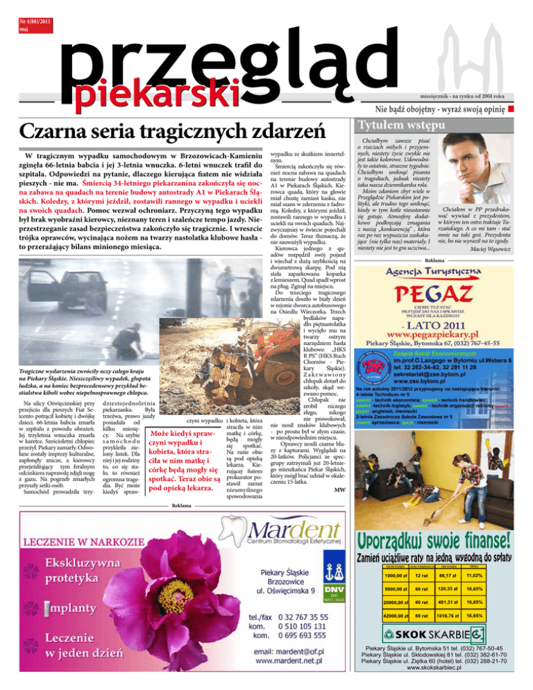 Nr 4(88)/2011 maj Czarna seria tragicznych zdarzeń W tragicznym wypadku samochodowym w Brzozowicach-Kamieniu zginęła 66-letnia babcia i jej 3-letnia wnuczka. 6-letni wnuczek trafił do szpitala. Odpowiedzi na pytanie, dlaczego kierująca fiatem nie widziała pieszych - nie ma. Śmiercią 34-letniego piekarzanina zakończyła się nocna zabawa na quadach na terenie budowy autostrady A1 w Piekarach Śląskich. Koledzy, z którymi jeździł, zostawili rannego w wypadku i uciekli na swoich quadach. Pomoc wezwał ochroniarz. Przyczyną tego wypadku był brak wyobraźni kierowcy, nieznany teren i szaleńcze tempo jazdy. Nieprzestrzeganie zasad bezpieczeństwa zakończyło się tragicznie. I wreszcie trójka oprawców, wycinająca nożem na twarzy nastolatka klubowe hasła to przerażąjący bilans minionego miesiąca. Tragiczne wydarzenia zwróciły oczy całego kraju na Piekary Śląskie. Nieszczęśliwy wypadek, głupota ludzka, a na koniec bezprecedensowy przykład bestialstwa kiboli wobec niepełnosprawnego chłopca. Na ulicy Oświęcimskiej przy przejściu dla pieszych Fiat Seicento potrącił kobietę i dwójkę dzieci. 66-letnia babcia zmarła w szpitalu z powodu obrażeń. Jej trzyletnia wnuczka zmarła w karetce. Sześcioletni chłopiec przeżył. Piekary zamarły. Odwołane zostały imprezy kulturalne, zapłonęły znicze, a kierowcy przejeżdżąjący tym feralnym odcinkiem naprawdę zdjęli nogę z gazu. Na pogrzeb zmarłych przyszły setki osób. Samochód prowadziła trzy- dziestojednoletnia piekarzanka. Była trzeźwa, prawo jazdy czyni wypadku posiadała od kilku miesięMoże kiedyś sprawcy. Na szybie s a m o c h o d u czyni wypadku i przykleiła zielony listek. Dla kobieta, która straniej i jej rodziny ciła w nim matkę i to, co się stało, to również córkę będą mogły się ogromna trage- spotkać. Teraz obie są dia. Być może pod opieką lekarza. kiedyś spraw- i kobieta, która straciła w nim matkę i córkę, będą mogły się spotkać. Na razie obie są pod opieką lekarza. Kierującej fiatem prokurator postawił zarzut nieumyślnego spowodowania wypadku ze skutkiem śmiertelnym. Śmiercią zakończyła się również nocna zabawa na quadach na terenie budowy autostrady A1 w Piekarach Śląskich. Kierowca quada, który na głowie miał chustę zamiast kasku, nie miał szans w zderzeniu z fadromą. Koledzy, z którymi jeździł, zostawili rannego w wypadku i uciekli na swoich quadach. Najzwyczajniej w świecie pojechali do domów. Teraz tłumaczą, że nie zauważyli wypadku. Kierowca jednego z quadów rozpędził swój pojazd i wjechał z dużą szybkością na dwumetrową skarpę. Pod nią stała zaparkowana koparka z lemieszem. Quad spadł wprost na pług. Zginął na miejscu. Do trzeciego tragicznego zdarzenia doszło w biały dzień w rejonie dworca autobusowego na Osiedlu Wieczorka. Trzech bydlaków napadło piętnastolatka i wycięło mu na twarzy ostrym narzędziem hasła klubowe: „HKS R PS” (HKS Ruch Chorzów - Piekary Śląskie). Z akr wawiony chłopak dotarł do szkoły, skąd wezwano pomoc. Chłopak nie zrobił niczego złego, nikogo nie prowokował, nie nosił znaków klubowych - po prostu był w złym czasie, w nieodpowiednim miejscu. Oprawcy nosili czarne bluzy z kapturami. Wyglądali na 20-latków. Policjanci ze specgrupy zatrzymali już 20-letniego mieszkańca Piekar Śląskich, który mógł brać udział w okaleczeniu 15-latka. MW Tytułem wstępu Chciałbym zawsze pisać o rzeczach miłych i przyjemnych, niestety życie zwykle nie jest takie kolorowe. Udowodniły to ostatnie, straszne tygodnie. Chciałbym uniknąć pisania o tragediach, jednak niestety taka nasza dziennikarska rola. Moim zdaniem zbyt wiele w Przeglądzie Piekarskim jest polityki, ale trudno tego uniknąć, kiedy w tym kotle nieustannie się gotuje. Atmosferę dodatkowo podkręcają zmagania z naszą „konkurencją” , która raz po raz wypuszcza zaskakujące (nie tylko nas) materiały. I niestety nie jest to gra uczciwa... Chciałem w PP przedrukować wywiad z prezydentem, w którym ten ostro traktuje Turzańskiego. A co mi tam - stać mnie na taki gest. Prezydenta nie, bo nie wyraził na to zgody. Maciej Wąsowicz Reklama Reklama Piekary Œl¹skie ul. Bytomska 51 tel. (032) 767-50-45 Piekary Œl¹skie ul. Sk³odowskiej 81 tel. (032) 382-61-70 Piekary Œl¹skie ul. Ziêtka 60 (hotel) tel. (032) 288-21-70 www.skokskarbiec.pl Reklama Gościnnie: Bezczynność? Nie... Zapraszamy do miejsca, które cieszy się już ponad dwudziestoletnią tradycją. W swej ofercie mamy głównie dania kuchni śląskiej, wzbogacone o ciekawe zestawy obiadowe. Ponadto możemy zaoferować szeroki wybór wyrobów garmażeryjnych oraz Fast Food. Oferujemy usługi cateringowe dla domu i Twojej firmy, w dowolnej formie i w dowolnie zaproponowanym miejscu. Znakomita kuchnia, aranżacja stołów oraz bardzo profesjonalna obsługa dostarczą niezapomnianych wrażeń estetycznych i smakowych. Więcej na naszej stronie www.bar-smak.pl Najw yższa ja koś ć , najl e pszy sma k, najniższ e c eny! Jeśli dysponujecie Państwo własnym miejscem, przyjedziemy, organizując przyjęcie na poziomie wykwintnej restauracji z profesjonalną obsługą. Dowozimy naczynia, stoły oraz krzesła. Zapewniamy dekorację materiałowo-florystyczną. W ofercie możliwość skomponowania indywidualnego menu wedle życzenia klienta. Zamówienia można odebrać także osobiście (duże zniżki). Przyjdź do nas i zapytaj! ZAPRASZAMY!!! BAR „SMAK” ul. Wyszyńskiego 28 41-940 Piekary Śląskie tel. 32 380-21-56 lub tel. 722-143-317 www.bar-smak.pl E-mail: [email protected] Zacząć powinienem chyba od tego, że tekst ten miał w ogóle nie powstać. „Szkoda zachodu na taką błazenadę” - pomyślałem po przeczytaniu wywiadu z Jaśnie Nam Panującym Stanisławem I Korfantym w ostatnim nr Głosu Piekarskiego. Lubię oglądać błazeńskie popisy, ale pod warunkiem, że odbywają się one w miejscu do tego przeznac