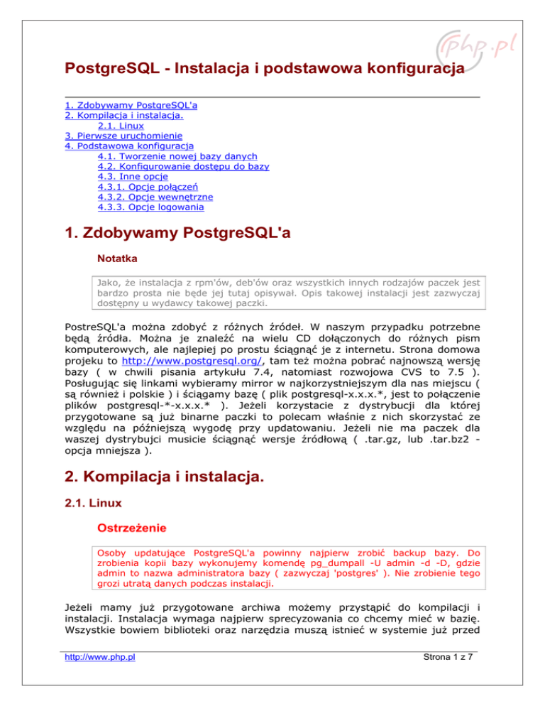 miejsce instalacji bazy ( osobiście polecam --prefix=/usr/local, PostgreSQL sam