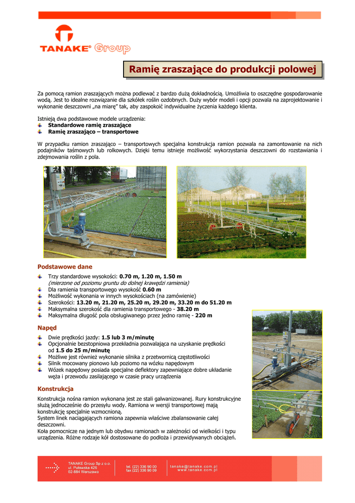 Ramię zraszające do produkcji polowej Za pomocą ramion zraszających moŜna podlewać z bardzo duŜą dokładnością. UmoŜliwia to oszczędne gospodarowanie wodą. Jest to idealne rozwiązanie dla szkółek roślin ozdobnych. DuŜy wybór modeli i opcji pozwala na zaprojektowanie i wykonanie deszczowni „na miarę” tak, aby zaspokoić indywidualne Ŝyczenia kaŜdego klienta. Istnieją dwa podstawowe modele urządzenia: Standardowe ramię zraszające Ramię zraszająco – transportowe W przypadku ramion zraszająco – transportowych specjalna konstrukcja ramion pozwala na zamontowanie na nich podajników taśmowych lub rolkowych. Dzięki temu istnieje moŜliwość wykorzystania deszczowni do rozstawiania i zdejmowania roślin z pola. Podstawowe dane Trzy standardowe wysokości: 0.70 m, 1.20 m, 1.50 m (mierzone od poziomu gruntu do dolnej krawędzi ramienia) Dla ramienia transportowego wysokość 0.60 m MoŜliwość wykonania w innych wysokościach (na zamówienie) Szerokości: 13.20 m, 21.20 m, 25.20 m, 29.20 m, 33.20 m do 51.20 m Maksymalna szerokość dla ramienia transportowego - 38.20 m Maksymalna długość pola obsługiwanego przez jedno ramię - 220 m Napęd Dwie prędkości jazdy: 1.5 lub 3 m/minutę Opcjonalnie bezstopniowa przekładnia pozwalająca na uzyskanie prędkości od 1.5 do 25 m/minutę MoŜliwe jest równieŜ wykonanie silnika z przetwornicą częstotliwości Silnik mocowany pionowo lub poziomo na wózku napędowym Wózek napędowy posiada specjalne deflektory zapewniające dobre układanie węŜa i przewodu zasilającego w czasie pracy urządzenia Konstrukcja Konstrukcja nośna ramion wykonana jest ze stali galwanizowanej. Rury konstrukcyjne słuŜą jednocześnie do przesyłu wody. Ramiona w wersji transportowej mają konstrukcję specjalnie wzmocnioną. System linek naciągających ramiona zapewnia właściwe zbalansowanie całej deszczowni. Koła pomocnicze na jednym lub obydwu ramionach w zaleŜności od wielkości i typu urządzenia. RóŜne rodzaje kół dostosowane do podłoŜa i przewidywanych obciąŜeń. Tor jazdy Jedna szyna wykonana z rury stalowej 1”. RóŜne sposoby mocowania w zaleŜności od podłoŜa, wielkości i typu urządzenia (pręty z łoŜem wbijane w ziemię, uchwyty do płytek chodnikowych, metalowe płyty z uchwytami) Zalecany spadek poprzeczny 1% w kierunku do toru jazdy. Maksymalny spadek wzdłuŜny 5%. Po obu stronach toru, po którym jeździ wózek napędowy, naleŜy wykonać wgłębienia, w których układać się będzie wąŜ i kabel zasilający. Zasilanie elektryczne 3x380V (5x2.5mm2) oraz wodne (rura o średnicy min. 1.5”) muszą być doprowadzone do środka pola. Dysze nawadniające W zaleŜności od rodzaju produkcji i wymagań, co do sposobu nawadniania moŜliwe jest zastosowanie wielu róŜnych urządzeń nawadniających. Na jednym ramieniu moŜe być zainstalowanych kilka róŜnych systemów z moŜliwością ich odłączania poprzez zawory ręczne. Rodzaje dysz: Dysze płaskostrumieniowe Dysze do oprysków Dysze prysznicowe Dysze zamgławiające Dysze brzegowe Wylewki Sterowanie Deszczownia wyposaŜona jest w panel sterujący zawierający następujące funkcje: niezaleŜne włączanie nawadniania dla lewego i prawego ramienia przełącznik wyboru szybkości jazdy 4-pozycyjny przełącznik trybu pracy pojedynczy przejazd przejazd tam i z powrotem przejazdy non-stop przejazd na podstawie sygnału zewnętrznego wyłącznik bezpieczeństwa WyposaŜenie opcjonalne moŜliwość zdalnego uruchamiania urządzenia poprzez kabel z przełącznikiem (ta opcja polecana jest szczególnie dla ramion zraszająco - transportowych) zegar do zaprogramowania czasów startu czujniki na podczerwień pozwalające na odcinanie nawadniania na wybranym odcinku, dla obydwu stron ramienia lub kaŜdego z osobna