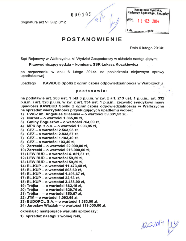 000105 Sygnatura akt Vl GUp 8/12 1 2 -02- 2014 L.dz. POSTANOWIENIE Dnia 6 lutego 2014r Sąd Rejonowy W Wałbrzychu, Vl Wydział Gospodarczy w składzie następującym Przewodniczący sędzia - komisarz SSR Łukasz Kozakiewicz po rozpoznaniu W dniu upadłościowej 6 lutego 2014r. na posiedzenĺu niejawnym sprawy upadłego KAWBUD Spółki z ograniczoną odpowiedzialnością w Wałbrzych'u postanawia: , i na podstawie art.206 ust. 1 pkt3 p.u.in. wzw. zart.2í3 ust. 1 p.u.in., art 332 p.u.in. i art. 326 p.u.in. w zW. z art.334 ust. í p.u.in., zezwolić syndykowi masy upadłościKAWBUD Spółki z ograniczoną odpowiedzialnością w Wałbrzychu na sprzed aż wierzytel nościprzysłu g ujących u padłem u wo bec : 1) PWsz im. Angelusa Silesiusa - o wartości 39.331 ,53 zł, 2| Nurbet - o wartości 1.865'06 zł, 3) Gminy Boguszów - o wartości 764,09 zł, 4| MPK Sp.z o.o. - o wartości í.993,85 zł, 5) cĘz - o wartośca 2.563,95 zł, 6) cEz - o wartości 2.833,57 zł, 7| cEz- o wartości1.103,49 zł, 8) cĘz- o wartości 103,40 zł, 9) Zarzecki - o wartości 22.000,00 zł, 'l0| Zarzecki _ o wartości 2í6.000'00 zł, 1 1) LEW BUD - o wartości 4. 821,81 zł, 12) LEW BUD - o wartości59,29 zł, 13) LEW BUD - o wartości59,29 zł, 14) EL_KUP - o wartości11.473,48 zł, 15) EL_KUP-owartośc 593'60 zł' í6) EL_KUP-owartośc 1.496,67 zł, 17) EL_KUP-owartośc 22,63 zł, 18) EL-KUP - o wartości 3.488,90 zł, 19) Trójka - o wartości 662,í5 zł, 20) Trójka - o wartości629,76 zł, 21) Trőjka - o wartości 850,67 zł, 22) JTM - o wartości 1.093'65 zł, 23) BUDOPOL s.A. - o wartości 1.383'00 zł, 24) Jarosław Wlaźlak - o wartości 119.000,00 zł, określającnastępujące waru nki sprze daży : 1) sprzedaż nasĘpi z wolnej ręki' ?epl 1 ' 2) sprzedaż obejmuje wymienione wyżei składniki majątku upadłego odrębnie jako całośćlub odrębnie, 3) sprzedaż nasĘpiza cenę najwyższą możliwą do uzyskania na rynku, jednak nie niższą ni 21.709,69 zł (dwadzieścia jeden ţsięcy siedemśetdźiewięć -Ż złotych 69/í00) - łącznie za wszystkie wierzytelności, 4) zawarcie umowy sprzedaży - o ile nie następuje w dniu złożeniaoferty - nastąpi w terminie jednego miesiąca od dnia wyboru oferty, 5) zapłata całościceny sprzedaży winna nasĘpić najpóźniej do dnia zawarcia umowy sprzedaży, 6) kupujący ponosi wszelkie koszţ zawarcia umowy sprzedaży, 7| wyłącza się uprawniania kupującego z tytułu rękojmi za wady prawne przedmiotu sprzedaży. /SS R Łu kas z Kozakiewiczt L i Lui 2Cl4 hmpLoüMŁ