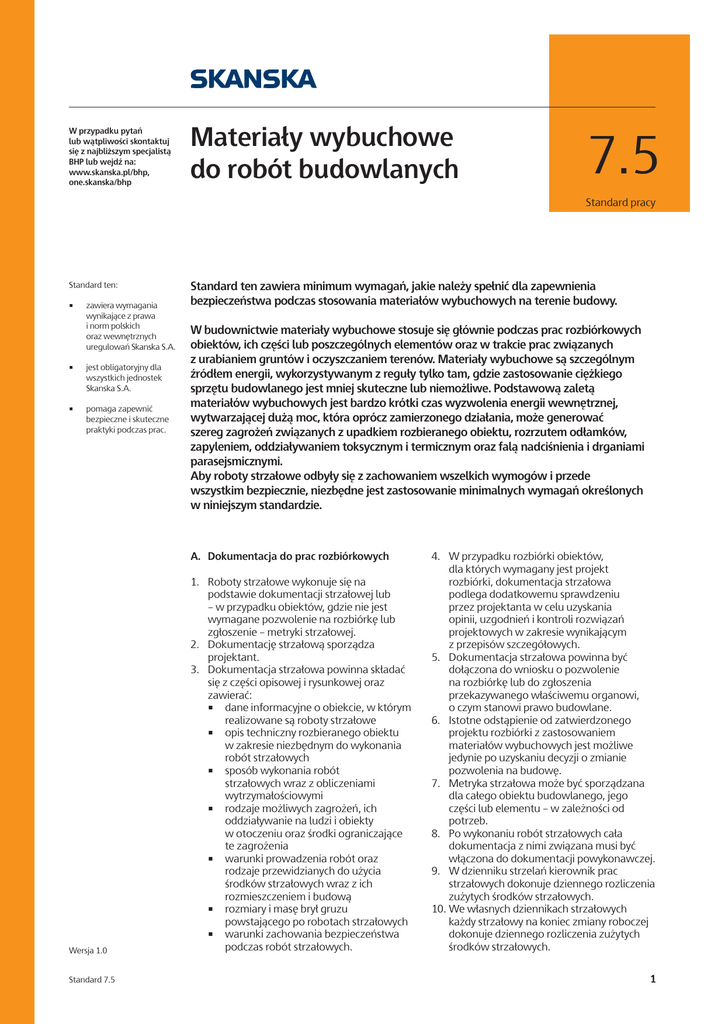 W przypadku pytań lub wątpliwości skontaktuj się z najbliższym specjalistą BHP lub wejdź na: www.skanska.pl/bhp, one.skanska/bhp Materiały wybuchowe do robót budowlanych 7.5 Standard pracy Standard ten: • zawiera wymagania wynikające z prawa i norm polskich oraz wewnętrznych uregulowań Skanska S.A. • jest obligatoryjny dla wszystkich jednostek Skanska S.A. • pomaga zapewnić bezpieczne i skuteczne praktyki podczas prac. Standard ten zawiera minimum wymagań, jakie należy spełnić dla zapewnienia bezpieczeństwa podczas stosowania materiałów wybuchowych na terenie budowy. W budownictwie materiały wybuchowe stosuje się głównie podczas prac rozbiórkowych obiektów, ich części lub poszczególnych elementów oraz w trakcie prac związanych z urabianiem gruntów i oczyszczaniem terenów. Materiały wybuchowe są szczególnym źródłem energii, wykorzystywanym z reguły tylko tam, gdzie zastosowanie ciężkiego sprzętu budowlanego jest mniej skuteczne lub niemożliwe. Podstawową zaletą materiałów wybuchowych jest bardzo krótki czas wyzwolenia energii wewnętrznej, wytwarzającej dużą moc, która oprócz zamierzonego działania, może generować szereg zagrożeń związanych z upadkiem rozbieranego obiektu, rozrzutem odłamków, zapyleniem, oddziaływaniem toksycznym i termicznym oraz falą nadciśnienia i drganiami parasejsmicznymi. Aby roboty strzałowe odbyły się z zachowaniem wszelkich wymogów i przede wszystkim bezpiecznie, niezbędne jest zastosowanie minimalnych wymagań określonych w niniejszym standardzie. A. Dokumentacja do prac rozbiórkowych Wersja 1.0 Standard 7.5 1. Roboty strzałowe wykonuje się na podstawie dokumentacji strzałowej lub – w przypadku obiektów, gdzie nie jest wymagane pozwolenie na rozbiórkę lub zgłoszenie – metryki strzałowej. 2. Dokumentację strzałową sporządza projektant. 3. Dokumentacja strzałowa powinna składać się z części opisowej i rysunkowej oraz zawierać: • dane informacyjne o obiekcie, w którym realizowane są roboty strzałowe • opis techniczny rozbieranego obiektu w zakresie niezbędnym do wykonania robót strzałowych • sposób wykonania robót strzałowych wraz z obliczeniami wytrzymałościowymi • rodzaje możliwych zagrożeń, ich oddziaływanie na ludzi i obiekty w otoczeniu oraz środki ograniczające te zagrożenia • warunki prowadzenia robót oraz rodzaje przewidzianych do użycia środków strzałowych wraz z ich rozmieszczeniem i budową • rozmiary i masę brył gruzu powstającego po robotach strzałowych • warunki zachowania bezpieczeństwa podczas robót strzałowych. 4. W przypadku rozbiórki obiektów, dla których wymagany jest projekt rozbiórki, dokumentacja strzałowa podlega dodatkowemu sprawdzeniu przez projektanta w celu uzyskania opinii, uzgodnień i kontroli rozwiązań projektowych w zakresie wynikającym z przepisów szczegółowych. 5. Dokumentacja strzałowa powinna być dołączona do wniosku o pozwolenie na rozbiórkę lub do zgłoszenia przekazywanego właściwemu organowi, o czym stanowi prawo budowlane. 6. Istotne odstąpienie od zatwierdzonego projektu rozbiórki z zastosowaniem materiałów wybuchowych jest możliwe jedynie po uzyskaniu decyzji o zmianie pozwolenia na budowę. 7. Metryka strzałowa może być sporządzana dla całego obiektu budowlanego, jego części lub elementu – w zależności od potrzeb. 8. Po wykonaniu robót strzałowych cała dokumentacja z nimi związana musi być włączona do dokumentacji powykonawczej. 9. W dzienniku strzelań kierownik prac strzałowych dokonuje dziennego rozliczenia zużytych środków strzałowych. 10. We własnych dziennikach strzałowych każdy strzałowy na koniec zmiany roboczej dokonuje dziennego rozliczenia zużytych środków strzałowych. 1 11. W książce obrotu środkami strzałowymi wydawca środków strzałowych prowadzi rejestr wydawanych i zwróconych materiałów wybuchowych oraz środków inicjujących. B. Działania przed rozpoczęciem robót strzałowych 1. Obowiązkiem inwestora jest pisemne zawiadomienie na siedem dni przed planowanym terminem rozpoczęcia robót strzałowych następujących organów: • powiatowego inspektora nadzoru budowlanego • właściwego komendanta policji • właścicieli lub zarządców sąsiednich nieruchomości • w miarę potrzeby właściwego komendanta Państwowej Straży Pożarnej • w miarę potrzeby właściwego komendanta straży miejskiej lub gminnej. 2. Teren, na którym będą prowadzone roboty strzałowe, powinien być wygrodzony i chroniony w sposób umożliwiający ścisłą kontrolę poruszających się osób i pojazdów. 3. Przy dojściach i drogach dojazdowych do terenu, na którym będą prowadzone roboty strzałowe, na wysokości nie mniejszej niż 2 m powinny być umieszczone tablice ostrzegawcze o wymiarach 0,8 x 1 m. 4. Urządzenia, instalacje i inne niż konstrukcje elementy budowlane, które mogą powodować obniżenie bezpieczeństwa robót strzałowych, powinny być usunięte i odłączone. 5. Przed przystąpieniem do wykonywania robót strzałowych wszystkie osoby znajdujące się w strefie rozrzutu należy powiadomić o terminie rozbiórki, a następnie zadbać, by opuściły strefę zagrożenia. Ponadto, trzeba usunąć rzeczy ruchome, narażone na uszkodzenie oraz urządzenia i instalacje, które mogłyby spowodować obniżenie bezpieczeństwa rozpoczynanych prac. 6. Przed przystąpieniem do prac strzałowych w konstrukcjach nawodnych należy zdemontować wyposażenie nabrzeży i pomostów. C. Działania podczas prowadzenia robót strzałowych 1. Wszystkie prace związane z robotami strzałowymi należy prowadzić na podstawie dokumentacji wymienionej w punkcie A1 niniejszego standardu, zwanej dokumentacją strzałową, oraz Planu Bezpieczeństwa, Ochrony Zdrowia i Środowiska (Plan BOZiŚ). 2. Podstawowym dokumentem w zakresie BHP, niezbędnym do rozpoczęcia i prowadzenia robót strzałowych jest Instrukcja 