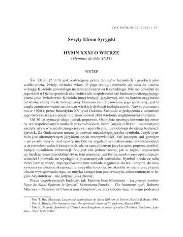 V O X PAT R U M 3 2 ( 2 0 1 2 ) t . 5 7 Święty Efrem Syryjski HYMN XXXI O WIERZE (Hymnus de fide XXXI) WSTĘP Św. Efrem († 373) jest postrzegany przez teologów łacińskich i greckich jako wielki poeta, święty, świadek wiary. O jego teologii niewiele się mówiło i mówi w kręgu Kościoła powstałego na terenie Cesarstwa Rzymskiego. Nie ma odwołań do jego dzieł u Ojców greckich czy łacińskich, współcześni zaś badacze postrzegają jego pisma jako świadectwo Kościoła innej tradycji językowej, nie za bardzo oryginalne od strony samej myśli teologicznej. Pomimo zainteresowania jego spuścizną, jest to ciągle zainteresowanie na uboczu wielkich dyskusji teologicznych. Nawet przyznany mu w 1920 r. przez Benedykta XV tytuł Doktora Kościoła w połączeniu z uznaniem jego twórczości jako poezji nie zaowocował zbyt wieloma pogłębionymi studiami. Od 30 lat sytuacja ulega jednak poprawie. Osobiście upatruję korzenie tej zmiany we współczesnych naukach przyrodniczych, które (myślę o fizyce i matematyce) zaczęły używać specyficznego języka i specyficznej metodologii do opisu badanych zjawisk. Za Gadamerem można ją nazwać metodologią języka symbolu. Język symbolu jest alternatywnym językiem opisu rzeczywistości. Ani lepszym, ani gorszym – po prostu innym. Jest oparty nie tyle na regułach wnioskowania, zakorzenionych w arystotelesowskich kategoriach, ale na specyficznym języku opisu poprzez symbol, będący nośnikiem informacji. Nie jest ona jednoznaczna, jak w logice, odpowiada jej bardziej prawdopodobieństwo, tym niemniej jest formą naukowego opisu rzeczywistości i pozwala na wyciąganie powtarzalnych wniosków. Symbol niesie ze sobą treści bardzo różne, stąd operowanie nim zakłada sięgniecie do tez i antytez, do ukazywania świadomie skrajności, a wszystko to po to, by określić w miarę precyzyjnie obszar występowania tego, co umyka kategoriom poznawczym, zakorzenionym w logice Arystotelesa – nie jedynej, jaką znamy. Prace współczesnych badaczy, jak Taniosa Bou Mansoura – La pensée symbolique de Saint Ephrem le Syrien1, Sebastiana Brocka – The luminous eye2, Roberta Murraya – Symbols of Church and Kingdom3, są przykładem tego nowego podejścia Por. T. Bou Mansour, La pensée symbolique de Saint Éphrem le Syrien, Kaslik (Liban) 1988. Por. S. Brock, The luminous eye: the spiritual vision of St. Ephrem, Roma 1985. 3 Por. R. Murray, Symbols of Church and Kingdom: a study of early Christian Tradition, London – New York 20042. 1 2 2 PRZEKŁADY do studium myśli Ojców Syryjskich. Jak zauważył Kees den Biesen w swoim Simply and bold. Efrem’s art of symbolic thought4, poprzednia sytuacja była spowodowana niezrozumieniem metody teologicznej, jaka, w odróżnieniu od Greków i Łacinników, charakteryzowała Syryjczyków. Tymczasem metoda ta wydaje się mieć głębokie korzenie i polega na świadomym wybieraniu środków i sposobów refleksji o Bogu. Za wyborem tego sposobu mówienia o Stwórcy stoją nie tylko własne przemyślenia Ojców Syryjskich, ale i ich wierność biblijnemu językowi Objawienia – ich wierność temu, co można nazwać językiem, w jakim Bóg przemawiał – i nieustannie przemawia do człowieka. To świadomość Niepojętego, który stał się doświadczalny, kazała św. Efremowi i jego uczniom wybrać poezję, symbol i metaforę za środek przekazu i refleksji o Nim. Edeski Kaznodzieja był świetnie obeznany z dziełami Platona czy Arystotelesa. Zainteresowanie zwłaszcza tymi ostatnimi było charakterystyczne nie tylko dla niego, ale i dla całego jego kręgu kulturowego. Jak więc jest możliwe, powtórzmy pytanie, że ludzie tłumaczący z zapałem i studiujący Kategorie Arystotelesa, rozwijający jego dzieła o krytyczności myślenia, co więcej, w egzegezie uważający w przyszłości Teodora z Mopsuestii za wzór egzegety, sami we własnych pracach byli dalecy od systematyczności i porządku myślenia, uważanemu za podstawę naukowości refleksji? W tym kontekście hymny O wierze Diakona z Edessy mają w sobie coś z Mów teologicznych Grzegorza Teologa (z którymi łączy ich, jak się okazuje, bardzo wiele) i są punktem wyjścia do uprawiania dalszej refleksji. Choć większość badaczy skupiła się na analizie języka i struktur obecnych w twórczości Efrema, tym niemniej ich wnioski mogą być ekstrapolowane na całość spuścizny syryjskiej okresu patrystycznego. Warto więc przybliżyć polskiemu czytelnikowi jeden z najbardziej charakterystycznych tekstów edeskiego Diakona, ukazujący jego metodologię i sposób mówienia o Bogu; myślę o 31. hymnie z Hymnów o wierze, w wydaniu E. Becka5. Św. Efrem wychodził z założenia, wspólnego dla większości Ojców, że tak naprawdę poznanie Boga przez człowieka jest niemożliwe. Poznajemy Go po części, gdyż taka jest nasza natura, poznajemy w tym stopniu, w jakim Bóg pozwala nam siebie poznać. Nie jest to ścisły apofatyzm, bo św. Efrem nie neguje ludzkiego poznania, jak i wysiłku umysłu człowieka, który chce zrozumieć swoją wiarę. Podstawowe jednak twierdzenie jest jasne – Bóg w swej istocie pozostaje niepoznawalny do końca, nie zmienia tego też Objawienie. Objawienie jest tylko wejściem w tajemnice, która do końca pozostaje tajemnicą. By nie milczeć o Bogu człowiek odwołuje się do światła, jakim jest dla niego sam Bóg. To światło, nieustannie przekazywane człowiekowi, 4 Por. K. den Biesen, Simply and bold. Ephrem’s art of symbolic thought, Piscataway NJ 2006. Tę samą tezę powtórzył podczas XI colloquium Patrimoine Syriaques, które odbyło się w Aleppo w 2006 r., poświęconego twórczości św. Efrema (materiały: Saint Ephrem un poète pour notre temps, Antelias – Liban 2007, s, 155-172 – artykuł Biesena: Ephrem the theologian: perception and perspectives). 5 Chodzi o edycję przygotowaną przez E. Becka: Des heligen Ephraem des Syrers Hymnen De fide, CSCO 154 (S