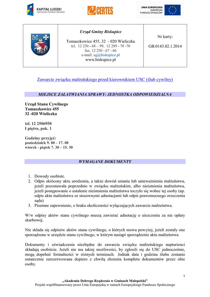 Urząd Gminy Biskupice Nr karty: Tomaszkowice 455, 32 - 020 Wieliczka tel. 12 250 - 68 – 99, 12 289 - 70 -70 fax. 12 250 - 67 - 66 e-mail: [email protected] GB.0143.02.1.2014 www.biskupice.pl Zawarcie związku małżeńskiego przed kierownikiem USC (ślub cywilny) MIEJSCE ZAŁATWIANIA SPRAWY- JEDNOSTKA ODPOWIEDZIALNA Urząd Stanu Cywilnego Tomaszkowice 455 32 -020 Wieliczka tel. 12 2506950 I piętro, pok. 1 Godziny przyjęć: poniedziałek 9. 00 – 17. 00 wtorek - piątek 7. 30 – 15. 30 WYMAGANE DOKUMENTY 1. Dowody osobiste. 2. Odpis skrócony aktu urodzenia, a także dowód ustania lub unieważnienia małżeństwa, jeżeli pozostawała poprzednio w związku małżeńskim, albo nieistnienia małżeństwa, jeżeli postępowanie o ustalenie nieistnienia małżeństwa toczyło się wobec tej osoby (np. odpis aktu małżeństwa ze stosownymi adnotacjami lub odpis prawomocnego orzeczenia sądu) 3. Pisemne zapewnienie, o braku okoliczności wyłączających zawarcie małżeństwa. W/w odpisy aktów stanu cywilnego muszą zawierać adnotację o uiszczeniu za nie opłaty skarbowej. Nie składa się odpisów aktów stanu cywilnego, o których mowa powyżej, jeżeli zostały one sporządzone w urzędzie stanu cywilnego, w którym nastąpi sporządzenie aktu małżeństwa. Dokumenty i oświadczenia niezbędne do zawarcia związku małżeńskiego nupturienci składają osobiście. Jeżeli nie ma takiej możliwości, by zgłosili się do USC jednocześnie, mogą dopełnić formalności w różnych terminach. Jednak data i godzina ślubu zostanie ostatecznie zarezerwowana dopiero z chwilą złożenia kompletu dokumentów przez obie osoby. 1 „Akademia Dobrego Rządzenia w Gminach Małopolski” Projekt współfinansowany przez Unię Europejską w ramach Europejskiego Funduszu Społecznego OPŁATY • • za sporządzenie aktu małżeństwa - 84 zł. za zezwolenie na skrócenie terminu oczekiwania na zawarcie związku małżeńskiego 39 zł Opłaty uiszcza się w chwili składania dokumentów niezbędnych do zawarcia związku małżeńskiego. Opłatę dokonuje się w kasie Urzędu Gminy lub przelewem Biskupice Nr 41 8619 0006 0010 02000 31310016. na konto Urzędu Gminy UWAGI Jeżeli kierownik USC odmawia przyjęcia oświadczeń o wstąpieniu w związek małżeński, powiadamia na piśmie osobę zainteresowaną o przyczynach odmowy. Osoba zainteresowana w terminie 14 dni od dnia doręczenia jej pisma kierownika USC może wystąpić z wnioskiem do sądu rejonowego właściwego ze względu na siedzibę urzędu stanu cywilnego o rozstrzygnięcie, czy okoliczności przedstawione przez kierownika USC uzasadniają odmowę dokonania czynności. Prawomocne postanowienie sądu wiąże kierownika USC. INFORMACJE DODATKOWE Dokumenty niezbędne do zawarcia małżeństwa przyjmowane są najwcześniej na pół roku przed datą planowanego ślubu. Małżeństwo przed kierownikiem USC nie może być zawarte przed upływem miesiąca od dnia, kiedy osoby, które zamierzają je zawrzeć, złożyły kierownikowi USC pisemne zapewnienie, o braku okoliczności wyłączających zawarcie tego małżeństwa. Jednakże kierownik USC może zezwolić na zawarcie małżeństwa przed upływem tego terminu, jeżeli przemawiają za tym ważne względy. Zawarcie małżeństwa następuje w USC wybranym przez nupturientów. W uzasadnionych przypadkach, kierownik USC może przyjąć oświadczenia o wstąpieniu w związek małżeński poza lokalem urzędu. Zawarcie małżeństwa następuje z zachowaniem uroczystej formy. Małżeństwo zostaje zawarte, gdy mężczyzna i kobieta, jednocześnie obecni, złożą przed kierownikiem urzędu stanu cywilnego oświadczenia, że wstępują ze sobą w związek małżeński. 2 „Akademia Dobrego Rządzenia w Gminach Małopolski” Projekt współfinansowany przez Unię Europejską w ramach Europejskiego Funduszu Społecznego PODSTAWA PRAWNA − Ustawa z dnia 25 lutego 1964 r. Kodeks rodzinny i opiekuńczy (Dz. U. z 2012 poz. 788 z późn. zm.) − Ustawa z dnia z dnia 29 września 1986 r. - Prawo o aktach stanu cywilnego (Dz. U. z 2011 r. Nr 212, poz. 1264 z późn. zm.) − Ustawa z dnia 16 listopada 2006 r. o opłacie skarbowej (Dz. U. z 2012 r., poz. 1282 z późn. zm) − Ustawa z dnia 14 czerwca 1960 r. Kodeks postępowania administracyjnego (Dz.U. z 2013r., poz.267) Opracował: Sprawdził: Zatwierdził: Data: Data: Data: Podpis: Podpis: Podpis: 3 „Akademia Dobrego Rządzenia w Gminach Małopolski” Projekt współfinansowany przez Unię Europejską w ramach Europejskiego Funduszu Społecznego