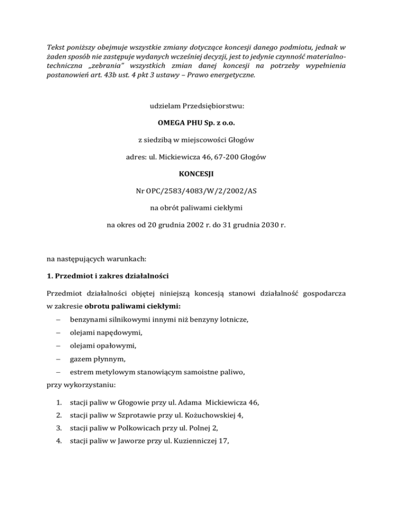 Tekst poniższy obejmuje wszystkie zmiany dotyczące koncesji danego podmiotu, jednak w żaden sposób nie zastępuje wydanych wcześniej decyzji, jest to jedynie czynność materialnotechniczna „zebrania” wszystkich zmian danej koncesji na potrzeby wypełnienia postanowień art. 43b ust. 4 pkt 3 ustawy – Prawo energetyczne. udzielam Przedsiębiorstwu: OMEGA PHU Sp. z o.o. z siedzibą w miejscowości Głogów adres: ul. Mickiewicza 46, 67-200 Głogów KONCESJI Nr OPC/2583/4083/W/2/2002/AS na obrót paliwami ciekłymi na okres od 20 grudnia 2002 r. do 31 grudnia 2030 r. na następujących warunkach: 1. Przedmiot i zakres działalności Przedmiot działalności objętej niniejszą koncesją stanowi działalność gospodarcza w zakresie obrotu paliwami ciekłymi: benzynami silnikowymi innymi niż benzyny lotnicze, olejami napędowymi, olejami opałowymi, gazem płynnym, estrem metylowym stanowiącym samoistne paliwo, przy wykorzystaniu: 1. stacji paliw w Głogowie przy ul. Adama Mickiewicza 46, 2. stacji paliw w Szprotawie przy ul. Kożuchowskiej 4, 3. stacji paliw w Polkowicach przy ul. Polnej 2, 4. stacji paliw w Jaworze przy ul. Kuzienniczej 17, 5. samochodu ciężarowego Mercedes-Benz o nr identyfikacyjnym WDB6520531K020834 wraz z naczepą cysterny DR URLICH ESTEREK NIEMCY o nr identyfikacyjnym WDB6520531K0208348, 6. ciągnika Mercedes-Benz o nr identyfikacyjnym WDB9340321K927987 wraz z naczepą cysterny KAESSBOHRER STB-TADR L1S0R123 TANKAUFLIEGER o nr identyfikacyjnym WKVDAN50300067548. 2. WARUNKI PROWADZENIA DZIAŁALNOŚCI 2.1. Warunki ogólne 2.1.1. Koncesjonariusz jest obowiązany do spełnienia określonych przepisami prawa warunków wykonywania działalności gospodarczej oraz do wykonywania działalności objętej niniejszą koncesją na zasadach określonych w ustawie – Prawo energetyczne oraz wydanych na jej podstawie przepisach wykonawczych. 2.1.2. Koncesjonariusz jest obowiązany do przestrzegania obowiązujących przepisów dotyczących jakości paliw ciekłych, ochrony środowiska, zasad postępowania z odpadami i bezpieczeństwa ekologicznego, a także wydanych na ich podstawie przepisów wykonawczych, a w szczególności do terminowej realizacji określonych tymi przepisami przedsięwzięć zabezpieczających środowisko przed szkodliwym oddziaływaniem działalności wykonywanej na podstawie niniejszej koncesji oraz do posiadania wymaganych zezwoleń i uzgodnień. 2.1.3. Koncesjonariusz jest obowiązany do przestrzegania przepisów ustawy z dnia 18 lipca 2001 r. Prawo wodne (Dz. U. z 2005 r. Nr 239, poz. 2019 z późn. zm.), a w szczególności do posiadania pozwoleń wodnoprawnych, gdy są one wymagane. 2.1.4. Koncesjonariusz jest obowiązany do wykonywania działalności w sposób nie stanowiący zagrożenia dla życia lub zdrowia ludzkiego oraz nie narażający na powstanie szkód materialnych. 2.1.5. Koncesjonariusz nie będzie zawierać umów kupna – sprzedaży paliw ciekłych z przedsiębiorstwami energetycznymi, które nie posiadają stosownej koncesji w przypadkach, gdy koncesja taka jest wymagana przepisami ustawy – Prawo energetyczne. 2.2. Szczególne warunki wykonywania działalności objętej koncesją ze względu na właściwą obsługę odbiorców 2.2.1. Koncesjonariusz jest obowiązany do utrzymywania stanu technicznego oraz wyposażenia obiektów, instalacji i urządzeń zapewniających wysoką efektywność i najlepszą jakość wykonywanej działalności objętej niniejszą koncesją, z uwzględnieniem racjonalnego poziomu kosztów, przy zachowaniu obowiązujących przepisów określających wymogi techniczne, w tym metrologiczne, jakościowe i ochrony środowiska oraz do przestrzegania przepisów o bezpieczeństwie i higienie pracy, w tym w szczególności w zakresie bezpieczeństwa pożarowego oraz bezpieczeństwa ludzi i mienia. 2.2.2. Koncesjonariusz jest obowiązany do zapewnienia, aby czynności w zakresie samodzielnej eksploatacji instalacji i urządzeń wykonywały wyłącznie osoby legitymujące się posiadaniem wymaganych w tym zakresie kwalifikacji. 2.2.3. W przypadku powierzania, na podstawie zawieranych umów, transportu paliw ciekłych będących przedmiotem obrotu, innym podmiotom, wykorzystującym do tego celu odpowiednią infrastrukturę techniczną, Koncesjonariusz zobowiązany jest do każdorazowego ustalenia, czy środki transportu, którymi dokonywany będzie przewóz paliw, spełniają wszelkie wymogi określone przepisami prawa, w szczególności wymogi metrologiczne oraz potwierdzone dokumentami wystawionymi przez upoważnioną jednostkę wymogi dotyczące przewozu drogowego towarów niebezpiecznych, w tym wynikające z regulacji w zakresie międzynarodowego przewozu drogowego towarów niebezpiecznych (ADR). 2.2.4. Koncesjonariuszowi nie wolno czynić przedmiotem obrotu paliw ciekłych, których parametry jakościowe są niezgodne z parametrami określonymi obowiązującymi przepisami i wynikającymi z zawartych umów. 2.2.5. Koncesjonariusz określającego jest parametry obowiązany do posiadania fizyko – chemiczne danej ważnego partii dokumentu paliwa będącego przedmiotem obrotu, wydanego każdorazowo przez bezpośredniego sprzedawcę tego paliwa, a także do wydania na jego podstawie każdemu przedsiębiorcy prowadzącemu obrót paliwami ciekłymi, a innemu odbiorcy na jego żądanie, oświadczenia we własnym imieniu o zgodności parametrów jakości dostarczonego paliwa z parametrami jakości wynikającymi z obowiązujących w tym zakresie przepisów i z zawartej z odbiorcą umowy. W przypadku importu lub przesunięcia wewnątrzwspólnotowego Koncesjonariusz jest paliw ciekłych obowiązany do określonych niniejszą przeprowadzania kontroli koncesją, jakości wprowadzanych do obrotu paliw celem sprawdzenia dotrzymywania przez te paliwa parametrów jakościowych wynikających z krajowych norm jakościowych określonych w obowiązujących przepisach oraz przekazania wyników badań odbiorcy. 2.2.6. Koncesjon