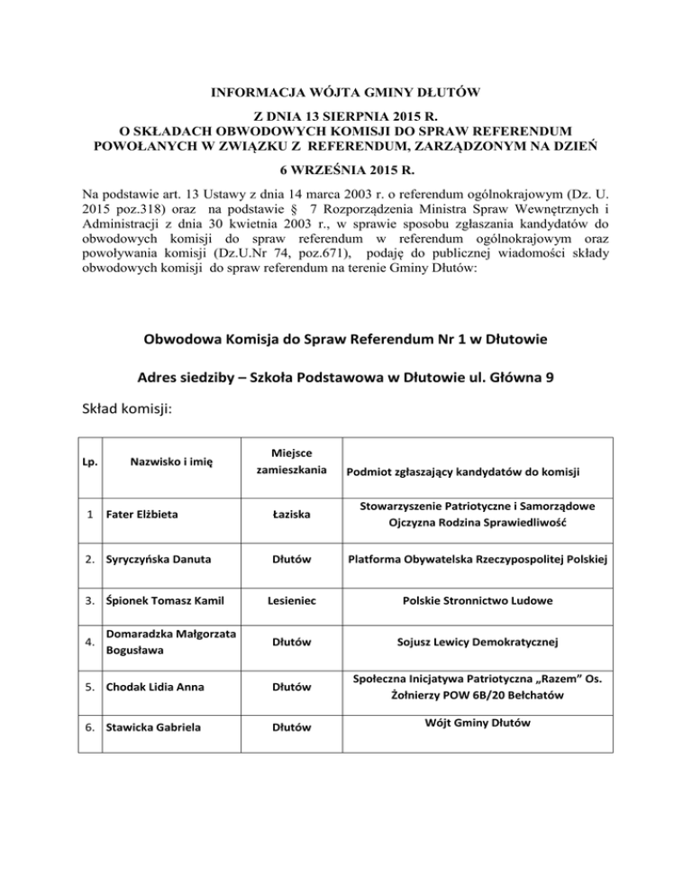 INFORMACJA WÓJTA GMINY DŁUTÓW Z DNIA 13 SIERPNIA 2015 R. O SKŁADACH OBWODOWYCH KOMISJI DO SPRAW REFERENDUM POWOŁANYCH W ZWIĄZKU Z REFERENDUM, ZARZĄDZONYM NA DZIEŃ 6 WRZEŚNIA 2015 R. Na podstawie art. 13 Ustawy z dnia 14 marca 2003 r. o referendum ogólnokrajowym (Dz. U. 2015 poz.318) oraz na podstawie § 7 Rozporządzenia Ministra Spraw Wewnętrznych i Administracji z dnia 30 kwietnia 2003 r., w sprawie sposobu zgłaszania kandydatów do obwodowych komisji do spraw referendum w referendum ogólnokrajowym oraz powoływania komisji (Dz.U.Nr 74, poz.671), podaję do publicznej wiadomości składy obwodowych komisji do spraw referendum na terenie Gminy Dłutów: Obwodowa Komisja do Spraw Referendum Nr 1 w Dłutowie Adres siedziby – Szkoła Podstawowa w Dłutowie ul. Główna 9 Skład komisji: Lp. Nazwisko i imię Miejsce zamieszkania Podmiot zgłaszający kandydatów do komisji 1 Fater Elżbieta Łaziska Stowarzyszenie Patriotyczne i Samorządowe Ojczyzna Rodzina Sprawiedliwość 2. Syryczyńska Danuta Dłutów Platforma Obywatelska Rzeczypospolitej Polskiej Lesieniec Polskie Stronnictwo Ludowe Dłutów Sojusz Lewicy Demokratycznej 5. Chodak Lidia Anna Dłutów Społeczna Inicjatywa Patriotyczna „Razem” Os. Żołnierzy POW 6B/20 Bełchatów 6. Stawicka Gabriela Dłutów Wójt Gminy Dłutów 3. Śpionek Tomasz Kamil 4. Domaradzka Małgorzata Bogusława Obwodowa Komisja do Spraw Referendum Nr 2 w Dłutowie Adres siedziby – Szkoła Podstawowa w Dłutowie ul. Główna 9 Skład komisji: Lp. Nazwisko i imię 1. Jabłońska Patrycja Miejsce zamieszkania Podmiot zgłaszający kandydatów do komisji Łaziska Stowarzyszenie Patriotyczne i Samorządowe Ojczyzna Rodzina Sprawiedliwość Czyżemin Platforma Obywatelska Rzeczypospolitej Polskiej Polskie Stronnictwo Ludowe 2. Skrobek Milena Marianna 3. Michaś Agnieszka Bogumiła Leszczyny Duże 4. Woźny Seweryn Krzysztof Leszczyny Duże Sojusz Lewicy Demokratycznej 5. Puchalska Anna Dłutów 6. Świątek Barbara Jutroszew Społeczna Inicjatywa Patriotyczna „Razem” Os. Żołnierzy POW 6B/20 Bełchatów Wójt Gminy Dłutów Obwodowa Komisja do Spraw Referendum Nr 3 w Dłutowie Adres siedziby – Szkoła Podstawowa w Dłutowie ul. Główna 9 Skład Komisji: Lp. Nazwisko i imię 1. Fater Adam Miejsce zamieszkania Łaziska 2. Kowalczyk Michał Marcin Huta Dłutowska 3. Cholewa Anna Martyna Leszczyny Duże 4. Woźna Paulina Katarzyna Leszczyny Duże Stowarzyszenie Patriotyczne i Samorządowe Ojczyzna Rodzina Sprawiedliwość Platforma Obywatelska Rzeczypospolitej Polskiej Polskie Stronnictwo Ludowe Sojusz Lewicy Demokratycznej 5. Bolonek Elżbieta Huta Dłutowska Nowacka Małgorzata Dłutów 6 Podmiot zgłaszający kandydatów do komisji Społeczna Inicjatywa Patriotyczna „Razem” Os. Żołnierzy POW 6B/20 Bełchatów Wójt Gminy Dłutów Obwodowa Komisja do Spraw Referendum Nr 4 w Dłutowie Adres siedziby – Gimnazjum w Dłutowie ul. Główna 9 Skład Komisji: Lp. Nazwisko i imię 1. Kopycki Tadeusz 2. Bonczał Bożena Bronisława 3. Dzierżawska Henryka Marianna Miejsce zamieszkania Podmiot zgłaszający kandydatów do komisji Łaziska Stowarzyszenie Patriotyczne i Samorządowe Ojczyzna Rodzina Sprawiedliwość Czyżemin Platforma Obywatelska Rzeczypospolitej Polskiej Budy Dłutowskie Polskie Stronnictwo Ludowe Sojusz Lewicy Demokratycznej 4. Pik Halina Łaziska 5. Syryczyńska Anna Huta Dłutowska 6. Skupień Hanna Budy Dłutowskie Społeczna Inicjatywa Patriotyczna „Razem” Os. Żołnierzy POW 6B/20 Bełchatów Wójt Gminy Dłutów Wójt Gminy Dłutów Grażyna Maślanka-Olczyk