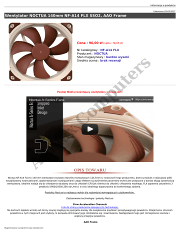 Informacje o produkcie Utworzono 03-03-2017 Wentylator NOCTUA 140mm NF-A14 FLX SSO2, AAO Frame Cena : 96,00 zł (netto: 78,05 zł) pu te r s Nr katalogowy : NF-A14 FLX Producent : NOCTUA Stan magazynowy : bardzo wysoki Średnia ocena : brak recenzji Ad m ax C om Poniżej filmik prezentujący wentylatory z nowej serii: Noctua NF-A14 FLX to 140 mm wentylator (rozstaw otworów montażowych 124,5mm) z nowej serii tego producenta. Jest to produkt z najwyższej półki naszpikowany nowoczesnymi, opatentowanymi rozwiązaniami czego efektem są wyśmienite parametry techniczne połączone z bardzo długą żywotnością wentylatora. Idealnie nadaje się do chłodzenia obudowy oraz do chłodzeń CPU jak również do chłodnic chłodzenia wodnego. FLX zapewnia ustawienia 3 prędkości (900/1050/1200 obr./min.) w celu idealnego dopasowania do konkretnego zadania. Produkty Noctua to najlepszy wybór dla najbardziej wymagających użytkowników. Zastosowane technologie i patenty Noctua: Flow Acceleration Chennels Link do strony producenta opisującej tą technologię. Na końcach łopatek wirnika od strony ssącej znajdują się specjalne kanały dla zwiększenia prędkości przepływającego powietrza. Dzięki temu strumień powietrza w tych miejscach jest szybszy co pozwala eliminować jego rozdzelanie się i zawirowania. Następstwem tego jest zmniejszenie szumów i większy przepływ powietrza. AAO Frame Wygenerowano w programie www.oscGold.com Link do strony z opisem producenta. AAO to zaawansowana optymalizacja akustyczna ramki wentylatora. Ramka wentylatora posiada zintegrowane podkładki antywibracyjne oraz technologie Stepped Inlet Design oraz Stepped Inlet Design szczegółowiej opisane poniżej. Stepped Inlet Design Link do strony producenta opisującej tą technologię. Zastosowano tutaj specjalny kształt na ramce od strony napływającego powietrza (po raz pierwszy zastosowano to w modelu NF-F12). Dzięki niemu napływającemu powietrzu nadany zostaje ruch turbulentny, nielaminarny. Środek ten ma zastosowanie podobne do wgłębień na piłce golfowej - prowadzi do bliższego ramie przepływu powietrza co pozwala wirnikowi ssać jego większą ilość i zwiększa ogólną wydajność nawiewu. Dodatkową zaletą jest to, że nielaminarny strumień powietrza wchodzący w wirnik redukuje hałasy i podnosi kulturę pracy wentylatora czyniąc go bardziej przyjemnym dla ucha ludzkiego. Inner Surface Microstructures Link do strony producenta opisującej tą technologię. Miniaturowe rowki na wewnętrznej stronie ramki polepszają oddzielanie zasysanego powietrza i ograniczają jego niepożądane zawirowania co podnosi wydajność i zmniejsza emisję hałasu jednocześnie. te r s Integrated Anti-Vibration Pads Zintegrowane wstawki antywibracyjne wykonane z miękkiego silikonu dodatkowo minimalizują przenoszenie drgań zachowując pełną kompatybilność ze wszystkimi standardowymi systemami montażowymi i mocowaniami wentylatora do radiatorów. pu Smooth Commutation Drive 2 Link do strony z opisem producenta. Każdy wentylator prócz szumów aerodynamicznych generuje tzw. "hałas przełączania" potocznie "cykanie", które jest uporczywe i może odgrywać znaczącą rolę w emisji hałasu wentylatorów osiowych z bezszczotkowymi silnikami prądu stałego. Na każdym przejściu pomiędzy cewkami wirnik otrzymuje nagły impuls. Smooth Commutation Drive 2 zapewnia bardziej ciągłe i płynne przełączanie cewek co wycisza uporczywe cykanie nawet w bliskiej odległości od silnika. C om SSO2 Bearing Link do strony producenta z opisem łożysk Łożyska SSO były już stosowane kilka lat temu we wcześniejszych modelach wentylatorów Noctua. Znakomicie przetrwały próbę czasu i zdały egzamin u entuzjastów ciszy i klientów z branży zachowując swoje pierwotne parametry i kulturę pracy po długim czasie użytkowania. SSO to połączenie łożysk hydrodynamicznych z dodatkowym magnesem obsługującym samostabilizację osi wirnika. SSO2 to druga generacja tych łożysk. Poprzez zastosowanie metalowej powłoki i nowych technik formowania wtryskowego magnes umieszczony jest bliżej osi wirnika i w ten sposób wywiera on na niego większą siłę magnetyczną. Prowadzi to do jeszcze lepszej stabilizacji, precyzji i trwałości. Łożyska SSO2 osiągają większą precyzję i lepszą trwałość od tradycyjnych łożysk kulkowych czy hydrodynamicznych. m ax Metal bearing shell Link do strony z opisem producenta. W celu zapewnienia możliwie najwyższego stopnia dokładności na etapie produkcji, minimum tolerancji i doskonałej długookresowej stabilności w modelach NF-A14 ULN i FLX elementy łożyska zostały w całości wykonane z mosiądzu. 3 ustawienia prędkości dla pełnej elastyczności zastosowań Dla podniesienia elastyczności zastosowań NF-A14 FLX posiada w komplecie niskoszumową redukcję Low-Noise Adaptor (L.N.A.), która ogranicza jego obroty z 1200 do 1050 obr./min. oraz redukcję Ultra Low-Noise Adaptor (U.L.N.A.) która ogranicza jego prędkość do 900 obr./min. Pozwala to na odpowiednie dopasowanie prędkości / ciszy do konkretnego przypadku. Ad Przedłużka kabla 3-Pin Sam wentylator ma dość krótki kabelek 20cm żeby wyeliminować zbędną plątaninę kabli w typowych zastosowaniach. Jeśli natomiast zajdzie potrzeba to można skorzystać z dołączonej w zestawie 30cm przedłużki. Oba kable są oczywiście wykonane w elastycznej i estetycznej otulinie. Przejściówka z 3-Pin na Molex 4-Pin Dołączona została również przejściówka z 3-Pin na Molex 4-Pin dzięki której wentylator może zostać podłączony bezpośrednio do zasilacza. Końcówka Molex 4-Pin jest przelotką zatem nie blokuje nam (nie zabiera) wtyczki Molex z zasilacza. Wyjątkowo niski pobór prądu Pomimo poprawy wydajności NF-A14 FLX zużywa tylko 0,96 W mocy. Dzięki temu nie tylko jest ekologiczny, ale również pozytywnie wpływa na rachunki za prąd. Noctua to najwyższa jakość i precyzja w