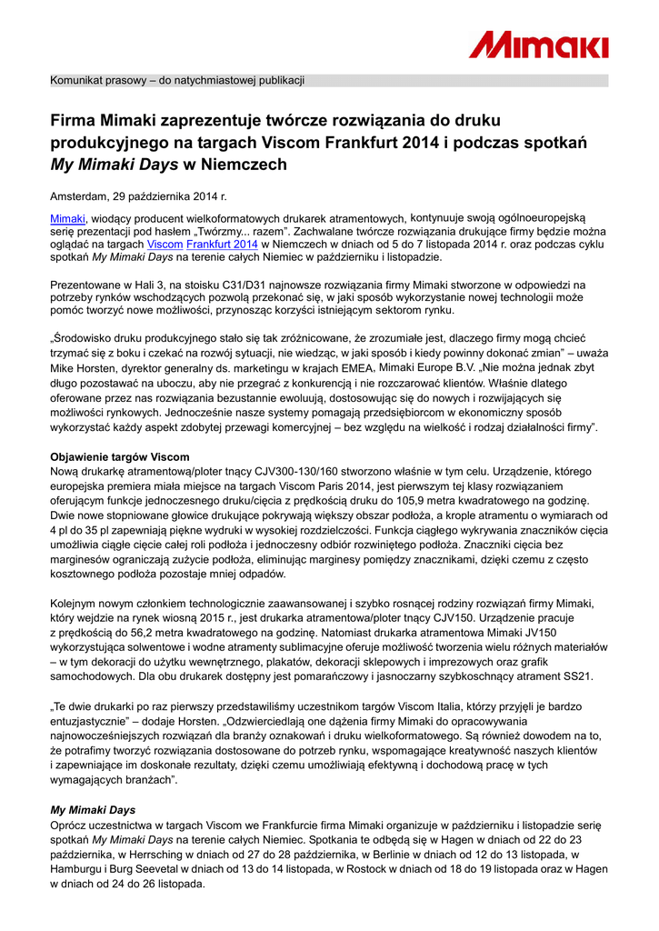 Komunikat prasowy – do natychmiastowej publikacji Firma Mimaki zaprezentuje twórcze rozwiązania do druku produkcyjnego na targach Viscom Frankfurt 2014 i podczas spotkań My Mimaki Days w Niemczech Amsterdam, 29 października 2014 r. Mimaki, wiodący producent wielkoformatowych drukarek atramentowych, kontynuuje swoją ogólnoeuropejską serię prezentacji pod hasłem „Twórzmy... razem”. Zachwalane twórcze rozwiązania drukujące firmy będzie można oglądać na targach Viscom Frankfurt 2014 w Niemczech w dniach od 5 do 7 listopada 2014 r. oraz podczas cyklu spotkań My Mimaki Days na terenie całych Niemiec w październiku i listopadzie. Prezentowane w Hali 3, na stoisku C31/D31 najnowsze rozwiązania firmy Mimaki stworzone w odpowiedzi na potrzeby rynków wschodzących pozwolą przekonać się, w jaki sposób wykorzystanie nowej technologii może pomóc tworzyć nowe możliwości, przynosząc korzyści istniejącym sektorom rynku. „Środowisko druku produkcyjnego stało się tak zróżnicowane, że zrozumiałe jest, dlaczego firmy mogą chcieć trzymać się z boku i czekać na rozwój sytuacji, nie wiedząc, w jaki sposób i kiedy powinny dokonać zmian” – uważa Mike Horsten, dyrektor generalny ds. marketingu w krajach EMEA, Mimaki Europe B.V. „Nie można jednak zbyt długo pozostawać na uboczu, aby nie przegrać z konkurencją i nie rozczarować klientów. Właśnie dlatego oferowane przez nas rozwiązania bezustannie ewoluują, dostosowując się do nowych i rozwijających się możliwości rynkowych. Jednocześnie nasze systemy pomagają przedsiębiorcom w ekonomiczny sposób wykorzystać każdy aspekt zdobytej przewagi komercyjnej – bez względu na wielkość i rodzaj działalności firmy”. Objawienie targów Viscom Nową drukarkę atramentową/ploter tnący CJV300-130/160 stworzono właśnie w tym celu. Urządzenie, którego europejska premiera miała miejsce na targach Viscom Paris 2014, jest pierwszym tej klasy rozwiązaniem oferującym funkcje jednoczesnego druku/cięcia z prędkością druku do 105,9 metra kwadratowego na godzinę. Dwie nowe stopniowane głowice drukujące pokrywają większy obszar podłoża, a krople atramentu o wymiarach od 4 pl do 35 pl zapewniają piękne wydruki w wysokiej rozdzielczości. Funkcja ciągłego wykrywania znaczników cięcia umożliwia ciągłe cięcie całej roli podłoża i jednoczesny odbiór rozwiniętego podłoża. Znaczniki cięcia bez marginesów ograniczają zużycie podłoża, eliminując marginesy pomiędzy znacznikami, dzięki czemu z często kosztownego podłoża pozostaje mniej odpadów. Kolejnym nowym członkiem technologicznie zaawansowanej i szybko rosnącej rodziny rozwiązań firmy Mimaki, który wejdzie na rynek wiosną 2015 r., jest drukarka atramentowa/ploter tnący CJV150. Urządzenie pracuje z prędkością do 56,2 metra kwadratowego na godzinę. Natomiast drukarka atramentowa Mimaki JV150 wykorzystująca solwentowe i wodne atramenty sublimacyjne oferuje możliwość tworzenia wielu różnych materiałów – w tym dekoracji do użytku wewnętrznego, plakatów, dekoracji sklepowych i imprezowych oraz grafik samochodowych. Dla obu drukarek dostępny jest pomarańczowy i jasnoczarny szybkoschnący atrament SS21. „Te dwie drukarki po raz pierwszy przedstawiliśmy uczestnikom targów Viscom Italia, którzy przyjęli je bardzo entuzjastycznie” – dodaje Horsten. „Odzwierciedlają one dążenia firmy Mimaki do opracowywania najnowocześniejszych rozwiązań dla branży oznakowań i druku wielkoformatowego. Są również dowodem na to, że potrafimy tworzyć rozwiązania dostosowane do potrzeb rynku, wspomagające kreatywność naszych klientów i zapewniające im doskonałe rezultaty, dzięki czemu umożliwiają efektywną i dochodową pracę w tych wymagających branżach”. My Mimaki Days Oprócz uczestnictwa w targach Viscom we Frankfurcie firma Mimaki organizuje w październiku i listopadzie serię spotkań My Mimaki Days na terenie całych Niemiec. Spotkania te odbędą się w Hagen w dniach od 22 do 23 października, w Herrsching w dniach od 27 do 28 października, w Berlinie w dniach od 12 do 13 listopada, w Hamburgu i Burg Seevetal w dniach od 13 do 14 listopada, w Rostock w dniach od 18 do 19 listopada oraz w Hagen w dniach od 24 do 26 listopada. My Mimaki Days to nowa koncepcja, obejmująca program zagadnień dostosowany do indywidualnych potrzeb klientów – od zastąpienia starszego systemu nowymi technikami druku po pomoc w rozszerzaniu obecnej oferty. Planowana tematyka spotkań to: Naciski ekonomiczne i nowe zastosowania drukarek wielkoformatowych UV - LED, Drukowanie i produkcja transparentów i materiałów promocyjnych, „Druk i cięcie” z drukarkami płaskimi i rozwiązaniami laserowymi, Folie do oklejania pojazdów oraz Kiedy używać poszczególnych rodzajów atramentów, w tym UV, SUV i lateksowych. Horsten podsumowuje: „Różnorodność poruszanych tematów stanowi ogromną zaletę My Mimaki Days. Każdy znajdzie tu coś dla siebie, ponieważ zagadnienia te dotyczą wszystkich największych problemów, z którymi borykają się firmy dążące do stworzenia kreatywnej oferty usługowej”. W tym roku firma Mimaki Germany świętuje pięciolecie działalności jako Mimaki Germany GmbH, zatrudniając 26 pracowników w Herrsching i Hagen. Shoji Midorikawa, dyrektor ds. sprzedaży i marketingu Mimaki Germany GmbH, mówi: „My Mimaki Days to wspaniały sposób na zapewnienie dodatkowego wsparcia naszym klientom i wskazanie im okazji do wprowadzania korzystnych zmian. Na niemieckim rynku w szczególności można zauważyć rosnące zapotrzebowanie na wysoką jakość i oczekujemy, że wprowadzenie nowych systemów druku atramentowego JV33 / CJV30, JV300 i CJV300, a także nowych atramentów, zaspokoi ten popyt. Jesteśmy też jednak gotowi, chętni i możemy pomóc firmom dokładniej przyjrzeć się większym wyzwaniom biznesowym i produkcyjnym, które napotykają, a