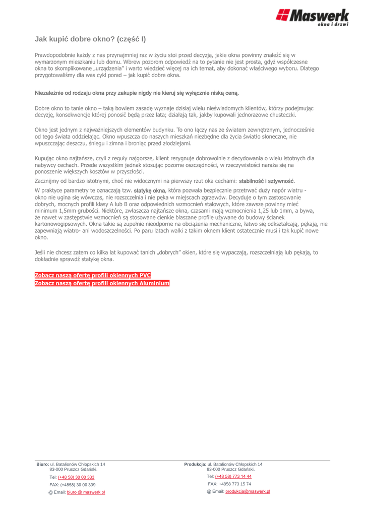 Jak kupić dobre okno? (część I) Prawdopodobnie każdy z nas przynajmniej raz w życiu stoi przed decyzją, jakie okna powinny znaleźć się w wymarzonym mieszkaniu lub domu. Wbrew pozorom odpowiedź na to pytanie nie jest prosta, gdyż współczesne okna to skomplikowane „urządzenia” i warto wiedzieć więcej na ich temat, aby dokonać właściwego wyboru. Dlatego przygotowaliśmy dla was cykl porad – jak kupić dobre okna. Niezależnie od rodzaju okna przy zakupie nigdy nie kieruj się wyłącznie niską ceną. Dobre okno to tanie okno – taką bowiem zasadę wyznaje dzisiaj wielu nieświadomych klientów, którzy podejmując decyzję, konsekwencje której ponosić będą przez lata; działają tak, jakby kupowali jednorazowe chusteczki. Okno jest jednym z najważniejszych elementów budynku. To ono łączy nas ze światem zewnętrznym, jednocześnie od tego świata oddzielając. Okno wpuszcza do naszych mieszkań niezbędne dla życia światło słoneczne, nie wpuszczając deszczu, śniegu i zimna i broniąc przed złodziejami. Kupując okno najtańsze, czyli z reguły najgorsze, klient rezygnuje dobrowolnie z decydowania o wielu istotnych dla nabywcy cechach. Przede wszystkim jednak stosując pozorne oszczędności, w rzeczywistości naraża się na ponoszenie większych kosztów w przyszłości. Zacznijmy od bardzo istotnymi, choć nie widocznymi na pierwszy rzut oka cechami: stabilność i sztywność. W praktyce parametry te oznaczają tzw. statykę okna, która pozwala bezpiecznie przetrwać duży napór wiatru okno nie ugina się wówczas, nie rozszczelnia i nie pęka w miejscach zgrzewów. Decyduje o tym zastosowanie dobrych, mocnych profili klasy A lub B oraz odpowiednich wzmocnień stalowych, które zawsze powinny mieć minimum 1,5mm grubości. Niektóre, zwłaszcza najtańsze okna, czasami mają wzmocnienia 1,25 lub 1mm, a bywa, że nawet w zastępstwie wzmocnień są stosowane cienkie blaszane profile używane do budowy ścianek kartonowogipsowych. Okna takie są zupełnie nieodporne na obciążenia mechaniczne, łatwo się odkształcają, pękają, nie zapewniają wiatro- ani wodoszczelności. Po paru latach walki z takim oknem klient ostatecznie musi i tak kupić nowe okno. Jeśli nie chcesz zatem co kilka lat kupować tanich „dobrych” okien, które się wypaczają, rozszczelniają lub pękają, to dokładnie sprawdź statykę okna. Zobacz naszą ofertę profili okiennych PV Zobacz naszą ofertę profili okiennych PVC Zobacz naszą ofertę profili okiennych Aluminium Zobacz naszą ofertę profili okiennych Aluminium Biuro: ul. Batalionów Chłopskich 14 83-000 Pruszcz Gdański. Tel: (+48 58) 30 00 333 Produkcja: ul. Batalionów Chłopskich 14 83-000 Pruszcz Gdański. Tel: (+48 58) 773 14 44 FAX: (+4858) 30 00 339 FAX: +4858 773 15 74 @ Email: biuro @ maswerk.pl @ Email: [email protected]