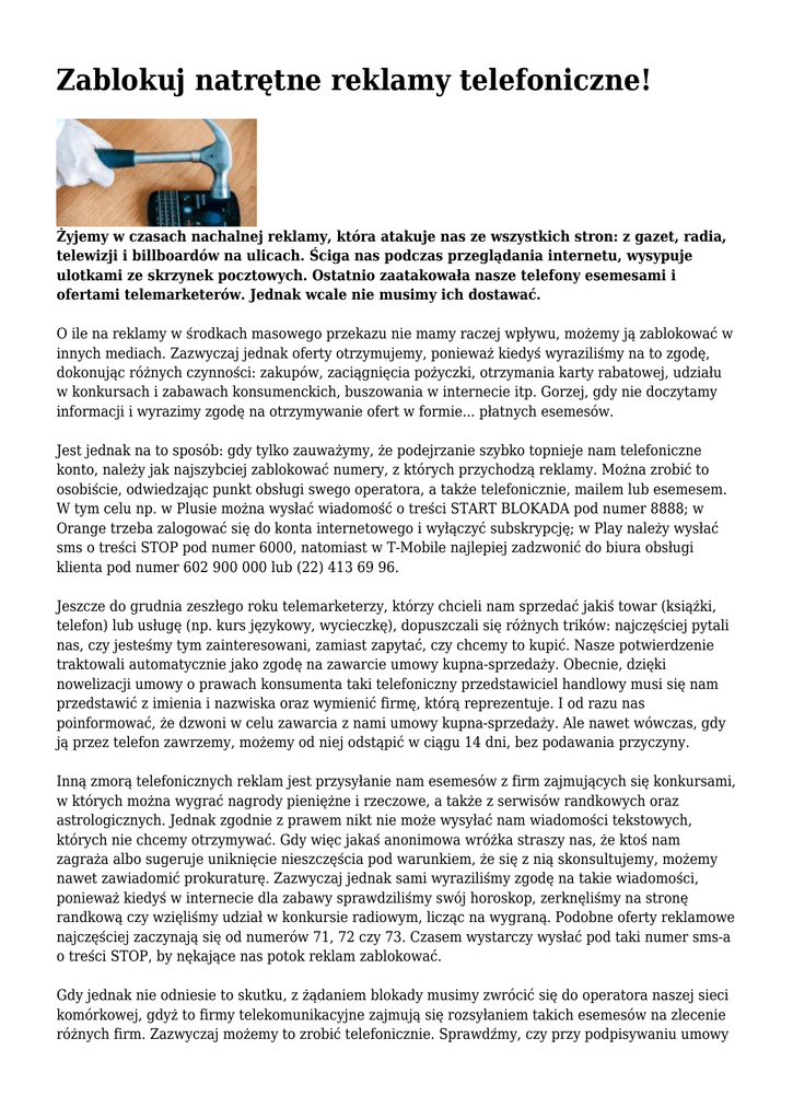 Zablokuj natrętne reklamy telefoniczne! Żyjemy w czasach nachalnej reklamy, która atakuje nas ze wszystkich stron: z gazet, radia, telewizji i billboardów na ulicach. Ściga nas podczas przeglądania internetu, wysypuje ulotkami ze skrzynek pocztowych. Ostatnio zaatakowała nasze telefony esemesami i ofertami telemarketerów. Jednak wcale nie musimy ich dostawać. O ile na reklamy w środkach masowego przekazu nie mamy raczej wpływu, możemy ją zablokować w innych mediach. Zazwyczaj jednak oferty otrzymujemy, ponieważ kiedyś wyraziliśmy na to zgodę, dokonując różnych czynności: zakupów, zaciągnięcia pożyczki, otrzymania karty rabatowej, udziału w konkursach i zabawach konsumenckich, buszowania w internecie itp. Gorzej, gdy nie doczytamy informacji i wyrazimy zgodę na otrzymywanie ofert w formie... płatnych esemesów. Jest jednak na to sposób: gdy tylko zauważymy, że podejrzanie szybko topnieje nam telefoniczne konto, należy jak najszybciej zablokować numery, z których przychodzą reklamy. Można zrobić to osobiście, odwiedzając punkt obsługi swego operatora, a także telefonicznie, mailem lub esemesem. W tym celu np. w Plusie można wysłać wiadomość o treści START BLOKADA pod numer 8888; w Orange trzeba zalogować się do konta internetowego i wyłączyć subskrypcję; w Play należy wysłać sms o treści STOP pod numer 6000, natomiast w T-Mobile najlepiej zadzwonić do biura obsługi klienta pod numer 602 900 000 lub (22) 413 69 96. Jeszcze do grudnia zeszłego roku telemarketerzy, którzy chcieli nam sprzedać jakiś towar (książki, telefon) lub usługę (np. kurs językowy, wycieczkę), dopuszczali się różnych trików: najczęściej pytali nas, czy jesteśmy tym zainteresowani, zamiast zapytać, czy chcemy to kupić. Nasze potwierdzenie traktowali automatycznie jako zgodę na zawarcie umowy kupna-sprzedaży. Obecnie, dzięki nowelizacji umowy o prawach konsumenta taki telefoniczny przedstawiciel handlowy musi się nam przedstawić z imienia i nazwiska oraz wymienić firmę, którą reprezentuje. I od razu nas poinformować, że dzwoni w celu zawarcia z nami umowy kupna-sprzedaży. Ale nawet wówczas, gdy ją przez telefon zawrzemy, możemy od niej odstąpić w ciągu 14 dni, bez podawania przyczyny. Inną zmorą telefonicznych reklam jest przysyłanie nam esemesów z firm zajmujących się konkursami, w których można wygrać nagrody pieniężne i rzeczowe, a także z serwisów randkowych oraz astrologicznych. Jednak zgodnie z prawem nikt nie może wysyłać nam wiadomości tekstowych, których nie chcemy otrzymywać. Gdy więc jakaś anonimowa wróżka straszy nas, że ktoś nam zagraża albo sugeruje uniknięcie nieszczęścia pod warunkiem, że się z nią skonsultujemy, możemy nawet zawiadomić prokuraturę. Zazwyczaj jednak sami wyraziliśmy zgodę na takie wiadomości, ponieważ kiedyś w internecie dla zabawy sprawdziliśmy swój horoskop, zerknęliśmy na stronę randkową czy wzięliśmy udział w konkursie radiowym, licząc na wygraną. Podobne oferty reklamowe najczęściej zaczynają się od numerów 71, 72 czy 73. Czasem wystarczy wysłać pod taki numer sms-a o treści STOP, by nękające nas potok reklam zablokować. Gdy jednak nie odniesie to skutku, z żądaniem blokady musimy zwrócić się do operatora naszej sieci komórkowej, gdyż to firmy telekomunikacyjne zajmują się rozsyłaniem takich esemesów na zlecenie różnych firm. Zazwyczaj możemy to zrobić telefonicznie. Sprawdźmy, czy przy podpisywaniu umowy z operatorem zakreśliliśmy punkt informujący, że godzimy się na dostarczanie nam informacji o treści marketingowej, czy nie. Jeśli wyraziliśmy kiedyś na to zgodę, a teraz zmieniliśmy zdanie, możemy odwiedzić biuro obsługi klienta i ten punkt umowy zmienić. Ostatnio oszuści wpadli na inny pomysł wyłudzenia od nas pieniędzy: wysyłają mianowicie informacje o tym, że nasz telefon jest zawirusowany i w celu jego zabezpieczenia proszą o odesłanie przez nas esemesa pod wskazany numer. Nie dajmy się nabrać, gdyż nasza wiadomość będzie stanowić zgodę na przysyłanie nam bardzo słono płatnych ofert! W repertuarze telefonicznych reklam są także różnego rodzaju zaproszenia: na okazyjne wyprzedaże, noce obniżek, prezentacje dla wybranych klientów... Do skorzystania z oferty ma nas przyciągnąć aura wyjątkowości, wrażenie uczestniczenia w imprezie skierowanej tylko do elitarnego grona osób i poczucie, że taka szansa już się nie powtórzy. Takie oferty kierują do nas zazwyczaj firmy, które mają nasze dane osobowe. Sami je podaliśmy, dokonując różnych zakupów i wyrabiając karty lojalnościowe czy stałego klienta z atrakcyjnymi rabatami. Warto jednak wiedzieć, że nawet jeśli tak się stało a firma dysponuje naszą zgodą na ich przetwarzanie, możemy ją odwołać: umożliwia to ustawa o ochronie danych osobowych z 2011 roku. Generalnie starajmy się bardziej świadomie je chronić: nie ujawniajmy np. w ankietach telefonicznych naszego nazwiska czy wieku oraz innych szczegółów, dotyczących prywatnego życia, jak liczba osób w rodzinie, wysokość zarobków, zawód czy wykształcenie. Zawsze warto pamiętać, że telemarketer dzwoni do nas nie z prywatną pogawędką, ale z ofertą handlową. Anna Nowak fot. M. Żegliński