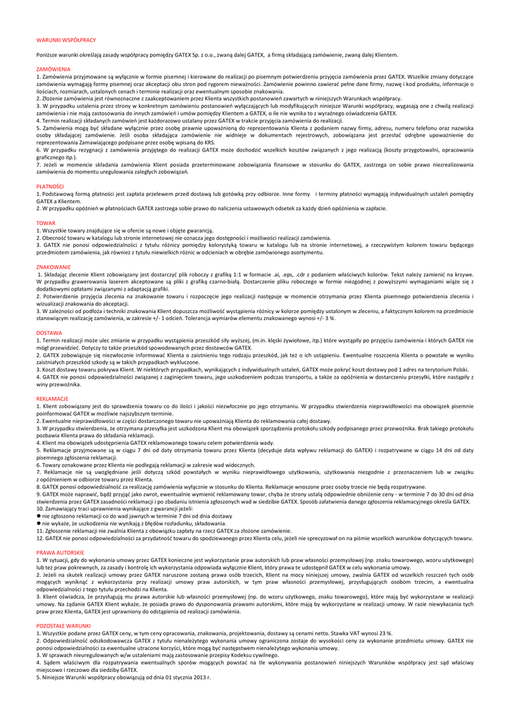 WARUNKI WSPÓŁPRACY Poniższe warunki określają zasady współpracy pomiędzy GATEX Sp. z o.o., zwaną dalej GATEX, a firmą składającą zamówienie, zwaną dalej Klientem. ZAMÓWIENIA 1. Zamówienia przyjmowane są wyłącznie w formie pisemnej i kierowane do realizacji po pisemnym potwierdzeniu przyjęcia zamówienia przez GATEX. Wszelkie zmiany dotyczące zamówienia wymagają formy pisemnej oraz akceptacji obu stron pod rygorem nieważności. Zamówienie powinno zawierać pełne dane firmy, nazwę i kod produktu, informacje o ilościach, rozmiarach, ustalonych cenach i terminie realizacji oraz ewentualnym sposobie znakowania. 2. Złożenie zamówienia jest równoznaczne z zaakceptowaniem przez Klienta wszystkich postanowień zawartych w niniejszych Warunkach współpracy. 3. W przypadku ustalenia przez strony w konkretnym zamówieniu postanowień wyłączających lub modyfikujących niniejsze Warunki współpracy, wygasają one z chwilą realizacji zamówienia i nie mają zastosowania do innych zamówień i umów pomiędzy Klientem a GATEX, o ile nie wynika to z wyraźnego oświadczenia GATEX. 4. Termin realizacji składanych zamówień jest każdorazowo ustalany przez GATEX w trakcie przyjęcia zamówienia do realizacji. 5. Zamówienia mogą być składane wyłącznie przez osobę prawnie upoważnioną do reprezentowania Klienta z podaniem nazwy firmy, adresu, numeru telefonu oraz nazwiska osoby składającej zamówienie. Jeśli osoba składająca zamówienie nie widnieje w dokumentach rejestrowych, zobowiązana jest przesłać odrębne upoważnienie do reprezentowania Zamawiającego podpisane przez osobę wpisaną do KRS. 6. W przypadku rezygnacji z zamówienia przyjętego do realizacji GATEX może dochodzić wszelkich kosztów związanych z jego realizacją (koszty przygotowalni, opracowania graficznego itp.). 7. Jeżeli w momencie składania zamówienia Klient posiada przeterminowane zobowiązania finansowe w stosunku do GATEX, zastrzega on sobie prawo niezrealizowania zamówienia do momentu uregulowania zaległych zobowiązań. PŁATNOŚCI 1. Podstawową formą płatności jest zapłata przelewem przed dostawą lub gotówką przy odbiorze. Inne formy i terminy płatności wymagają indywidualnych ustaleń pomiędzy GATEX a Klientem. 2. W przypadku opóźnień w płatnościach GATEX zastrzega sobie prawo do naliczenia ustawowych odsetek za każdy dzień opóźnienia w zapłacie. TOWAR 1. Wszystkie towary znajdujące się w ofercie są nowe i objęte gwarancją. 2. Obecność towaru w katalogu lub stronie internetowej nie oznacza jego dostępności i możliwości realizacji zamówienia. 3. GATEX nie ponosi odpowiedzialności z tytułu różnicy pomiędzy kolorystyką towaru w katalogu lub na stronie internetowej, a rzeczywistym kolorem towaru będącego przedmiotem zamówienia, jak również z tytułu niewielkich różnic w odcieniach w obrębie zamówionego asortymentu. ZNAKOWANIE 1. Składając zlecenie Klient zobowiązany jest dostarczyć plik roboczy z grafiką 1:1 w formacie .ai, .eps, .cdr z podaniem właściwych kolorów. Tekst należy zamienić na krzywe. W przypadku grawerowania laserem akceptowane są pliki z grafiką czarno-białą. Dostarczenie pliku roboczego w formie niezgodnej z powyższymi wymaganiami wiąże się z dodatkowymi opłatami związanymi z adaptacją grafiki. 2. Potwierdzenie przyjęcia zlecenia na znakowanie towaru i rozpoczęcie jego realizacji następuje w momencie otrzymania przez Klienta pisemnego potwierdzenia zlecenia i wizualizacji znakowania do akceptacji. 3. W zależności od podłoża i techniki znakowania Klient dopuszcza możliwość wystąpienia różnicy w kolorze pomiędzy ustalonym w zleceniu, a faktycznym kolorem na przedmiocie stanowiącym realizację zamówienia, w zakresie +/- 1 odcień. Tolerancja wymiarów elementu znakowanego wynosi +/- 3 %. DOSTAWA 1. Termin realizacji może ulec zmianie w przypadku wystąpienia przeszkód siły wyższej, (m.in. klęski żywiołowe, itp.) które wystąpiły po przyjęciu zamówienia i których GATEX nie mógł przewidzieć. Dotyczy to także przeszkód spowodowanych przez dostawców GATEX. 2. GATEX zobowiązuje się niezwłocznie informować Klienta o zaistnieniu tego rodzaju przeszkód, jak też o ich ustąpieniu. Ewentualne roszczenia Klienta o powstałe w wyniku zaistniałych przeszkód szkody są w takich przypadkach wykluczone. 3. Koszt dostawy towaru pokrywa Klient. W niektórych przypadkach, wynikających z indywidualnych ustaleń, GATEX może pokryć koszt dostawy pod 1 adres na terytorium Polski. 4. GATEX nie ponosi odpowiedzialności związanej z zaginięciem towaru, jego uszkodzeniem podczas transportu, a także za opóźnienia w dostarczeniu przesyłki, które nastąpiły z winy przewoźnika. REKLAMACJE 1. Klient zobowiązany jest do sprawdzenia towaru co do ilości i jakości niezwłocznie po jego otrzymaniu. W przypadku stwierdzenia nieprawidłowości ma obowiązek pisemnie poinformować GATEX w możliwie najszybszym terminie. 2. Ewentualne nieprawidłowości w części dostarczonego towaru nie upoważniają Klienta do reklamowania całej dostawy. 3. W przypadku stwierdzenia, że otrzymana przesyłka jest uszkodzona Klient ma obowiązek sporządzenia protokołu szkody podpisanego przez przewoźnika. Brak takiego protokołu pozbawia Klienta prawa do składania reklamacji. 4. Klient ma obowiązek udostępnienia GATEX reklamowanego towaru celem potwierdzenia wady. 5. Reklamacje przyjmowane są w ciągu 7 dni od daty otrzymania towaru przez Klienta (decyduje data wpływu reklamacji do GATEX) i rozpatrywane w ciągu 14 dni od daty pisemnego zgłoszenia reklamacji. 6. Towary oznakowane przez Klienta nie podlegają reklamacji w zakresie wad widocznych. 7. Reklamacje nie są uwzględniane jeśli dotyczą szkód powstałych w wyniku nieprawidłowego użytkowania, użytkowania niezgodnie z przeznaczeniem lub w związku z opóźnieniem w odbiorze towaru przez Klienta. 8. GATEX ponosi odp