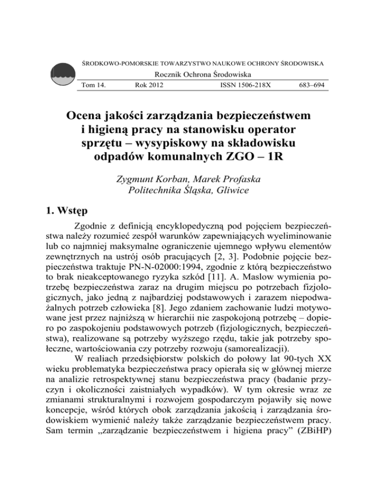 ŚRODKO OWO-POMORSKIE TOWARZYSTWO T NAUKOWE N OCHRO ONY ŚRODOWISKA A Roocznik Ochrona Środowiska Ś Tom 14. Rok 20122 ISSN 1506-218X X 683–6944 Ocena jakości j zarrządzania bezpieczeeństwem i higiieną pracyy na stanow wisku operrator sprzęętu – wysyypiskowy na n składow wisku od dpadów komunalnycch ZGO – 1R Zygmunt Korban, K Mareek Profaska Politechhnika Śląska, Gliwice 1.. Wstęp Zgodnie z definicją enncyklopedyczn ną pod pojęciiem bezpieczeeństw wa należy rozuumieć zespół warunków w zap pewniających w wyeliminowannie lubb co najmniej maksymalne ograniczenie ujemnego u wpłływu elementóów zeewnętrznych na n ustrój osób pracujących [2, 3]. Podobnnie pojęcie beezpieczeństwa trakktuje PN-N-022000:1994, zg godnie z którą bezpieczeństw wo to brak nieakcepptowanego ryzzyka szkód [1 11]. A. Maslow w wymienia pop trzzebę bezpieczeństwa zaraz na drugim miejscu m po pottrzebach fizjollogiccznych, jako jedną j z najbarrdziej podstaw wowych i zaraazem niepodw ważaalnych potrzebb człowieka [8]. Jego zdanieem zachowaniee ludzi motyw wowaane jest przez najniższą w hierarchii h nie zaspokojoną z pootrzebę – dopiiero po zaspokojeeniu podstawow wych potrzeb (fizjologicznyych, bezpieczeeństw wa), realizowaane są potrzebby wyższego rzędu, r takie jaak potrzeby sppołecczne, wartościiowania czy pootrzeby rozwojju (samorealizzacji). W realiaach przedsiębiiorstw polskicch do połowy lat 90-tych XX X wiieku problemaatyka bezpieczzeństwa pracy opierała się w głównej mierrze naa analizie retroospektywnej stanu s bezpieczzeństwa pracyy (badanie przzyczzyn i okolicznności zaistniałłych wypadkó ów). W tym ookresie wraz ze zm mianami struktturalnymi i roozwojem gosp podarczym pojjawiły się now we kooncepcje, wśróód których obbok zarządzaniia jakością i zzarządzania śrrodoowiskiem wym mienić należy także zarządzzanie bezpieczzeństwem praccy. Saam termin „zaarządzanie beezpieczeństwem m i higiena ppracy” (ZBiH HP) 684 Zygmunt Korban, Marek Profaska należy traktować jako pewne uproszczenie myślowe, które dotyczy działań organizacyjnych i procesów decyzyjnych podejmowanych w ramach funkcji kierowania [5]. Jest ono działalnością kierowniczą obejmującą te aspekty ogólnego zarządzania, które wiążą się z rozwijaniem i realizacją polityki bezpieczeństwa i higieny pracy [4]. Istotę filozofii ZBiHP najlepiej oddaje stwierdzenie jej twórcy, mówiące o tym, iż „niebezpieczne czynności, niebezpieczne warunki oraz wypadki to zjawiska, zdarzenia, które są przejawem zakłóceń w systemie zarządzania” [9]. Aktualnie stosowane środki techniczne służące poprawie stanu bhp osiągnęły na tyle zadawalający poziom iż możliwości poprawy stanu bezpieczeństwa upatruje się coraz częściej w sferze postaw i zachowań ludzi w procesie pracy. Dlatego też obok badań przyczyn i okoliczności zaistniałych wypadków podejmowane są działania o charakterze prewencyjnym ukierunkowane na badanie potencjału zagrożeniowego przy coraz szerszym wykorzystaniu technik komputerowych [1, 10, 13–16]. Cele te mogą być realizowane m. in. poprzez badania audytowe systemu zarządzania bezpieczeństwem i higieną pracy (na poziomie całego zakładu, czy też elementów wydzielonych w jego strukturze) oraz procedury zarządzania ryzykiem zawodowym (analiza i ocena ryzyka zawodowego). W ramach niniejszego artykułu dla potrzeb realizacji badań audytowych wykorzystana została ankieta autorska oparta na metodzie Management Evaluation Regarding Itemized Tendencies (MERIT). Zastosowana metoda badań ankietowych należy do grupy metod badań bezpośrednich (grupowy sondaż opinii ekspertów), gdzie grono ekspertów stanowili pracownicy funkcyjni, nadzoru i personel wykonawczy zatrudniony na stanowiskach pracy zlokalizowanych na składowisku odpadów komunalnych ZGO – 1R. Postawione w ramach badań pytania pogrupowane zostały w dziewięć obszarów problemowych: A. Planowanie działań w obszarze zarządzania bezpieczeństwem pracy. B. Badanie wypadków. C. Kontrola i inspekcja BHP. D. Obserwacja i analiza sposobu wykonywania pracy. E. Ochrona osobista. F. Przepisy BHP w zakładzie. G. Informowanie o stanie BHP. H. Promocja BHP. I. Osobista ocena warunków BHP w zakładzie. Ocena jakości zarządzania bezpieczeństwem i higieną pracy… 685 Zadaniem respondentów było udzielenie odpowiedzi na stawiane pytania poprzez zakreślenie jednej i tylko jednej z odpowiedzi punktowanych w skali od 0 do 4 przy czym wartości 0 odpowiadała ocena niedostateczna, a wartości 4 – ocena idealna. W oparciu o zrealizowane ankiety wyznaczane zostały wskaźniki ocenowe dla poszczególnych obszarów problemowych (WOPA–WOPI), a następnie wskaźnik oceny jakości zarządzania bezpieczeństwem i higieną pracy (WZBP) dla przedmiotowego stanowiska roboczego. Model matematyczny wykorzystywany w ramach metody został omówiony w pozycji [5, 6]. Ocena ryzyka zawodowego na przedmiotowym stanowisku pracy przeprowadzona została za pomocą dwóch metod: metody Polskiej Normy PN-N-18002:2000 [12] i metody Politechniki Śląskiej [7]. W przypadku pierwszej z wymienionych metod ocena ryzyka (R) wyznaczona została w oparciu o dwa parametry: prawdopodobieństwa wystąpienia (P) oraz ciężkość następstw (N), w przypadku drugiej – w oparciu o trzy parametry (prawdopodobieństwa wystąpienia, ciężkość następstw i czas trwania czynności). O ile w przypadku metody Polskiej Normy można mówić o wykorzystaniu klasycznej macierzy oceny ryzyka, o tyle w przypadku metody Politechniki Śląskiej istnieje możliwość wyznaczenia wskaźnika ryzyka czynności – WRCZ oraz wskaźników określających udziału czynności niebezpiecznych – WUCN, szczególnie niebezpiecznych – WUCSN, czy też krytycznych – WUCK. 2. Opis stanowiska pracy operator sprzętu – wysypiskowy w Zakładzie Gospodarki Odpadami – 1R Zakład Gospodarki Odpadami – 1R 
