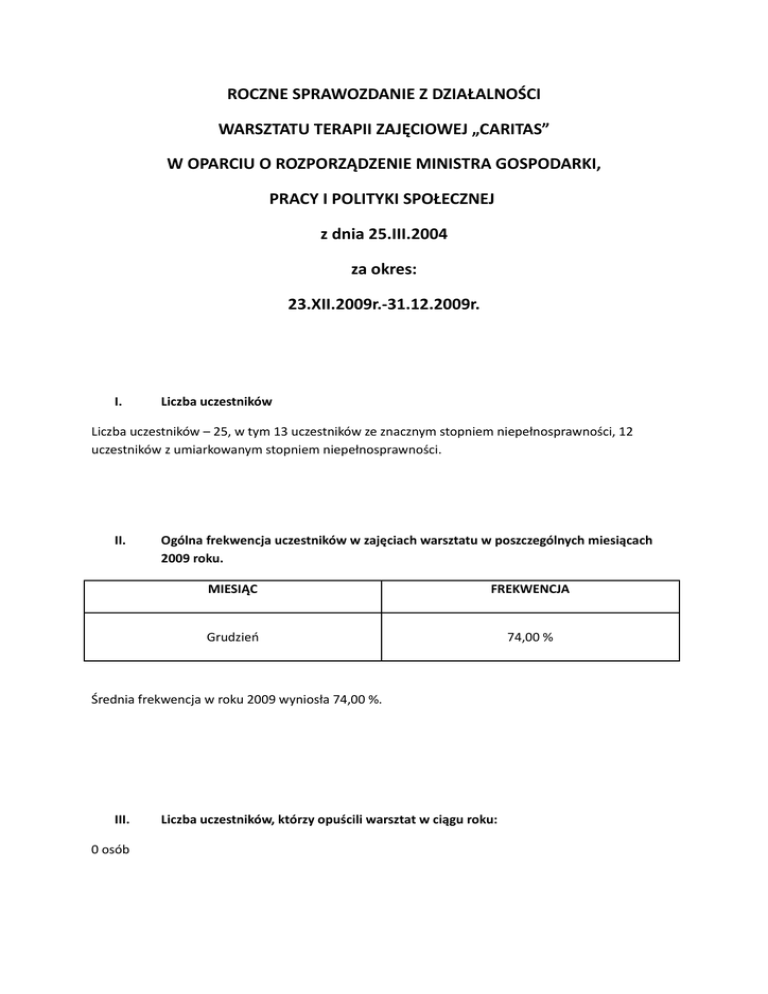 ROCZNE SPRAWOZDANIE Z DZIAŁALNOŚCI WARSZTATU TERAPII ZAJĘCIOWEJ „CARITAS” W OPARCIU O ROZPORZĄDZENIE MINISTRA GOSPODARKI, PRACY I POLITYKI SPOŁECZNEJ z dnia 25.III.2004 za okres: 23.XII.2009r.-31.12.2009r. I. Liczba uczestników Liczba uczestników – 25, w tym 13 uczestników ze znacznym stopniem niepełnosprawności, 12 uczestników z umiarkowanym stopniem niepełnosprawności. II. Ogólna frekwencja uczestników w zajęciach warsztatu w poszczególnych miesiącach 2009 roku. MIESIĄC FREKWENCJA Grudzień 74,00 % Średnia frekwencja w roku 2009 wyniosła 74,00 %. III. 0 osób Liczba uczestników, którzy opuścili warsztat w ciągu roku: IV. Formy i metody realizowanej przez warsztat działalności rehabilitacyjnej w roku 2009: FORMY METODY 1. MUZYKOTERAPIA ARTETERAPIA 2. RYSUNEK TERAPETYCZNY EFEKTY • rozwój osobowości, • wzrost własnej kreatywności, • leczy, zapobiega pogłębianiu się stanów chorobowych, • obniża napięcie nerwowe, uspokaja, wycisza, • pomaga zrozumieć codzienne problemy, • pozwala na pełniejsze i swobodniejsze wyrażanie siebie, • rozwija, pobudza wyobraźnię, • pomaga w uświadomieniu sobie własnych przekonań i uczuć, oraz w lepszym zrozumieniu siebie, • uwalnia od przykrych wspomnień i niepokojów, • w wyniku procesu twórczego u osoby tworzącej - zostają uwolnione i odreagowane nagromadzone emocje, • zostaje uaktywniona sfera komunikacji niewerbalnej, • rozwijanie własnych działań twórczych, • pozawerbalne porozumiewanie się, • uzewnętrznienie świata własnych • • • • • • • • • • PSYCHOTERAPIA 1. PSYCHOTERAPIA INDYWIDUALNA 2. PSYCHOTERAPIA GRUPOWA 3. PORADNICTWO – WSPARCIE PSYCHOSPOŁECZNE • • • • • przeżyć i odczuć, zaspokajanie potrzeb: akceptacji, bezpieczeństwa, współuczestniczenia, bycia rozumianym i docenianym, pobudzenie sensoryczne wielozmysłowe postrzeganie świata, poznawanie innych zmiana optyki widzenia swoich problemów, akceptacja siebie i innych, wzmacnia się poczucie sprawstwa i bezpieczeństwa, zwiększa się poziom samowiedzy i akceptacji siebie, wzmaga się świadomość motywów własnych działań i zachowań, kreowanie przestrzeni, poznawanie dystansu i granic, tworzenie pozytywnych nawyków i reakcji, relaks, przyjemność, odpoczynek. trening umiejętności społecznych; trening relaksacji; trening umiejętności komunikacji; podnoszenie umiejętności interpersonalnych; psychologiczne wsparcie osób niepełnosprawnyc • REHABILITACJA RUCHOWA 1. KINEZYTERAPIA – ZAJĘCIA INDYWIDUALNE I GRUPOWE Z REHABILITATNEM 2. REHABILITACJA RUCHOWA PROWADZONA POD KIERUNKIEM REHABILITANTA Typowymi dla danej pracowni; • • • • TERAPIA ZAJĘCIOWA W ZAKRESIE POSZCZEGÓLNYCH PRACOWNI 1. PRACOWNIA za powierzone zadania; 2. INFORMATYCZNOKOMPUTEROWA • • 3. PRACOWNIA STOLARSKA 4. PRACOWNIA OGRODNICZA 5. PRACOWNIA PLASTYCZNA • • 6. PRACOWNIA GOSPODARSTWA DOMOWEGO V. • Liczba uczestników, którzy poczynili postępy w zakresie: - zaradności osobistej i samodzielności; - rehabilitacji społecznej; - rehabilitacji zawodowej wraz z opisem tych postępów; SFERA ILOŚĆ OSÓB OPIS POSTĘPÓW h; psychologiczne wsparcie rodzin osób niepełnosprawnyc h Zmniejszenie napięcia mięśniowego; Poprawa zdolności w zakresie motoryki dużej i małej; Poprawa koordynacji wzrokowo – ruchowej; Poprawa oraz utrzymanie kondycji ogólnej organizmu; Posługiwanie się narzędziami i urządzeniami; Umiejętność organizowania stanowiska pracy; Dbałość o otoczenie; Kształtowanie odpowiedzialności Kształtowanie umiejętności w zakresie poszczególnych pracowni Ze względu na krótki okres działalności placówki nie jest możliwe określenie postępów w poszczególnych sferach. VI. Informacje o decyzjach podjętych przez Radę Programową w stosunku do uczestników warsztatu. 1. Rada Programowa w systemie półrocznym dokonuje oceny postępów każdego z uczestników warsztatu na podstawie Indywidualnego Arkusza Oceny Postępów w Rehabilitacji.