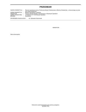 PRZEDMIAR NAZWA INWESTYCJI : ADRES INWESTYCJI INWESTOR ADRES INWESTORA BRANśA : : : : Remont ogrodzenia terenu Publicznej Szkoły Podstawowej w Błotnicy Strzeleckiej - zniszczonego po przejsciu traby powietrznej Błotnica Strzelecka ul.Szkolna Gminny Zarząd Oświaty i Wychowania w Strzelcach Opolskich ul.Wałowa 5, 47-100 Strzelce Opolskie budowlana SPORZĄDZIŁ KALKULACJE : inŜ. Sylwester Kaczmarek INWESTOR : Data opracowania Dokument został opracowany przy pomocy programu NORMA PRO PRZEDMIAR Załącznik Remont ogrodzenia terenu Publicznej Szkoły Podstawowej w Błotnicy Strzeleckiej - zniszczonego po przejsciu traby powietrznej Lp. Podst Opis i wyliczenia j.m. Poszcz Razem Remont ogrodzenia terenu Publicznej Szkoły Podstawowej w Błotnicy Strzeleckiej - zniszczonego po przejsciu traby powietrznej 1 KNR 2-25 Ogrodzenie z elementów panelowych wysokości 143cm, dł. 250cm wypełnio- m2 0307-01 ne prętami pionowymi fi 6mm, co 50 mm przepuszczonymi przez ceownik zimnogięty NP 20 co 200mm ograniczone płaskownikiem 30x4mm na słupkach systemowych, stalowych z kształtowników zamkniętych 60x60mm obsadzonych w prefabrykowanych, obetonowanych fundamentach. Całość elementów ocynkowana. 108.0*1.43 m2 154.440 RAZEM 154.440 2 KNR 2-25 Bramy z siatki w ramach z kształtowników stalowych ze słupkami z rur lub m2 0312-01 kształtowników stalowych - budowa 4.5*1.45 m2 6.525 RAZEM 6.525 3 KNR 2-25 Furtki z siatki w ramach z kształtowników stalowych ze słupkami z rur lub m2 0312-01 kształtowników stalowych - 2 szt - budowa 1.05*1.45*2 m2 3.045 RAZEM 3.045 4 KNR 2-25 Ogrodzenie z siatki plecionej o oczkach 50x50mm, z drutu ocynk. fi 2,6mm, m2 0307-01 powlekanej polietylenem, na słupkach stalowych powlekanych polietylenem 85.5*1.5 m2 128.250 RAZEM 128.250 5 KNR 2-01 Ręczne wykopy ciągłe lub jamiste ze skarpami o szer.dna do 1.5 m i głębok.do m3 0310-01 1.5m ze złoŜeniem urobku na odkład (kat.gr.I-II) 0.4*0.4*0.9*41 m3 5.904 RAZEM 5.904 6 KNR 2-01 Ręczne plantowanie powierzchni gruntu rodzimego kat.I-III - rozplantowanie m2 0505-01 gruntu z rowka pod ławę 1.0*2*113 m2 226.000 RAZEM 226.000 7 KNR 2-31 Elementy cokołowe Ŝelbetowe prefabrykowane o wymiarach 5x20x250cm m 0407-05 ustawione na prefabrykowanych fundamentach słupków analogia 179.0 m 179.000 RAZEM 179.000 8 KNR 4-01 Remont istniejącego cokołu - uzupełnienie betonem i otynkowanie tynkiem ce- m2 0726-03 mentowym kat. III (0.3*2+0.25)*40.5+(0.4*2+0.25)*24.0 m2 59.625 RAZEM 59.625 9 KNR-W 4-01 Remont istniejącego ogrodzenia z siatki w ramach, prostowanie, uzupełnianie m2 1301-10 elementów 4 elementy i furtka 1.4*2.5*4+1.2*1.4 m2 15.680 RAZEM 15.680 10 KNR-W 4-01 Dwukrotne malowanie farbą olejną siatek ciągnionych i plecionych z ramkami m2 1212-11 stalowymi - istniejące ogrodzenie 64.0*1.4 m2 89.600 RAZEM 89.600 11 KNR 2-25 Rozebranie istniejącego ogrodzenia z siatki w ramach na słupkach stalowych m2 0307-03 9.0*1.4 m2 12.600 RAZEM 12.600 12 KNR 4-01 Rozebranie cokołu murowanego z cegły m3 0349-04 9.0*0.25*0.4 m3 0.900 RAZEM 0.900 13 KNR 4-01 Rozbiórka elementów konstrukcji betonowych niezbrojonych o grubości do 15 m3 0212-01 cm - rozbiórka nawierzchni z betonu 1.8*2.5*0.1 m3 0.450 RAZEM 0.450 14 KNR 4-01 Wykopy wąskoprzestrzenne, nieumocnione o szerokości dna do 1.5 m i głębo- m3 0102-03 kości do 1.5 m w gruncie kat. IV 1.8*2.5*0.2 m3 0.900 RAZEM 0.900 15 KNNR 6 Chodniki z płyt betonowych o wymiarach 50x50x7 cm na podsypce piaskowej, m2 0503-06 spoiny wypełnione piaskiem 1.8*2.5 m2 4.500 RAZEM 4.500 2 Norma PRO Wersja 4.23