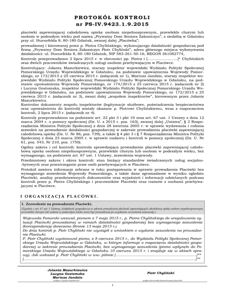 PROTOKÓŁ KONTROLI nr PS-IV.9423.1.9.2015 placówki zapewniającej całodobową opiekę osobom niepełnosprawnym, przewlekle chorym lub osobom w podeszłym wieku pod nazwą „Prywatny Dom Seniora Zakoniczyn”, z siedzibą w Gdańsku przy ul. Huenefelda 8, 80-180 Gdańsk, zwanej dalej „Placówką”; prowadzonej i kierowanej przez p. Piotra Chylińskiego, wykonującego działalność gospodarczą pod firmą „Prywatny Dom Seniora Zakoniczyn Piotr Chyliński”, adres głównego miejsca wykonywania działalności: ul. Huenefelda 8, 80-180 Gdańsk, NIP 583-261-50-16, REGON 361082774, Kontrolę przeprowadzono 2 lipca 2015 r. w obecności pp. Piotra i [………………..….]* Chylińskich oraz dwóch pracowników świadczących usługi osobom przebywającym w Placówce. Kontrolujący: Jolanta Mazurkiewicz, starszy inspektor wojewódzki Wydziału Polityki Społecznej Pomorskiego Urzędu Wojewódzkiego w Gdańsku, na podstawie upoważnienia Wojewody Pomorskiego, nr 173/2015 z 25 czerwca 2015 r. (załącznik nr 1), Mariusz Jandzio, starszy inspektor wojewódzki Wydziału Polityki Społecznej Pomorskiego Urzędu Wojewódzkiego w Gdańsku, na podstawie upoważnienia Wojewody Pomorskiego, nr 174/2015 z 25 czerwca 2015 r. (załącznik nr 2) i Lucyna Gostomska, inspektor wojewódzki Wydziału Polityki Społecznej Pomorskiego Urzędu Wojewódzkiego w Gdańsku, na podstawie upoważnienia Wojewody Pomorskiego, nr 172/2015 z 25 czerwca 2015 r. (załącznik nr 3), zwani dalej „zespołem inspektorów”, kierowanym przez Jolantę Mazurkiewicz. Kontrolne dokumenty zespołu inspektorów (legitymacje służbowe, poświadczenia bezpieczeństwa oraz upoważnienia do kontroli) zostały okazane p. Piotrowi Chylińskiemu, wraz z rozpoczęciem kontroli, 2 lipca 2015 r. (załącznik nr 4). Kontrolę przeprowadzono na podstawie art. 22 pkt 3 i pkt 10 oraz art. 67 ust. 1 Ustawy z dnia 12 marca 2004 r. o pomocy społecznej (Dz. U. z 2015 r. poz. 163), zwanej dalej „Ustawą”, § 2 Rozporządzenia Ministra Polityki Społecznej z dnia 28 kwietnia 2005 r. w sprawie wydawania i cofania zezwoleń na prowadzenie działalności gospodarczej w zakresie prowadzenia placówki zapewniającej całodobową opiekę (Dz. U. Nr 86, poz. 739), a także § 4 pkt 3 i § 7 Rozporządzenia Ministra Polityki Społecznej z dnia 23 marca 2005 r. w sprawie nadzoru i kontroli w pomocy społecznej (Dz. U. Nr 61, poz. 543, Nr 210, poz. 1750). Ogólny zakres i cel kontroli: kontrola sprawdzająca prowadzenie placówki zapewniającej całodobową opiekę osobom niepełnosprawnym, przewlekle chorym lub osobom w podeszłym wieku, bez wymaganego, na podstawie art. 67 ust. 1 Ustawy, zezwolenia wojewody. Przedmiotowy zakres i okres kontroli: stan bieżący standardów świadczonych usług socjalno-bytowych oraz przestrzeganie praw osób przebywających w Placówce. Protokół zawiera informacje zebrane w toku postępowania w sprawie prowadzenia Placówki bez wymaganego zezwolenia Wojewody Pomorskiego, a także dane zgromadzone w wyniku oględzin Placówki, analizy przedstawionych dokumentów oraz wyjaśnień i informacji udzielanych podczas kontroli przez p. Piotra Chylińskiego i pracowników Placówki oraz rozmów z osobami przebywającymi w Placówce. I ORGANIZACJA PLACÓWKI. 1. Zezwolenie na prowadzenie Placówki. (Zgodnie z art. 67 ust. 1 Ustawy, działalność gospodarcza w zakresie prowadzenia placówek zapewniających całodobową opiekę osobom niepełnosprawnym, przewlekle chorym lub osobom w podeszłym wieku może być prowadzona po uzyskaniu zezwolenia wojewody.) Wojewoda Pomorski wezwał, pismem z 7 maja 2015 r., p. Piotra Chylińskiego do uregulowania sytuacji Placówki prowadzonej w ramach działalności gospodarczej bez wymaganego zezwolenia (korespondencję doręczono Stronie 13 maja 2015 r.). Do dnia kontroli p. Piotr Chyliński nie wystąpił z wnioskiem o wydanie zezwolenia na prowadzenie Placówki. P. Piotr Chyliński wystosował pismo, z 8 czerwca 2015 r., do Wydziału Polityki Społecznej Pomorskiego Urzędu Wojewódzkiego w Gdańsku, w którym informuje o rozpoczęciu działalności gospodarczej w zakresie prowadzenia Placówki, bez wymaganego zezwolenia (pismo wpłynęło do Pomorskiego Urzędu Wojewódzkiego w Gdańsku 10 czerwca 2015 r. i znajduje się w aktach sprawy). Jak wskazał p. Piotr Chyliński w ww. piśmie [………………………...……………………………..]** [………………………………………………………………………………………………………………………..]** Jolanta Mazurkiewicz Lucyna Gostomska Mariusz Jandzio Piotr Chyliński podpisy zespołu inspektorów podpis kierownika kontrolowanej placówki 1 Protokół nr PS-IV.9423.1.9.2015 z przeprowadzonej 2 lipca 2015 r. kontroli standardu świadczonych usług przez placówkę zapewniającą całodobową opiekę osobom niepełnosprawnym, przewlekle chorym lub osobom w podeszłym wieku pod nazwą „Prywatny Dom Seniora Zakoniczyn”, z siedzibą w Gdańsku przy ul. Huenefelda 8, 80-180 Gdańsk. P. Piotr Chyliński poinformował zespół inspektorów, że [………………………]**, w którym mieści się Placówka [……………………..………]** obiekt wymaga dokonania szeregu zmian i dostosowania do obowiązujących przepisów, w tym zainstalowania windy, gdyż pokoje mieszkalne znajdują się na pierwszej i drugiej kondygnacji. Z rozmów przeprowadzanych w trakcie kontroli z osobami przebywającymi w Placówce wynika, że zostały przeniesione do Placówki z zlikwidowanej placówki zapewniającej całodobową opiekę osobom niepełnosprawnym, przewlekle chorym lub osobom w podeszłym wieku, z siedzibą w Jankowie Gdańskim przy ul. Hiacyntowej 1, 80-180 Gdańsk, [……………………………………………………………………………………………………………….]* – znaki spraw: PS-IV.9423.1.9.2012 i PS-IV.9423.1.19.2013), [……………………………
