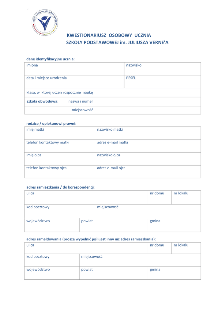 KWESTIONARIUSZ OSOBOWY UCZNIA SZKOŁY PODSTAWOWEJ im. JULIUSZA VERNE’A dane identyfikacyjne ucznia: imiona nazwisko data i miejsce urodzenia PESEL klasa, w której uczeń rozpocznie naukę szkoła obwodowa: nazwa i numer miejscowość rodzice / opiekunowi prawni: imię matki nazwisko matki telefon kontaktowy matki adres e-mail matki imię ojca nazwisko ojca telefon kontaktowy ojca adres e-mail ojca adres zamieszkania / do korespondencji: ulica kod pocztowy województwo nr domu nr lokalu miejscowość powiat gmina adres zameldowania (proszę wypełnić jeśli jest inny niż adres zamieszkania): ulica nr domu kod pocztowy miejscowość województwo powiat gmina nr lokalu istotne informacje dotyczące ucznia: w tym związane ze stanem zdrowia, alergiami, przyjmowanymi lekami, orzeczeniami o stopniu niepełnosprawności, opiniami z poradni psychologiczno-pedagogicznej, etc. Czy uczeń będzie korzystał z opieki na świetlicy? (proszę zaznaczyć wybór) tak nie Czy uczeń będzie korzystał z posiłków w szkole? (proszę zaznaczyć wybór) tak nie W jakich zajęciach pozalekcyjnych uczeń będzie uczestniczył? (zaznaczyć wybrane): taniec szachy piłka nożna trening pływacki tenis ziemny zajęcia plastyczne kółko fotograficzne kółko informatyczne zespół muzyczny warsztaty kulinarne załączniki 2 zdjęcia legitymacyjne świadectwo ukończenia klasy poprzedzającej informacja o gotowości dziecka do podjęcia nauki w szkole podstawowej orzeczenie o stopniu niepełnosprawności orzeczenie o potrzebie kształcenia specjalnego opinia psychologiczno-pedagogiczna inne ……………………………… Wyrażam zgodę na przetwarzanie danych osobowych zawartych w kwestionariuszu dla potrzeb rekrutacji i działań dokumentacyjnych szkoły, zgodnie z ustawą z dnia 29.08.1997 r. o ochronie danych osobowych. (Dz. U. z 2002 r. nr 101, poz. 926 ze zm.) data, imię i nazwisko oraz podpis osoby wypełniającej kwestionariusz Kielce, dnia ………………………………2016r. ………………………………………………………………………………………………………………………………………………