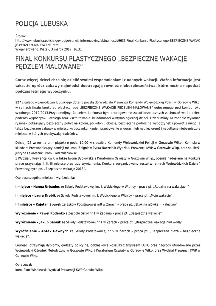 POLICJA LUBUSKA Źródło: http://www.lubuska.policja.gov.pl/go/serwis-informacyjny/aktualnosci/9633,Final-Konkursu-Plastycznego-BEZPIECZNE-WAKAC JE-PEDZLEM-MALOWANE.html Wygenerowano: Piątek, 3 marca 2017, 16:31 FINAŁ KONKURSU PLASTYCZNEGO „BEZPIECZNE WAKACJE PĘDZLEM MALOWANE” Coraz więcej dzieci chce się dzielić swoimi wspomnieniami z udanych wakacji. Ważna informacja jest taka, że oprócz zabawy najmłodsi dostrzegają również niebezpieczeństwa, które można napotkać podczas letniego wypoczynku. 227 z całego województwa lubuskiego dotarło pocztą do Wydziału Prewencji Komendy Wojewódzkiej Policji w Gorzowie Wlkp. w ramach finału konkursu plastycznego „BEZPIECZNE WAKACJE PĘDZLEM MALOWANE” ogłoszonego pod koniec roku szkolnego 2012/2013.Przypomnijmy, że celem konkursu było propagowanie zasad bezpiecznych zachowań wśród dzieci podczas wypoczynku letniego oraz kształtowanie świadomości wiktymologicznej dzieci. Dzieci miały za zadanie wykonać rysunek pokazujący bezpieczny pobyt na koloni, półkolonii, obozie, bezpieczną podróż na wypoczynek i powrót z niego, a także bezpieczne zabawy w miejscu wypoczynku (kąpiel, przebywanie w górach lub nad jeziorem) i napotkane niebezpieczne miejsca, w których przebywają rówieśnicy. Dzisiaj (13 września br. - piątek) o godz. 10.00 w siedzibie Komendy Wojewódzkiej Policji w Gorzowie Wlkp., Komisja w składzie: Przewodniczący Komisji mł. insp. Zbigniew Pytka Naczelnik Wydziału Prewencji KWP w Gorzowie Wlkp. oraz st. sierż. Justyna Ławreszuk i kom. Piotr Wiśniewski z Wydziału Prewencji KWP, a także Iwona Bydłowska z Kuratorium Oświaty w Gorzowie Wlkp., oceniła nadesłane na Konkurs prace przyznając I, II, III miejsce oraz trzy wyróżnienia. Konkurs zorganizowany został w ramach Wojewódzkich Działań Prewencyjnych pn. „Bezpieczne wakacje 2013”. Oto poszczególne miejsca i wyróżnienia: I miejsce - Hanna Urbaniec ze Szkoły Podstawowej im. J. Wybickiego w Witnicy – praca pt. „Rodzina na wakacjach” II miejsce - Laura Drobik ze Szkoły Podstawowej im. J. Wybickiego w Witnicy – praca pt. „Moje wakacje” III miejsce – Kajetan Spurek ze Szkoły Podstawowej nr8 w Żarach – praca pt. „Skok na główkę = kalectwo” Wyróżnienie – Paweł Rodenko z Zespołu Szkół nr 1 w Żaganiu – praca pt. „Bezpieczne wakacje” Wyróżnienie – Jakub Saniuk ze Szkoły Podstawowej nr 1 w Żarach – praca pt. „Bezpieczne wakacje nad wodą” Wyróżnienie – Antek Gawnych ze Szkoły Podstawowej nr 5 w Żarach – praca pt. „Bezpieczna plaża – bezpieczne wakacje”. Laureaci otrzymają dyplomy, gadżety policyjne, odblaskowe koszulki z tygrysem LUPO oraz nagrody ufundowane przez Wojewódzki Ośrodek Metodyczny w Gorzowie Wlkp. i Kuratorium Oświaty w Gorzowie Wlkp. oraz Wydział Prewencji KWP w Gorzowie Wlkp. Opracował: kom. Piotr Wiśniewski Wydział Prewencji KWP Gorzów Wlkp. Finał Konkursu Plastycznego „BEZPIECZNE WAKACJE PĘDZLEM MALOWANE” Finał Konkursu Plastycznego „BEZPIECZNE WAKACJE PĘDZLEM MALOWANE” Finał Konkursu Plastycznego „BEZPIECZNE WAKACJE PĘDZLEM MALOWANE” Finał Konkursu Plastycznego „BEZPIECZNE WAKACJE PĘDZLEM MALOWANE” Ocena: 0/5 (0) Tweetnij