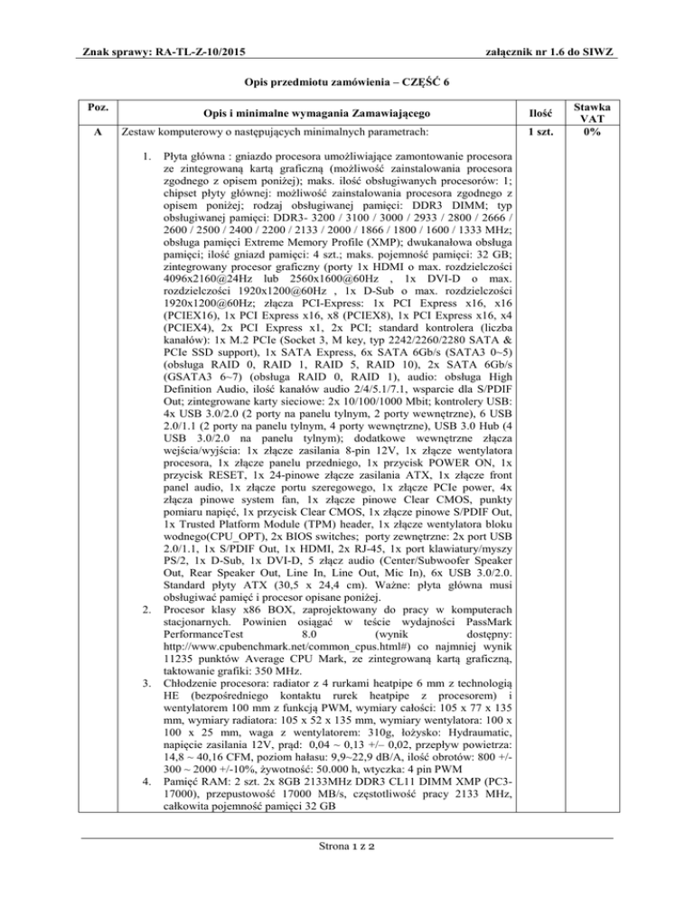 Znak sprawy: RA-TL-Z-10/2015 załącznik nr 1.6 do SIWZ Opis przedmiotu zamówienia – CZĘŚĆ 6 Poz. A Opis i minimalne wymagania Zamawiającego Ilość Zestaw komputerowy o następujących minimalnych parametrach: 1 szt. 1. 2. 3. 4. Płyta główna : gniazdo procesora umożliwiające zamontowanie procesora ze zintegrowaną kartą graficzną (możliwość zainstalowania procesora zgodnego z opisem poniżej); maks. ilość obsługiwanych procesorów: 1; chipset płyty głównej: możliwość zainstalowania procesora zgodnego z opisem poniżej; rodzaj obsługiwanej pamięci: DDR3 DIMM; typ obsługiwanej pamięci: DDR3- 3200 / 3100 / 3000 / 2933 / 2800 / 2666 / 2600 / 2500 / 2400 / 2200 / 2133 / 2000 / 1866 / 1800 / 1600 / 1333 MHz; obsługa pamięci Extreme Memory Profile (XMP); dwukanałowa obsługa pamięci; ilość gniazd pamięci: 4 szt.; maks. pojemność pamięci: 32 GB; zintegrowany procesor graficzny (porty 1x HDMI o max. rozdzielczości 4096x2160@24Hz lub 2560x1600@60Hz , 1x DVI-D o max. rozdzielczości 1920x1200@60Hz , 1x D-Sub o max. rozdzielczości 1920x1200@60Hz; złącza PCI-Express: 1x PCI Express x16, x16 (PCIEX16), 1x PCI Express x16, x8 (PCIEX8), 1x PCI Express x16, x4 (PCIEX4), 2x PCI Express x1, 2x PCI; standard kontrolera (liczba kanałów): 1x M.2 PCIe (Socket 3, M key, typ 2242/2260/2280 SATA & PCIe SSD support), 1x SATA Express, 6x SATA 6Gb/s (SATA3 0~5) (obsługa RAID 0, RAID 1, RAID 5, RAID 10), 2x SATA 6Gb/s (GSATA3 6~7) (obsługa RAID 0, RAID 1), audio: obsługa High Definition Audio, ilość kanałów audio 2/4/5.1/7.1, wsparcie dla S/PDIF Out; zintegrowane karty sieciowe: 2x 10/100/1000 Mbit; kontrolery USB: 4x USB 3.0/2.0 (2 porty na panelu tylnym, 2 porty wewnętrzne), 6 USB 2.0/1.1 (2 porty na panelu tylnym, 4 porty wewnętrzne), USB 3.0 Hub (4 USB 3.0/2.0 na panelu tylnym); dodatkowe wewnętrzne złącza wejścia/wyjścia: 1x złącze zasilania 8-pin 12V, 1x złącze wentylatora procesora, 1x złącze panelu przedniego, 1x przycisk POWER ON, 1x przycisk RESET, 1x 24-pinowe złącze zasilania ATX, 1x złącze front panel audio, 1x złącze portu szeregowego, 1x złącze PCIe power, 4x złącza pinowe system fan, 1x złącze pinowe Clear CMOS, punkty pomiaru napięć, 1x przycisk Clear CMOS, 1x złącze pinowe S/PDIF Out, 1x Trusted Platform Module (TPM) header, 1x złącze wentylatora bloku wodnego(CPU_OPT), 2x BIOS switches; porty zewnętrzne: 2x port USB 2.0/1.1, 1x S/PDIF Out, 1x HDMI, 2x RJ-45, 1x port klawiatury/myszy PS/2, 1x D-Sub, 1x DVI-D, 5 złącz audio (Center/Subwoofer Speaker Out, Rear Speaker Out, Line In, Line Out, Mic In), 6x USB 3.0/2.0. Standard płyty ATX (30,5 x 24,4 cm). Ważne: płyta główna musi obsługiwać pamięć i procesor opisane poniżej. Procesor klasy x86 BOX, zaprojektowany do pracy w komputerach stacjonarnych. Powinien osiągać w teście wydajności PassMark PerformanceTest 8.0 (wynik dostępny: http://www.cpubenchmark.net/common_cpus.html#) co najmniej wynik 11235 punktów Average CPU Mark, ze zintegrowaną kartą graficzną, taktowanie grafiki: 350 MHz. Chłodzenie procesora: radiator z 4 rurkami heatpipe 6 mm z technologią HE (bezpośredniego kontaktu rurek heatpipe z procesorem) i wentylatorem 100 mm z funkcją PWM, wymiary całości: 105 x 77 x 135 mm, wymiary radiatora: 105 x 52 x 135 mm, wymiary wentylatora: 100 x 100 x 25 mm, waga z wentylatorem: 310g, łożysko: Hydraumatic, napięcie zasilania 12V, prąd: 0,04 ~ 0,13 +/– 0,02, przepływ powietrza: 14,8 ~ 40,16 CFM, poziom hałasu: 9,9~22,9 dB/A, ilość obrotów: 800 +/300 ~ 2000 +/-10%, żywotność: 50.000 h, wtyczka: 4 pin PWM Pamięć RAM: 2 szt. 2x 8GB 2133MHz DDR3 CL11 DIMM XMP (PC317000), przepustowość 17000 MB/s, częstotliwość pracy 2133 MHz, całkowita pojemność pamięci 32 GB Strona 1 z 2 Stawka VAT 0% Znak sprawy: RA-TL-Z-10/2015 załącznik nr 1.6 do SIWZ 5. Dyski twarde: 1) 1x dysk SSD: 2.5”, pojemność 240 GB, SATA 3, szybkość transferu odczytu 450 MB/s, szybkość transferu zapisu 450 MB/s, szybkość transferu SATA 600MB/s, typ pamięci: MLC; 2) 3x dysk HDD: 2,5”, pojemność 4TB, prędkość obrotowa 5900 obr./min, pamięć cache 64 MB, średni czas dostępu 5,10 ms, maks. transfer zewnętrzny 180 Mbit/s 6. Obudowa: typ obudowy Big Tower, ilość kieszeni 5.25”- 3 szt., ilość kieszeni 3.5” wewn. – 6 szt., ilość kieszeni 2.5” wewn. – 4 szt, złącza na przednim panelu: audio, 2x USB 3.0, 2x USB, zainstalowane komponenty: 3 wentylatory 140 mm, kolor obudowy: biały 7. Zasilacz obudowy: 700W mocy ciągłej, sprawność energetyczna do 94%, pojedyncza linia +12V generująca do 696W, cichy wentylator 135mm oraz całkowicie pasywna praca do 25% obciążenia, podtrzymanie chłodzenia zasilacza po wyłączeniu komputera, cztery złącza PCI-E 6+2pin - dla konfiguracji z wieloma kartami graficznymi, prąd wejścia: 200 ~ 240V / 50 ~ 60Hz / 10A, obciążalność linii +5V: 22A, obciążalność linii +3,3V: 22A, obciążalność linii +12V: 58A, obciążalność linii -12V: 0.5A, obciążalność linii -5VSB: 3A, max. obciążenie łączne linii +12V: 696W, max. obciążenie łączne linii +3,3V i +5V: 120W, moc szczytowa: 800W, złącza zasilania: stałe:1x 24-pin (20+4) ATX (630 mm), 1x 4+4pin ATX/EPS12V (650 mm), 1x 8 pin ATX/EPS 12V (600 mm), 1x 6+2pin PCI-E (1x 530 mm), odłączane: 2 x 6-pin PCI-E (2x 530 mm), 1x 6+2-pin PCI-E (1x 530 mm), 4 x 4-pin MOLEX (2x 780 mm oraz 2x 930 mm), 10 x 5-pin SATA (4x 480 mm oraz 4x 630 mm oraz 2x 780 mm), 1x 4-pin FLOPPY (przejściówka z 4-pin MOLEX). 8. Klawiatura: tradycyjna, bezprzewodowa, interfejs: USB, kolor klawiatury: biały, 9. Mysz: laserowa, bezprzewodowa, ergonomiczny kształt, interfejs: USB, kolor myszy: biały 10. Głośniki: rodzaj: 2,0, łączna moc muzyczna 14 W, wyjście słuchawkowe, dolna częstotliwość przenoszenia 50 Hz, górna częstotliwość przenoszenia 11. Kamera internetowa: czujnik 1,0 megapiksela HD (1280x720), obsługa wideo HD 720p, regulacja 
