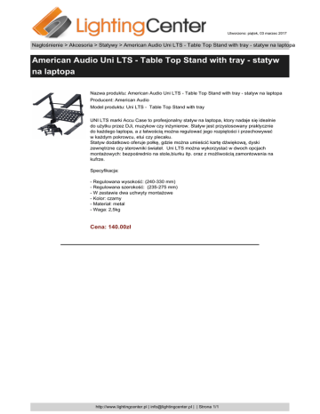 Utworzono: piątek, 03 marzec 2017 Nagłośnienie > Akcesoria > Statywy > American Audio Uni LTS - Table Top Stand with tray - statyw na laptopa American Audio Uni LTS - Table Top Stand with tray - statyw na laptopa Nazwa produktu: American Audio Uni LTS - Table Top Stand with tray - statyw na laptopa Producent: American Audio Model produktu: Uni LTS - Table Top Stand with tray UNI LTS marki Accu Case to profesjonalny statyw na laptopa, ktory nadaje się idealnie do użytku przez DJi, muzykow czy inżynierow. Statyw jest przystosowany praktycznie do każdego laptopa, a z łatwością można regulować jego rozpiętości i przechowywać w każdym pokrowcu, etui czy plecaku. Statyw dodatkowo oferuje połkę, gdzie można umieścić kartę dźwiękową, dyski zewnętrzne czy sterowniki świateł. Uni LTS można wykorzystać w dwoch opcjach montażowych: bezpośrednio na stole,biurku itp. oraz z możliwością zamontowania na kufrze. Specyfikacja: - Regulowana wysokość: (240-330 mm) - Regulowana szerokość: (235-275 mm) - W zestawie dwa uchwyty montażowe - Kolor: czarny - Materiał: metal - Waga: 2,5kg Cena: 140.00zł http://www.lightingcenter.pl | [email protected] | | Strona 1/1