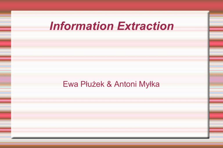 Information Extraction Ewa Płużek & Antoni Myłka Co to takiego? technologia bazująca na analizie języka naturalnego ekstrakcja usystematyzowanych i ustrukturalizowanych informacji z tekstów pisanych szczególny rodzaj Information Retrieval Information Retrieval Technologie IR dostarczają po prostu listę dokumentów w których występują zadane słowa. użytkownik sam musi analizować dokumenty Information Extraction Systemy IE z kolei potrafią wyłuskać odpowiednie informacje oraz przedstawić w jednym dokumencie, tylko i wyłącznie te fragmenty, które uznają za przydatne szukającemu. użytkownik analizuje tylko fakty Pradzieje Hans Peter Luhn “Key Words in Context” indexing 1958 - “A Business Intelligence System” Burzliwy rozwój TAUM-METEO (lata 60-te) – tłumaczenie raportów pogodowych ATRANS – ekstrakcja informacji z prostych wiadomości teleksowych o przelewach bankowych JASPER – ekstrakcja informacji o zarobkach z krótkich zdań SCISOR – ekstrakcja informacji z tekstów w internecie Message Understanding Conferences 7 konferencji lata 90-te sponsorowane przez DARPA konkurs systemów IE polegający na ekstrakcji informacji z zadanego korpusu tekstów systemy startowały w pięciu kategoriach Jak działają systemy Information Extraction Dla przykładu rozpatrzmy zdanie: The shiny red rocket was fired on Tuesday. It is the brainchild of Dr. Big Head. Dr. Big Head is a staff scientist at We Build Rockets Inc. Named Entity Recognition odkryje, że encjami są tu: “rocket”, “Tuesday”, “Dr. Big Head” “We Build Rockets Inc”. The shiny red rocket was fired on Tuesday. It is the brainchild of Dr. Big Head. Dr. Big Head is a staff scientist at We Build Rockets Inc. Coreference Resolution odkryje, że “it” odnosi się do encji “rocket” The shiny red rocket was fired on Tuesday. It is the brainchild of Dr. Big Head. Dr. Big Head is a staff scientist at We Build Rockets Inc. Template Element Construction odkryje, że określeniami encji “rocket” są: The shiny red rocket was fired on Tuesday. It is the brainchild of Dr. Big Head. Dr. Big Head is a staff scientist at We Build Rockets Inc. “shiny” “red” “brainchild of Dr. Big Head” Template Relation Construction odkryje, że: “Dr. Big Head” pracuje dla: “We Build Rockets Inc.” The shiny red rocket was fired on Tuesday. It is the brainchild of Dr. Big Head. Dr. Big Head is a staff scientist at We Build Rockets Inc. Scenario Template Production Dopasowuje wyniki TE i TR do wyspecyfikowanych scenariuszy zdarzeń. The shiny red rocket was fired on Tuesday. It is the brainchild of Dr. Big Head. Dr. Big Head is a staff scientist at We Build Rockets Inc. Jeżeli kazaliśmy mu szukać zdarzeń odpalenia rakiety to zwróci nam informacje z tej notatki. Podsumowanie Proces ekstrakcji informacji składa się z pięciu etapów: NE – Named Entity Recognition CO – Coreference Resolution TE – Template Element Construction TR – Template Relation Construction ST – Scenario Template Production Jak się tworzy systemy IE? Wprowadzanie wiedzy: Knowledge Engineering – wiedza wprowadzana przez eksperta w danej dziedzinie Learning Approach – system uczy się “sam” na podstawie ręcznie opisywanych dokumentów i interakcji z użytkownikiem Anatomia systemu IE Dwa najważniejsze elementy: Procesor tekstów Generator wzorców Procesor tekstów analiza leksykalna segmentacja tekstu (podział na zdania) interpretacja skrótów analiza podstaw słowotwórczych wychwytywanie z tekstu struktur istotnych z punktu widzenia dziedziny problemu Generator wzorców łączy wyniki działania procesora tekstów z wiedzą dziedzinową wyraża informacje z tekstu w formie pewnych wzorców Skuteczność systemów IE NE CO TE TR ST Współczesne systemy IE 95 % 50 – 60 % 80 % 75 % 60 % Człowiek < 100 % < 100 % 95 % < 100 % 80 % Zastosowania obszary, gdzie nie jest niezbędna informacja dokładna wyławianie wiedzy z dużego zbioru tekstów (np. sieci WWW) Analiza finansowa “Jak często w sieci pojawiają się wzmianki wskazujące na dobre prognozy nt. przyszłości firmy?” “Jak w ostatnim roku zmieniały się oczekiwania wobec firmy?” “Jak dużo opinii pozytywnych i negatywnych na temat nowego zarządu opublikowano w zeszłym roku?” Marketing Jak przyjmowany jest nasz program lojalnościowy? Jak duży odzew spowodowało wprowadzenie nowego produktu, czy faktycznie wywołało sensację? Czy potencjalna grupa docelowa komentuje na forach internetowych nowy produkt i jakie opinie przeważają? Public Relations “Podaj 12 najbardziej zjadliwych komentarzy na temat ostatniej wypowiedzi szefa, opublikowanych w prasie w ciągu ostatnich dwóch dni” “Jaką szkodę dla wizerunku przyniosła ostatnia afera, jaka grupa klientów najbardziej się nią przejęła?” Analiza Mediów “Jaka jest odległość medialna między nazwą naszej firmy a pojęciem 'XML'?” “Jaka jest linia polityczna gazety X?. Które partie są w niej częściej opisywane pozytywnie?” Narzędzia Darmowe, open source GATE + ANNIE (http://gate.ac.uk) MAGPIE (http://kmi.open.ac.uk/projects/magpie/) BADGER (http://www-nlp.cs.umass.edu/software/badger.html) Komercyjne KIM (www.ontotext.com/kim) SPSS (www.spss.com) General Architecture for Text Engineering tworzone w University of Sheffield środowisko do tworzenia aplikacji operujących na tekście, m. in. do ekstrakcji informacji zestaw wyspecjalizowanych komponentów, których można używać w różnych sytuacjach Tokeniser zamienia ciąg znaków wejściowych na tokeny: słowa, liczby, znaki przestankowe symbole białe znaki Gazeteer przechowuje listy wyrazów, zazwyczaj nazw własnych (miast, organizacji, walut) wykrywa wystąpienia tych wyrazów w przetwarzanym tekście i odpowiednio je oznacza Sentence Splitter dzieli ciąg wejściowy na poszczególne zdania potrafi odróżnić kropkę występującą po jakimś skrócie od kropki kończącej zdanie. Par