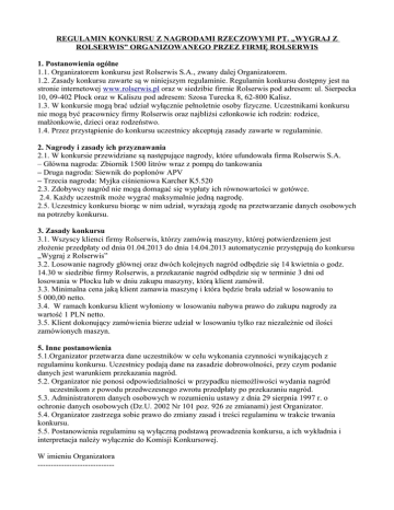 REGULAMIN KONKURSU Z NAGRODAMI RZECZOWYMI PT. „WYGRAJ Z ROLSERWIS” ORGANIZOWANEGO PRZEZ FIRMĘ ROLSERWIS 1. Postanowienia ogólne 1.1. Organizatorem konkursu jest Rolserwis S.A., zwany dalej Organizatorem. 1.2. Zasady konkursu zawarte są w niniejszym regulaminie. Regulamin konkursu dostępny jest na stronie internetowej www.rolserwis.pl oraz w siedzibie firmie Rolserwis pod adresem: ul. Sierpecka 10, 09-402 Płock oraz w Kaliszu pod adresem: Szosa Turecka 8, 62-800 Kalisz. 1.3. W konkursie mogą brać udział wyłącznie pełnoletnie osoby fizyczne. Uczestnikami konkursu nie mogą być pracownicy firmy Rolserwis oraz najbliżsi członkowie ich rodzin: rodzice, małżonkowie, dzieci oraz rodzeństwo. 1.4. Przez przystąpienie do konkursu uczestnicy akceptują zasady zawarte w regulaminie. 2. Nagrody i zasady ich przyznawania 2.1. W konkursie przewidziane są następujące nagrody, które ufundowała firma Rolserwis S.A. – Główna nagroda: Zbiornik 1500 litrów wraz z pompą do tankowania – Druga nagroda: Siewnik do poplonów APV – Trzecia nagroda: Myjka ciśnieniowa Karcher K5.520 2.3. Zdobywcy nagród nie mogą domagać się wypłaty ich równowartości w gotówce. 2.4. Każdy uczestnik może wygrać maksymalnie jedną nagrodę. 2.5. Uczestnicy konkursu biorąc w nim udział, wyrażają zgodę na przetwarzanie danych osobowych na potrzeby konkursu. 3. Zasady konkursu 3.1. Wszyscy klienci firmy Rolserwis, którzy zamówią maszyny, której potwierdzeniem jest złożenie przedpłaty od dnia 01.04.2013 do dnia 14.04.2013 automatycznie przystępują do konkursu „Wygraj z Rolserwis” 3.2. Losowanie nagrody głównej oraz dwóch kolejnych nagród odbędzie się 14 kwietnia o godz. 14.30 w siedzibie firmy Rolserwis, a przekazanie nagród odbędzie się w terminie 3 dni od losowania w Płocku lub w dniu zakupu maszyny, którą klient zamówił. 3.3. Minimalna cena jaką klient zamawia maszynę i która będzie brała udział w losowaniu to 5 000,00 netto. 3.4. W ramach konkursu klient wyłoniony w losowaniu nabywa prawo do zakupu nagrody za wartość 1 PLN netto. 3.5. Klient dokonujący zamówienia bierze udział w losowaniu tylko raz niezależnie od ilości zamówionych maszyn. 5. Inne postanowienia 5.1.Organizator przetwarza dane uczestników w celu wykonania czynności wynikających z regulaminu konkursu. Uczestnicy podają dane na zasadzie dobrowolności, przy czym podanie danych jest warunkiem przekazania nagród. 5.2. Organizator nie ponosi odpowiedzialności w przypadku niemożliwości wydania nagród uczestnikom z powodu przedwczesnego zwrotu przedpłaty po przekazaniu nagród. 5.3. Administratorem danych osobowych w rozumieniu ustawy z dnia 29 sierpnia 1997 r. o ochronie danych osobowych (Dz.U. 2002 Nr 101 poz. 926 ze zmianami) jest Organizator. 5.4. Organizator zastrzega sobie prawo do zmiany zasad i treści regulaminu w trakcie trwania konkursu. 5.5. Postanowienia regulaminu są wyłączną podstawą prowadzenia konkursu, a ich wykładnia i interpretacja należy wyłącznie do Komisji Konkursowej. W imieniu Organizatora -----------------------------