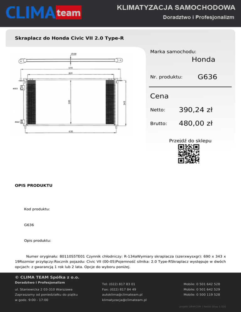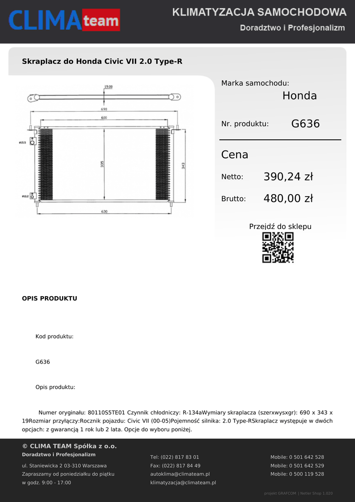 Skraplacz do Honda Civic VII 2.0 Type-R Marka samochodu: Honda Nr. produktu: G636 Cena Netto: 390,24 zł Brutto: 480,00 zł Przejdź do sklepu OPIS PRODUKTU Kod produktu: G636 Opis produktu: Numer oryginału: 80110S5TE01 Czynnik chłodniczy: R-134aWymiary skraplacza (szerxwysxgr): 690 x 343 x 19Rozmiar przyłączy:Rocznik pojazdu: Civic VII (00-05)Pojemność silnika: 2.0 Type-RSkraplacz występuje w dwóch opcjach: z gwarancją 1 rok lub 2 lata. Opcje do wyboru poniżej. © CLIMA TEAM Spółka z o.o. Doradztwo i Profesjonalizm Tel: (022) 817 83 01 Mobile: 0 501 642 528 ul. Staniewicka 2 03-310 Warszawa Fax: (022) 817 84 49 Mobile: 0 501 642 529 Zapraszamy od poniedziałku do piątku [email protected] Mobile: 0 500 119 528 w godz. 9:00 - 17:00 [email protected] projekt GRAFCOM | Netler Shop 1.020 © CLIMA TEAM Spółka z o.o. Doradztwo i Profesjonalizm Tel: (022) 817 83 01 Mobile: 0 501 642 528 ul. Staniewicka 2 03-310 Warszawa Fax: (022) 817 84 49 Mobile: 0 501 642 529 Zapraszamy od poniedziałku do piątku [email protected] Mobile: 0 500 119 528 w godz. 9:00 - 17:00 [email protected] projekt GRAFCOM | Netler Shop 1.020