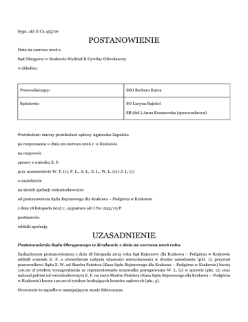 Sygn. akt II Ca 455/16 POSTANOWIENIE Dnia 22 czerwca 2016 r. Sąd Okręgowy w Krakowie Wydział II Cywilny Odwoławczy w składzie: Przewodniczący: SSO Barbara Kursa Sędziowie: SO Lucyna Rajchel SR (del.) Anna Kruszewska (sprawozdawca) Protokolant: starszy protokolant sądowy Agnieszka Zapalska po rozpoznaniu w dniu 22 czerwca 2016 r. w Krakowie na rozprawie sprawy z wniosku E. F. przy uczestnictwie W. F. (1), P. L., A. L., Z. L., W. L. (1) i J. L. (1) o zasiedzenie na skutek apelacji wnioskodawczyni od postanowienia Sądu Rejonowego dla Krakowa – Podgórza w Krakowie z dnia 18 listopada 2015 r., sygnatura akt I Ns 1233/12/P postanawia: oddalić apelację. UZASADNIENIE Postanowienia Sądu Okręgowego w Krakowie z dnia 22 czerwca 2016 roku Zaskarżonym postanowieniem z dnia 18 listopada 2015 roku Sąd Rejonowy dla Krakowa – Podgórza w Krakowie oddalił wniosek E. F. o stwierdzenie nabycia własności nieruchomości w drodze zasiedzenia (pkt. 1), przyznał pracownikowi Sądu Z. W. od Skarbu Państwa (Kasa Sądu Rejonowego dla Krakowa – Podgórza w Krakowie) kwotę 120,00 zł tytułem wynagrodzenia za reprezentowanie uczestnika postępowania W. L. (1) w sprawie (pkt. 2); oraz nakazał pobrać od wnioskodawczyni E. F. na rzecz Skarbu Państwa (Kasa Sądu Rejonowego dla Krakowa – Podgórza w Krakowie) kwotę 120,00 zł tytułem brakujących kosztów sądowych (pkt. 3). Orzeczenie to zapadło w następującym stanie faktycznym: Umową kupna – sprzedaży zawartą w dniu 28.09.1928 r. F. l.i R. z P. L. nabyli po ½ części własność nieruchomości objętej wykazem hipotecznym (...) K. – Ł. stanowiącą parcelę l kat. (...) – pastwisko. Parcela nr (...) stanowi obecnie działkę oznaczona numerem geodezyjnym (...) położoną w obrębie (...) P., jednostce ewidencyjnej (...) . F. i R. L. zamieszkalni na przedmiotowej nieruchomości i mieszkali tam aż do swojej śmierci. F. L. zmarł w dniu (...) r., a R. L. w dniu (...) r. F. i R. L. mieli troje dzieci: J. L. (2), W. L. (2) i M. B.. Po śmierci R. L. E. F. chcąc zamieszkać na nieruchomości przy ul. (...) rozpoczęła rozmowy ze swoimi wujkami – W. L. (2) i J. L. (2) oraz ze swoją matką M. B. w przedmiocie wyrażenia przez nich zgody na zamieszkanie na nieruchomości. Rodzeństwo wyraziło zgodę na zamieszkanie E. F. z rodziną z uwagi na konieczność udzielenia jej pomocy w sytuacji braku zaspokojenia potrzeb mieszkaniowych. E. F. w zamian za możliwość zamieszkania na nieruchomości miała również zająć się przeprowadzeniem spraw spadkowych po dziadkach. Po wyrażeniu przez nich zgody na zajęcie mieszkania w domu E. F. uzgodniła z wujkiem W. L. (2), że to ona będzie opłacała należności podatkowe, gdyż wujek miał niską emeryturę. E. F. po uzyskaniu zgody wujków i matki zamieszkała na nieruchomości przy ul. (...) w 1981 r. – wraz ze swoim mężem W. F. (2). W domu tym mieszkał wówczas wujek E. W. L., który zajmował połowę domu. Druga połowę zajęła rodzina E. F.. Rodziny mieszkające na nieruchomości przy ul. (...) żyły w zgodzie. W czasie wspólnego zamieszkiwania na nieruchomości przy ul. (...) wykonywali remonty, modernizacje i wprowadzali ulepszenia. Wszystkie ważniejsze prace w tym – wykonanie kanalizacji, doprowadzenie wody, posadowienie ogrodzenia, zburzenie wychodka były uzgadniane z W. L. (2) i z M. B., a po śmierci W. L. (2) takie prace jak wymiana dachu, wymiana okien była przez małżonków F. uzgadniana już z samą M. B. Okoliczni mieszkańcy za współwłaścicieli nieruchomości uważali dzieci R. i F. M. B., W. L. (2) i J. L. (2). E. F. jest zameldowana w K. przy ul. (...) od dnia 11.06.1981r. J. L. (2) zmarł w dniu (...) r. W. L. (2) zmarł w dniu (...) r. Po śmierci W. E. i W. F. (2) zajęli część domu uprzednio przez niego zajmowaną i ją zagospodarowali urządzając tam pokoje dla córki i gościnny. M. B. zmarła w dniu (...) r. E. F. opłacała należności za ubezpieczenie budynku mieszkalnego w latach: 1994-1998, zaś w latach 1994-1996, 2004-2010 opłacała należności podatkowe. W oparciu o tak ustalony stan faktyczny Sąd Rejonowy uznał, że wniosek wnioskodawczyni nie zasługiwał na uwzględnienie, bowiem uczestnicy postępowania przedstawili dowody świadczące o obaleniu domniemania samoistności jej posiadania w zakresie spornej nieruchomości. W ustalonym stanie faktycznym zdarzeniem stanowiącym źródło nabycia posiadania było wprowadzenie się E. F. wraz z mężem do zwolnionego mieszkania na nieruchomości przy ulicy (...) po wyrażeniu zgody przez jej wujków W. L. (2), J. L. (2) i jej matkę M. B.. Wprowadzając się w 1981 roku na rzeczoną nieruchomość wnioskodawczyni nie objęła jej całości we władanie, bowiem nieruchomość tę do swojej śmierci w roku 1993 zamieszkiwał także W. L. (2). Z nim też, jak również z M. B. wnioskodawczyni uzgadniała kwestię wykonania potrzebnych remontów i modernizacji, które następnie wraz z mężem przeprowadzała. Miała zatem nie tylko całkowitą świadomość istnienia po ich stronie tytułu własności do nieruchomości, ale również liczyła się z ich zdaniem jako właścicieli i czuła potrzebę poinformowania ich o ważniejszych działaniach dotyczących nieruchomości. Z powyższego wynikał zatem według Sądu Rejonowego brak po stronie wnioskodawczyni wewnętrznego przekonania samoistności posiadania i pełnego władztwa nieruchomością i nie mógł zmienić tego nawet fakt ponoszenia kosztów modernizacji nieruchomości oraz ponoszenia opłat podatkowych i innych z nieruchomością związanych. Skoro bowiem wnioskodawczyni zamieszkała na tej nieruchomości nieodpłatnie, korzystając z dobrej woli rodziny, to też naturalnym było ponoszenie przez nią takich kosztów. Co więcej, wnioskodawczyni sama wskazała, że wujek W. L. (2) nie przyczyniał się finansowo do ulepszania i modernizacji nieruchomości, nie opłacał również podatków, a to z tego powo