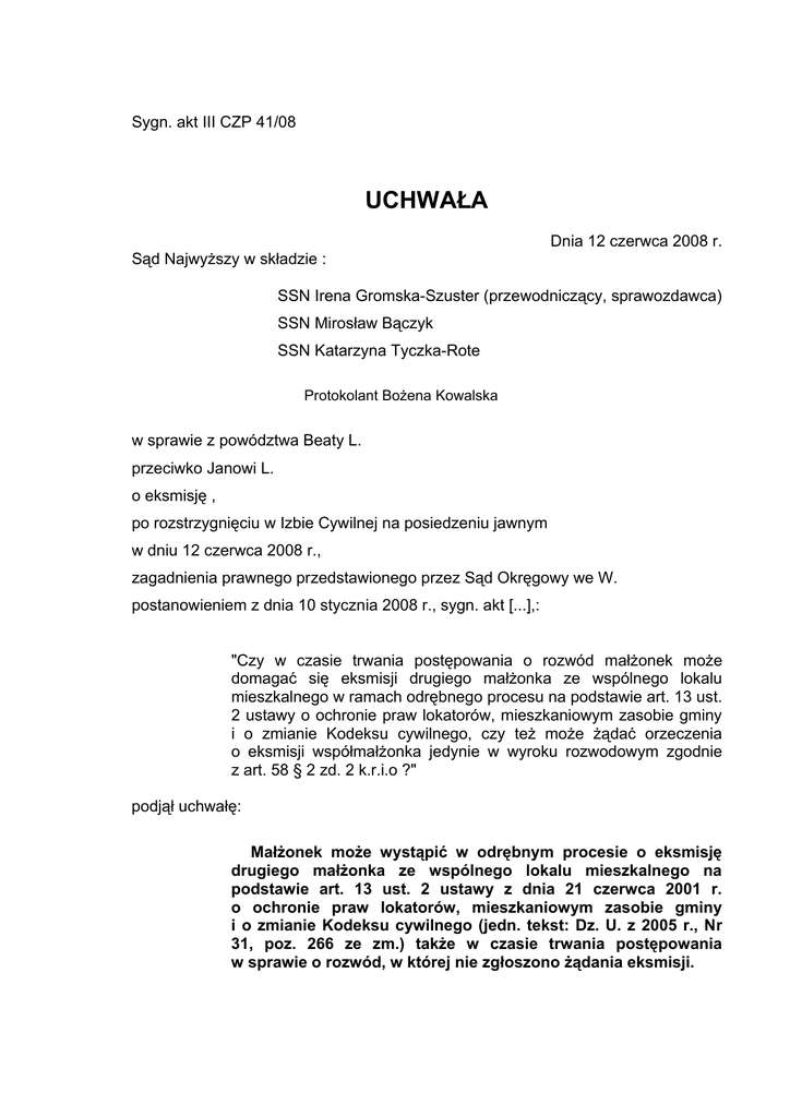 Sygn. akt III CZP 41/08 UCHWAŁA Dnia 12 czerwca 2008 r. Sąd Najwyższy w składzie : SSN Irena Gromska-Szuster (przewodniczący, sprawozdawca) SSN Mirosław Bączyk SSN Katarzyna Tyczka-Rote Protokolant Bożena Kowalska w sprawie z powództwa Beaty L. przeciwko Janowi L. o eksmisję , po rozstrzygnięciu w Izbie Cywilnej na posiedzeniu jawnym w dniu 12 czerwca 2008 r., zagadnienia prawnego przedstawionego przez Sąd Okręgowy we W. postanowieniem z dnia 10 stycznia 2008 r., sygn. akt [...],: "Czy w czasie trwania postępowania o rozwód małżonek może domagać się eksmisji drugiego małżonka ze wspólnego lokalu mieszkalnego w ramach odrębnego procesu na podstawie art. 13 ust. 2 ustawy o ochronie praw lokatorów, mieszkaniowym zasobie gminy i o zmianie Kodeksu cywilnego, czy też może żądać orzeczenia o eksmisji współmałżonka jedynie w wyroku rozwodowym zgodnie z art. 58 § 2 zd. 2 k.r.i.o ?" podjął uchwałę: Małżonek może wystąpić w odrębnym procesie o eksmisję drugiego małżonka ze wspólnego lokalu mieszkalnego na podstawie art. 13 ust. 2 ustawy z dnia 21 czerwca 2001 r. o ochronie praw lokatorów, mieszkaniowym zasobie gminy i o zmianie Kodeksu cywilnego (jedn. tekst: Dz. U. z 2005 r., Nr 31, poz. 266 ze zm.) także w czasie trwania postępowania w sprawie o rozwód, w której nie zgłoszono żądania eksmisji. 2 Uzasadnienie Przedstawione Sądowi Najwyższemu do rozstrzygnięcia zagadnienie prawne powstało w sprawie o eksmisję, przy rozpoznawaniu przez Sąd Okręgowy we W. apelacji pozwanego od wyroku Sądu pierwszej instancji nakazującego pozwanemu Janowi L. opróżnienie, opuszczenie i wydanie powódce Beacie L. bliżej opisanego w sentencji wyroku lokalu mieszkalnego oraz ustalającego, że pozwanemu nie przysługuje prawo do lokalu socjalnego. W sprawie ustalone zostało między innymi, że powódka i pozwany pozostają w związku małżeńskim, w czasie którego uzyskali spółdzielcze lokatorskie prawo do spornego lokalu, w którym wraz z nimi mieszkała ich córka, zięć i wnuk. Od 2000 r. stosunki stron pogorszyły się, pozwany zaczął podejrzewać powódkę o zdrady, ubliżał jej, nie akceptował pracy i wyjść z domu. W październiku 2000 r. podczas nieobecności żony, córki, zięcia i wnuka, usunął z mieszkania rzeczy powódki i zamknął na klucz wspólną sypialnię. Po tym incydencie powódka, córka, zięć i wnuk wyprowadzili się ze spornego lokalu. Powódka w tym samym dniu 9 maja 2007 r. wytoczyła powództwo o eksmisję męża na podstawie art. 13 ust. 2 ustawy z dnia 21 czerwca 2001 r. o ochronie praw lokatorów, mieszkaniowym zasobie gminy i o zmianie Kodeksu cywilnego (jedn. tekst: Dz. U. z 2005 r., Nr 31, poz. 266 ze zm.- dalej: „u.o.p.l.”) oraz powództwo o rozwód. Sprawa rozwodowa jest w toku. W tym stanie faktycznym Sąd Okręgowy powziął poważne wątpliwości, czy dopuszczalne jest wytoczenie przez małżonka powództwa o eksmisję drugiego małżonka ze wspólnego lokalu mieszkalnego na podstawie art. 13 ust. 2 u.o.p.l. w czasie trwania postępowania o rozwód, czy też w takiej sytuacji małżonek może żądać eksmisji tylko na podstawie art. 58 § 2 zd. 2 k.r.o. Sąd Najwyższy zważył, co następuje: Jak słusznie zauważył Sąd Okręgowy, oba wskazane wyżej przepisy zawierają regulację prawną o różnym zakresie przedmiotowym i podmiotowym, choć przesłanki orzeczenia eksmisji są podobne. Przepis art. 58 § 2 k.r.o. zdanie drugie, w związku z § 1 k.r.o. stanowi, że jeżeli małżonkowie zajmują wspólne mieszkanie, sąd w wyroku orzekającym rozwód może, w wypadkach wyjątkowych, 3 gdy jeden z małżonków swym rażąco nagannym postępowaniem uniemożliwia wspólne zamieszkiwanie, orzec jego eksmisję na żądanie drugiego małżonka. Natomiast zgodnie z art. 13 ust. 2 u.o.p.l., współlokator może wytoczyć powództwo o nakazanie przez sąd eksmisji małżonka, rozwiedzionego małżonka lub innego współlokatora tego samego lokalu, jeżeli ten swoim rażąco nagannym postępowaniem uniemożliwia wspólne zamieszkiwanie. Nie ulega wątpliwości, że zakres podmiotowy art. 13 ust. 2 u.o.p.l. jest znacznie szerszy, niż art. 58 § 2 zd. drugie k.r.o., który ma zastosowanie tylko w sprawie o rozwód i jedynie w razie jego orzeczenia, a więc obejmuje tylko roszczenie o eksmisję jednego małżonka przeciwko drugiemu, które może być uwzględnione jedyne w razie orzeczenia rozwodu i tylko w odniesieniu do współmałżonka. Orzeczenia eksmisji na podstawie art. 13 ust. 2 u.o.p.l. może natomiast żądać zarówno małżonek, jak i rozwiedziony małżonek i żądaniem tym możne objąć, poza małżonkiem lub byłym małżonkiem, inne osoby z nim mieszkające. Także zakresy przedmiotowe obu przepisów są różne, bowiem art. 13 ust. 2 u.o.p.l. ma zastosowanie jedynie do takich lokali, które małżonkowie zajmują wspólnie jako lokatorzy w rozumieniu art. 2 ust. 1 pkt 1 u.o.p.l., a więc używają lokalu jako najemcy lub na podstawie tytułu prawnego innego niż prawo własności, podczas gdy art. 58 § 2 zd. drugie k.r.o. ma zastosowanie do każdego lokalu zajmowanego przez małżonków na podstawie jakiegokolwiek tytułu prawnego lub nawet bez tytułu prawnego. Jedynym ograniczeniem mogą tu być inne regulacje prawne, które uniemożliwiają orzeczenie eksmisji małżonka ze wspólnie zajmowanego mieszkania, do którego prawo przysługuje wyłącznie jemu (na przykład z mieszkania będącego jego majątkiem osobistym lub przydzielonego mu z racji pełnionej funkcji). Nie są także identyczne przesłanki uzasadniające orzeczenie eksmisji, choć niewątpliwie są podobne. W obu przepisach podstawą eksmisji jest rażąco naganne postępowanie współmałżonka uniemożliwiające wspólne zamieszkiwanie, jednak eksmisja na podstawie art. 58 § 2 zd. drugie k.r.o. może być orzeczona tylko w „wypadkach wyjątkowych”. W doktrynie i orzecznictwie podkreśla się wyjątkowy charakt